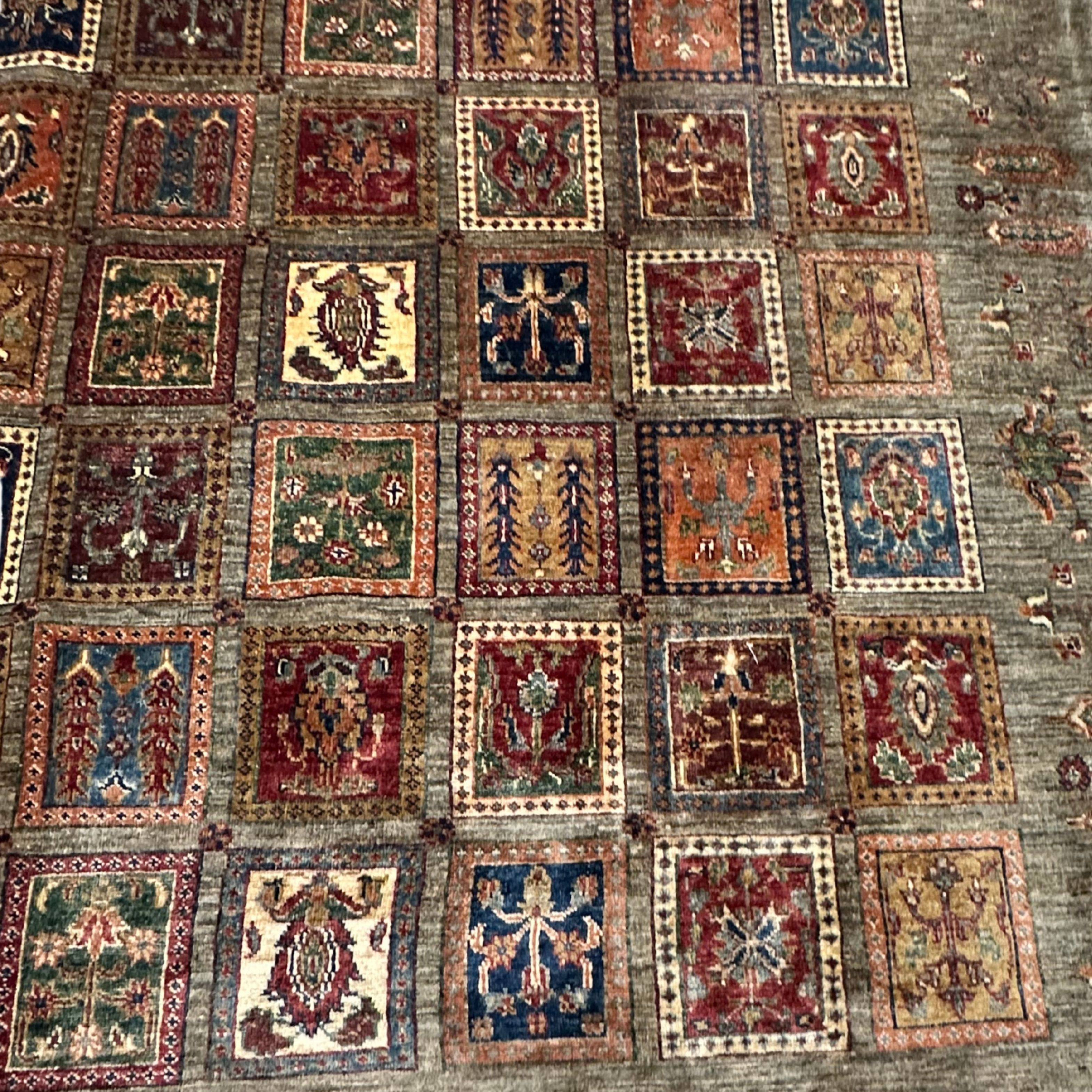 It was girded in Persian Gabbeh and Turkoman tribal weaves traditions and is handwoven by Ayna carpet weavers in northern Afghanistan. It is using centuries of pastoral motives and agricultural designs that are intended to induce harmony, shelter, and the cycle of nature with flamboyant symbolism and systematic structure.