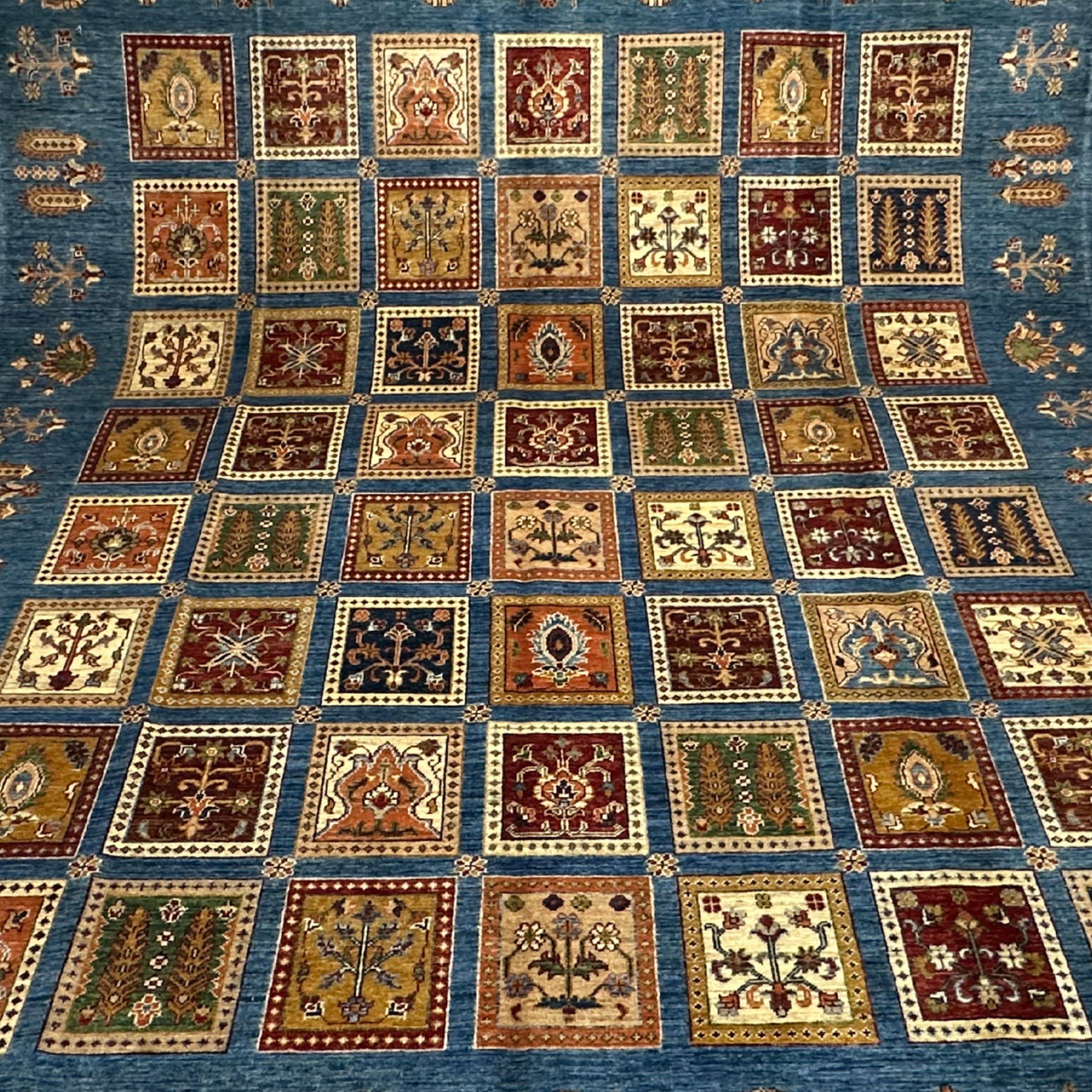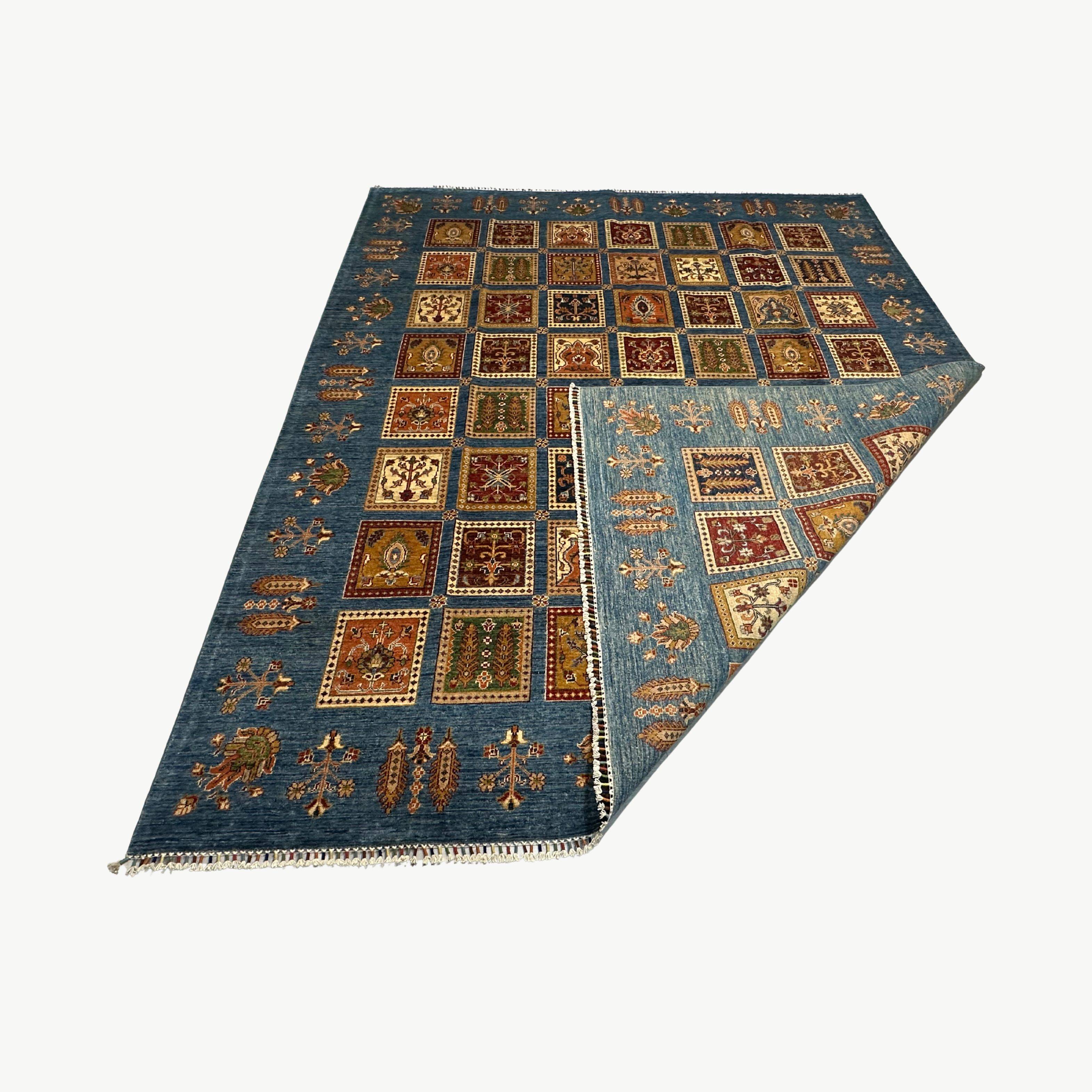 This carpet draws on the background of the ancient tradition of Gabbeh and garden culture in the southwestern part of Persia in Central Asia. Hand-woven by Ayna artisans in the northern region of Afghanistan, it is a modern recreation of the historic panel-style pattern design with tribal motives that comprises spiritual equilibrium and harmony of nature, as well as agriculture, through the gossamer detail and thought-provoking symmetry.