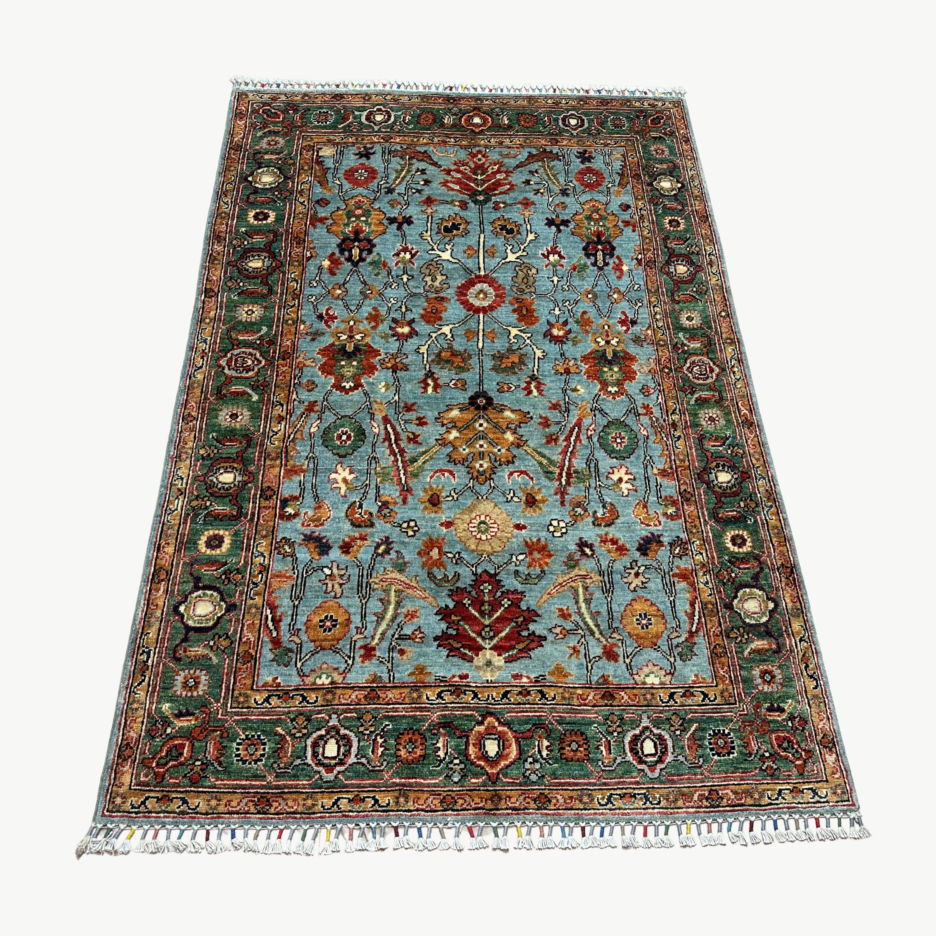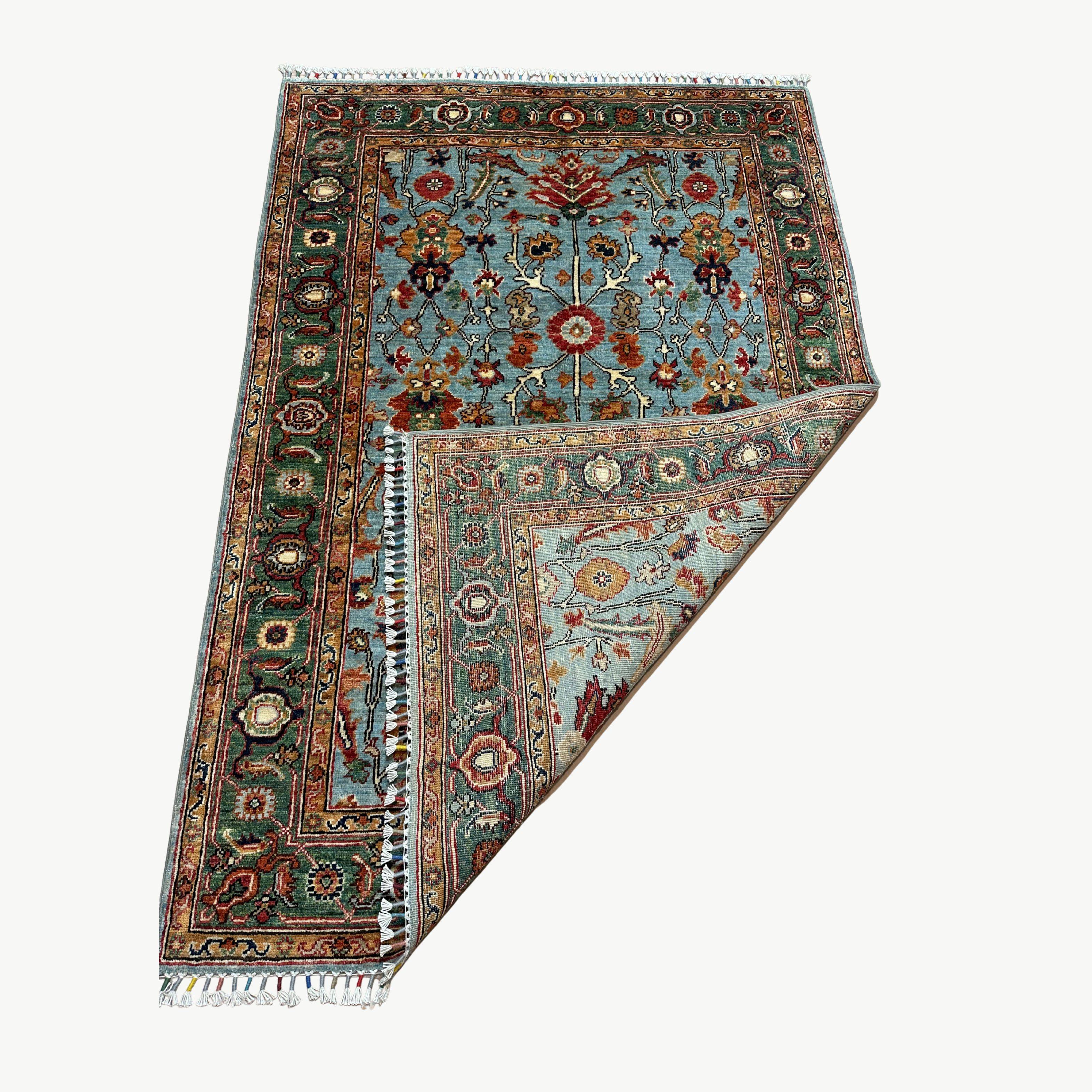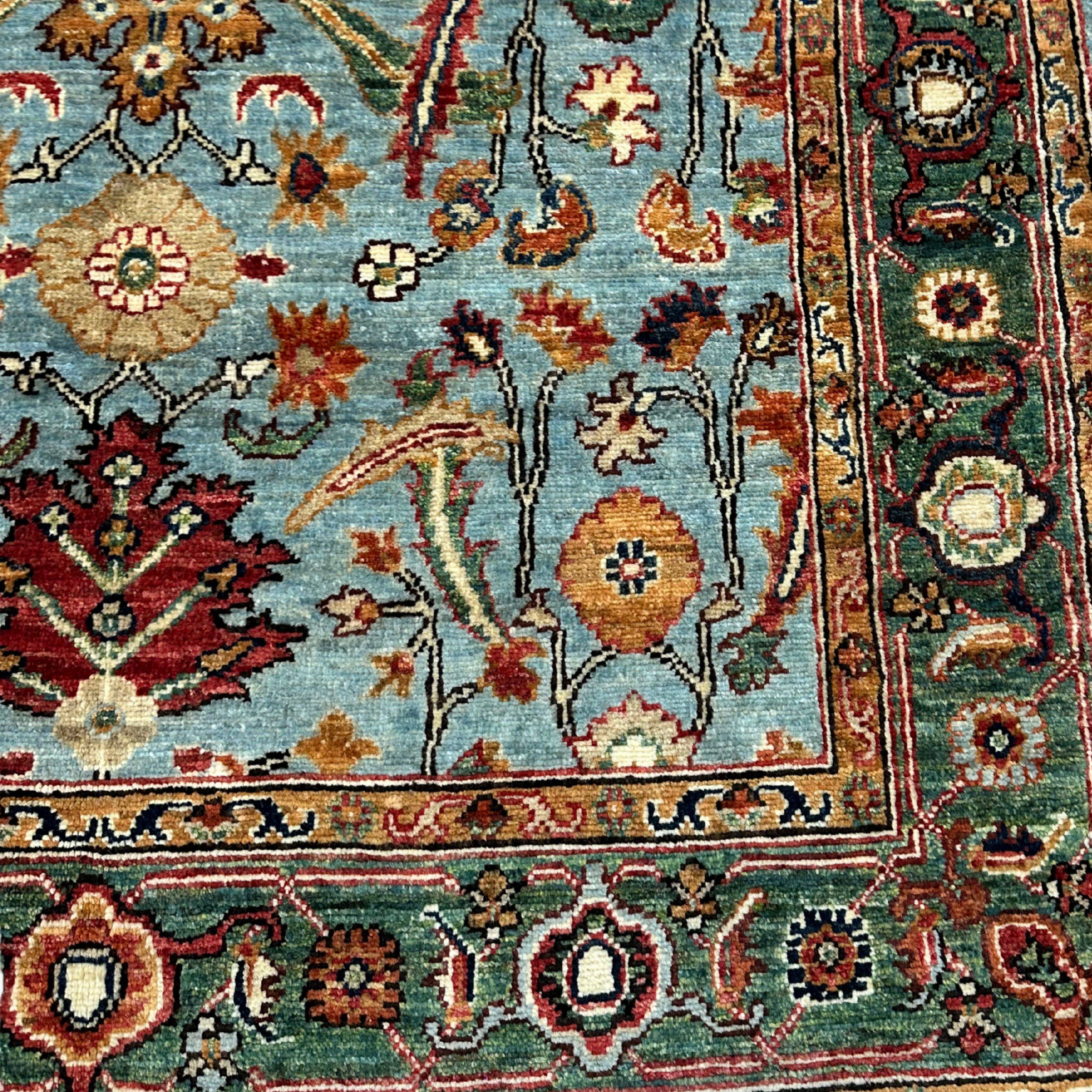 This is a hand knotted Afghan Ziegler rug that has a calm powder blue ground pattern with classical floral designs and scrolling vines. A rich emerald green border brings out definitions and depth. High quality and palatable furniture that delivers sophisticated and multipurpose items that complement vintage, traditional, or eclectic settings.