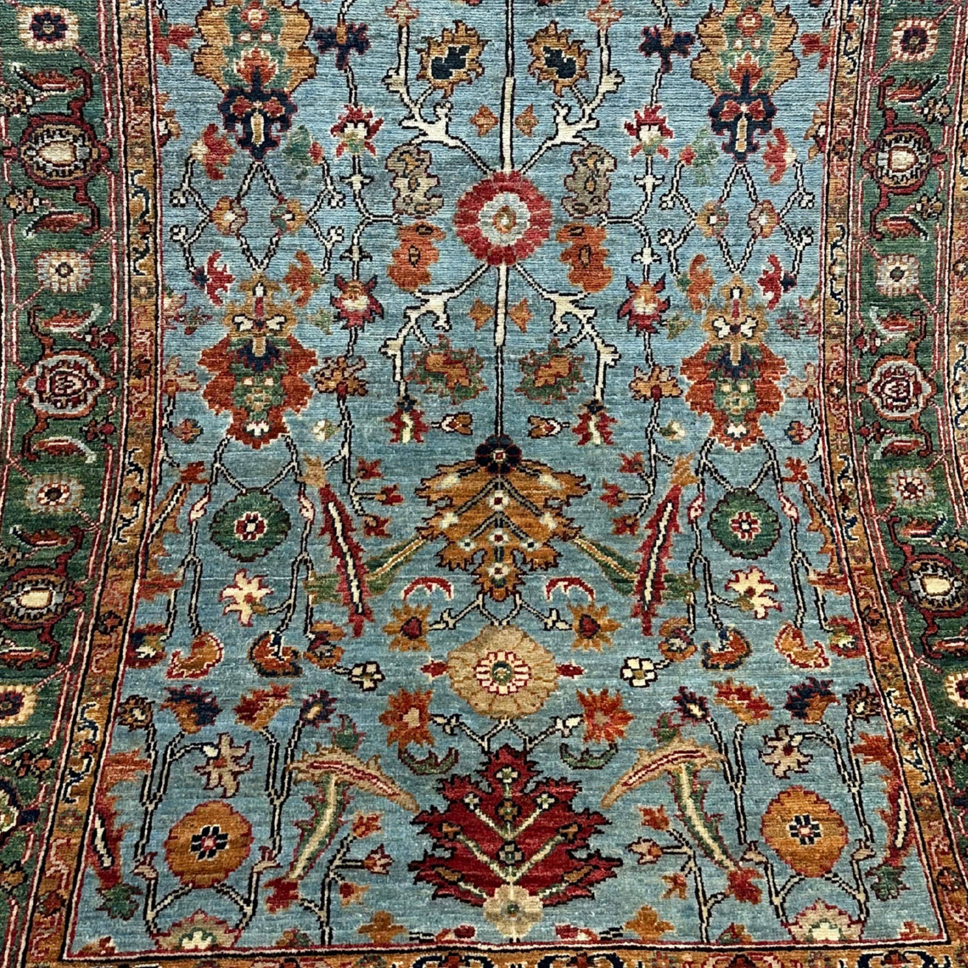 This Ziegler design has a field of powder blue with exuberant floral sprays, rosettes, and boteh decorations. The organized design extends out of the outer force into a decorative emerald green frame, illustrated with cartouches and stylized flowers. The neutral color scheme is rather luxurious and earthy at the same time and can be applied to both light and dark interiors.
