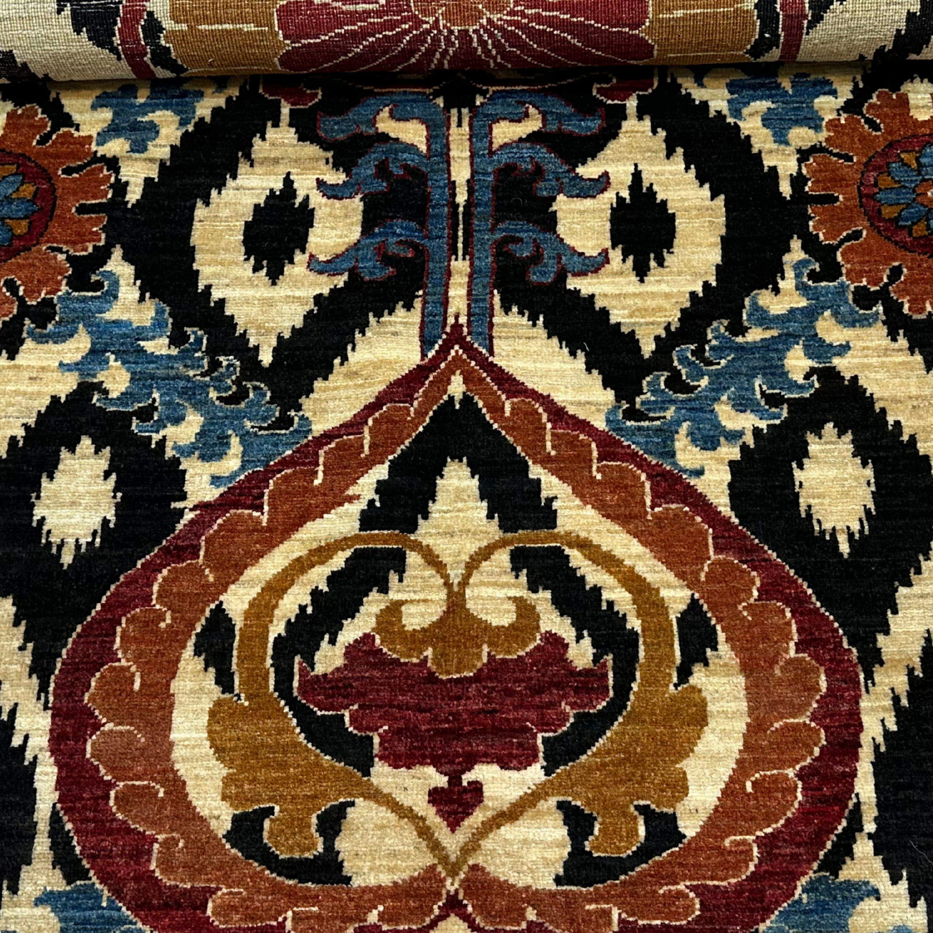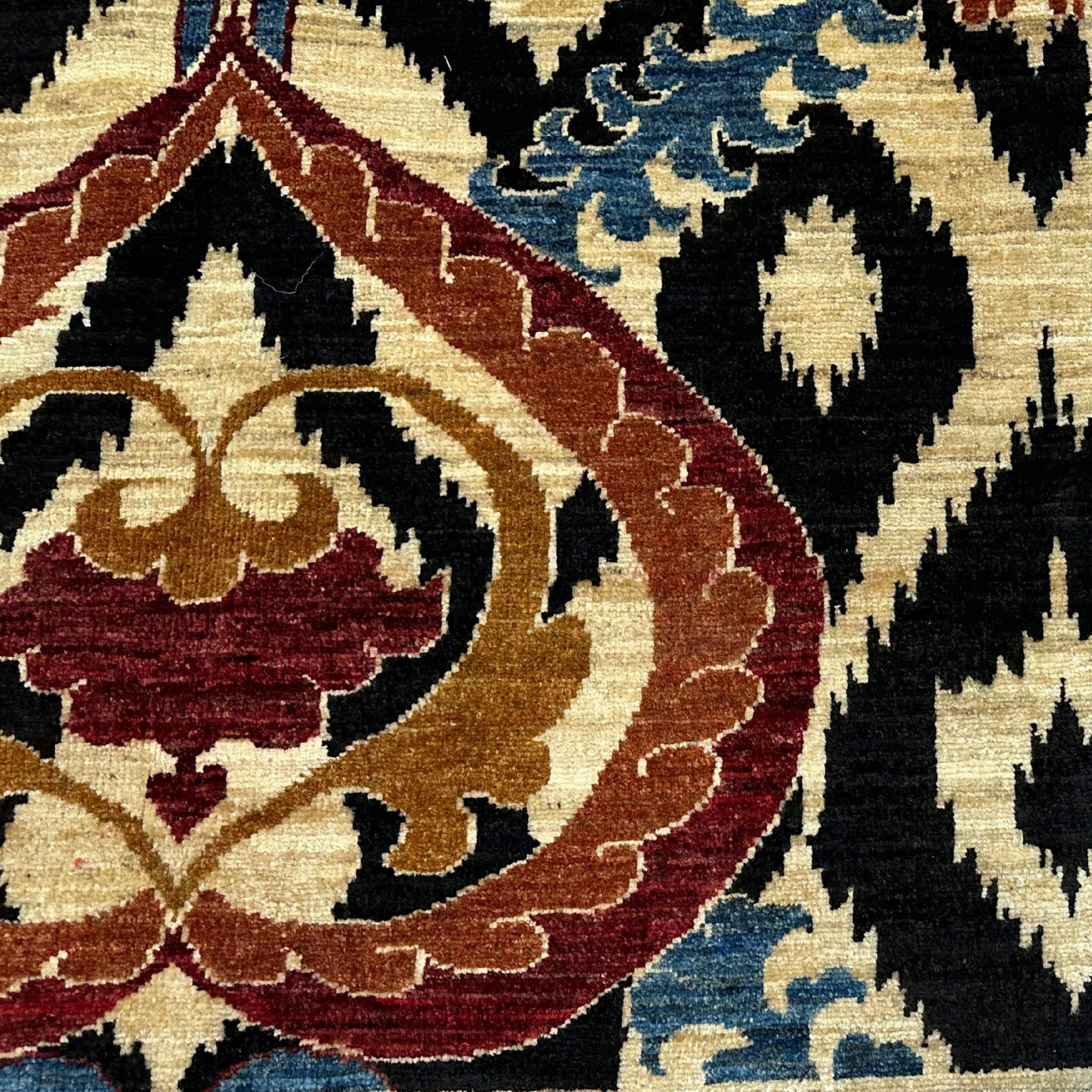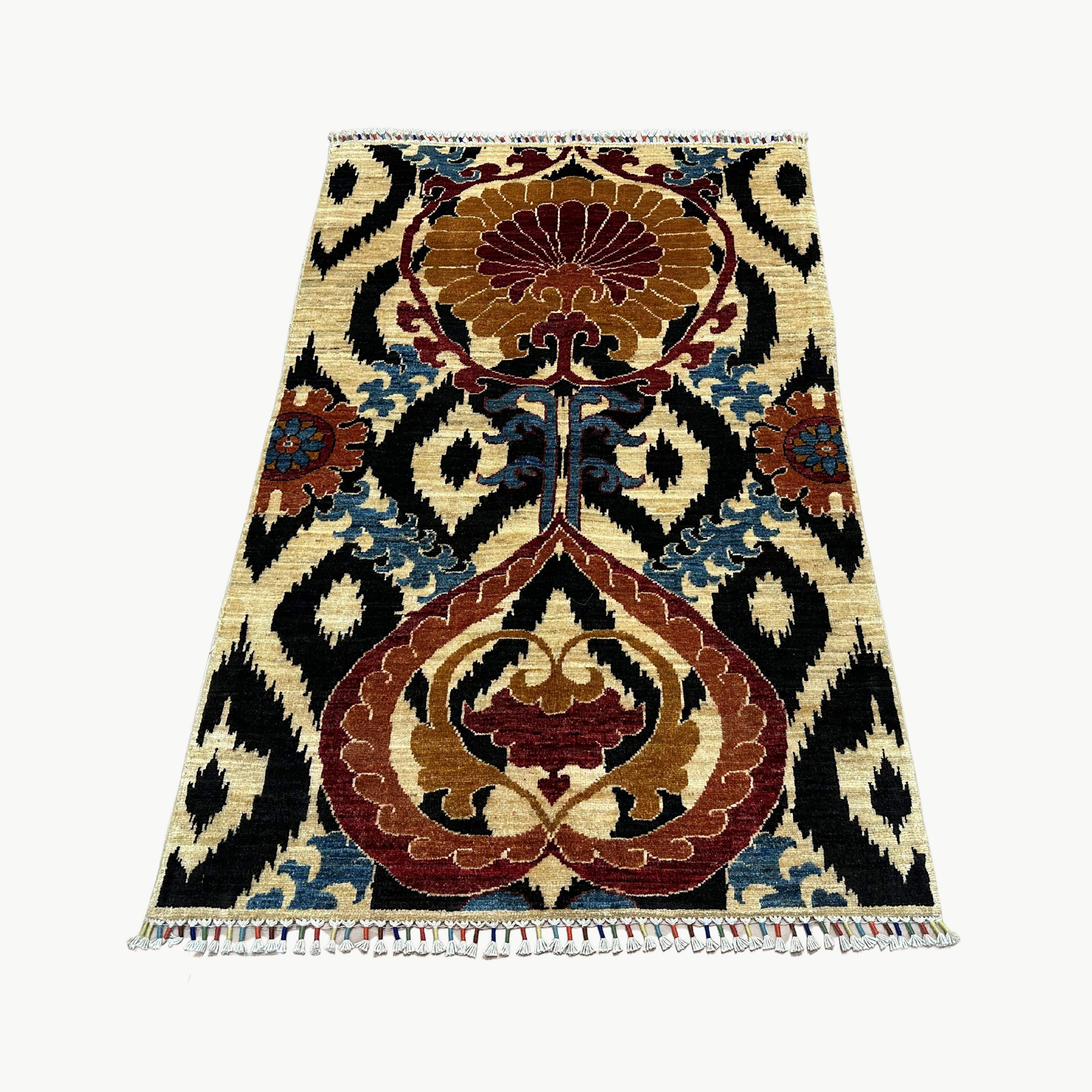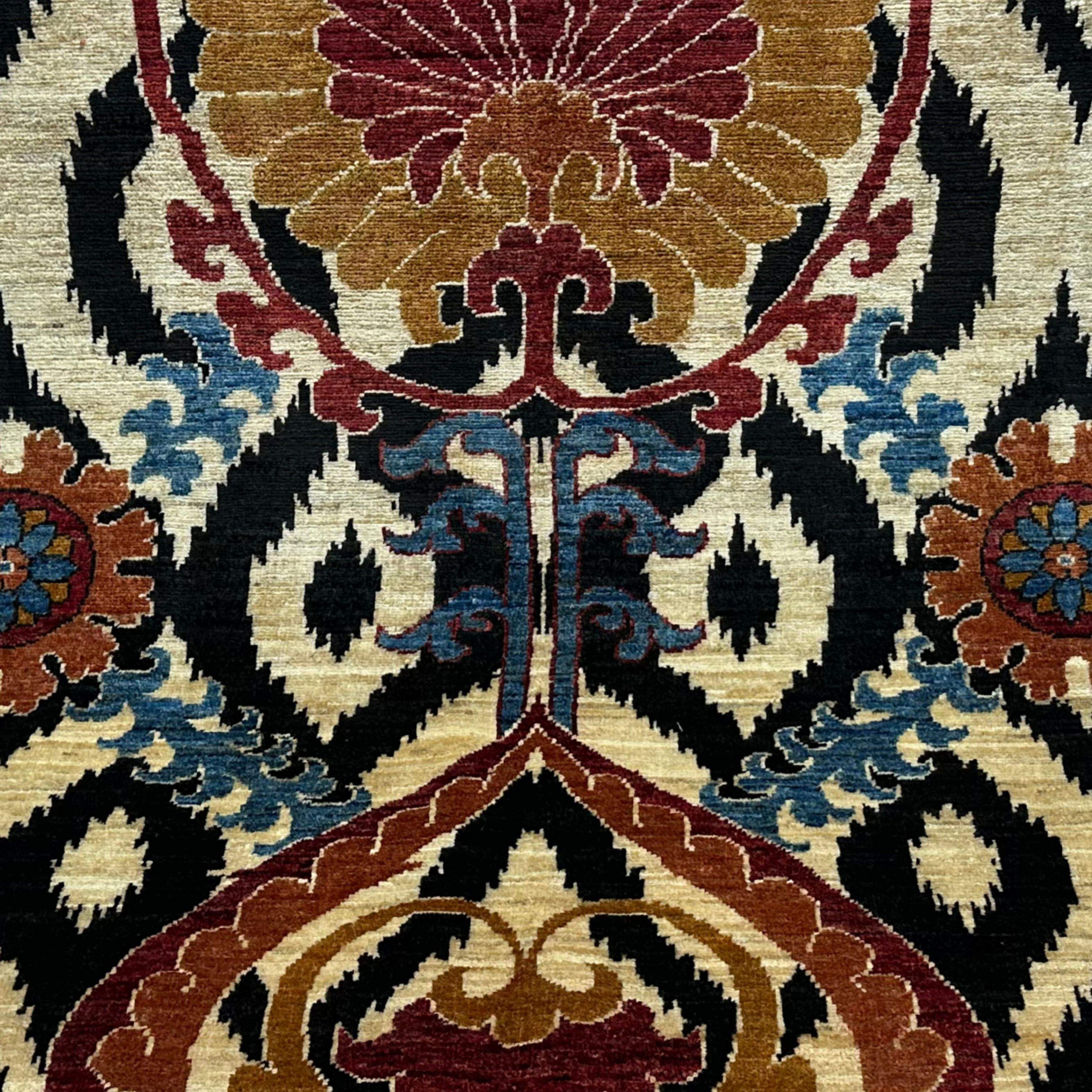 The symmetrical pattern is surrounded by two outstanding floral medallions and is composed of black and ivory striped ikat-style ground. The trend combines modern-day Central Asian patterns with vivid shades of play, thus resulting in a colourful, creative focal point of the small rooms.