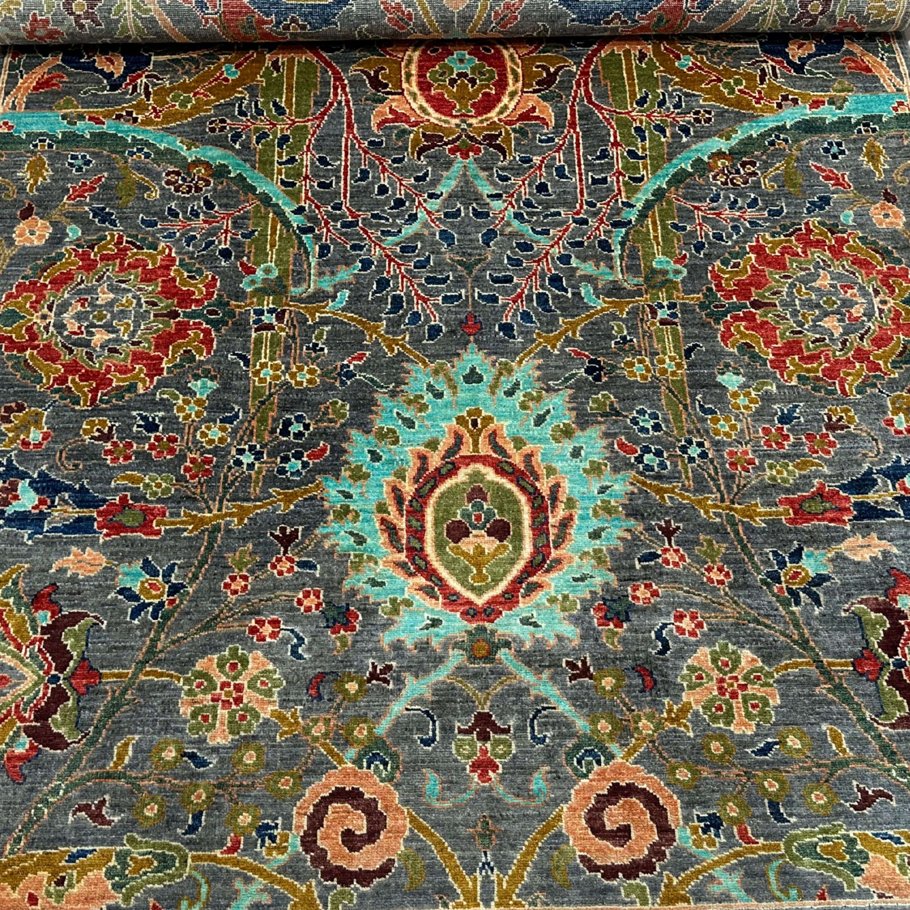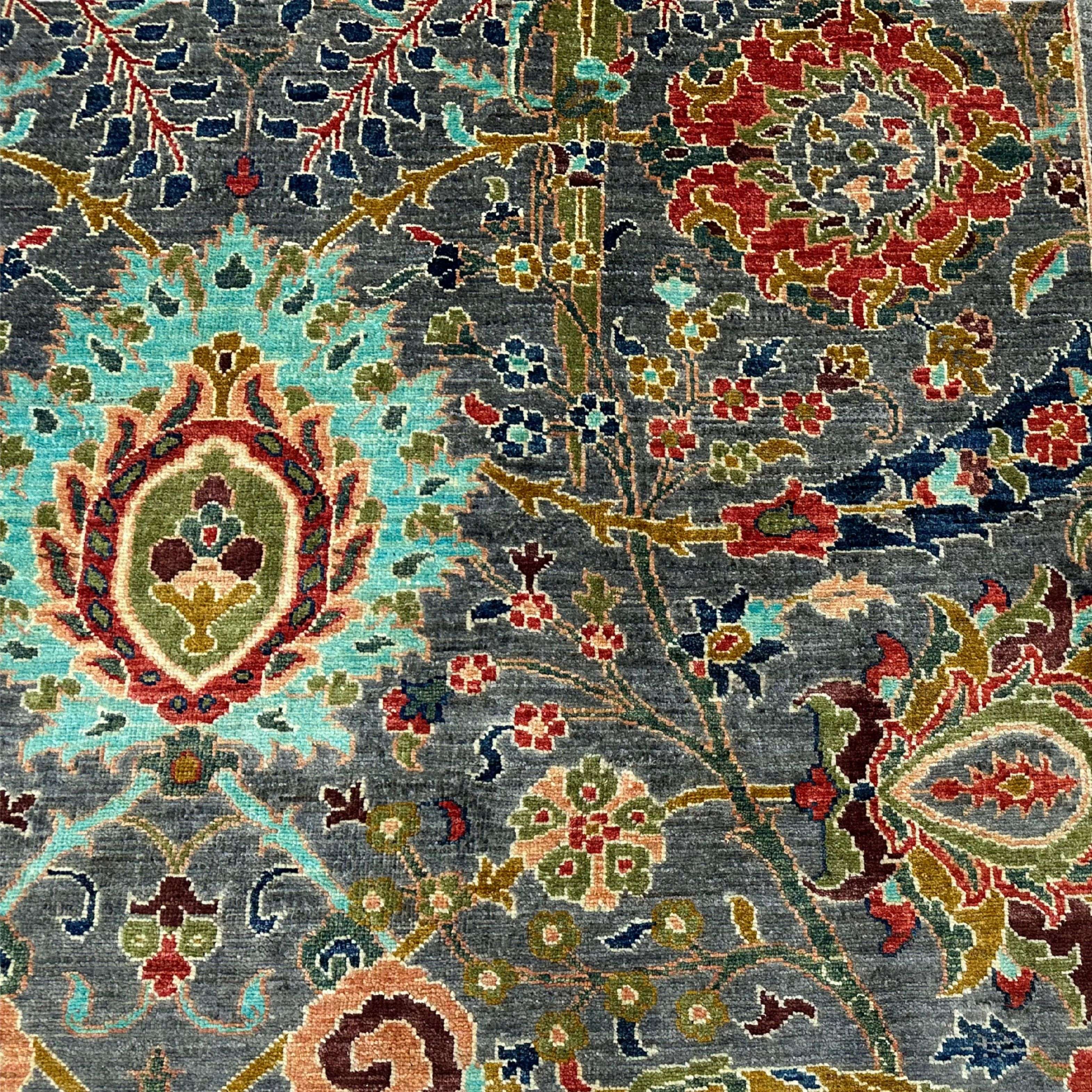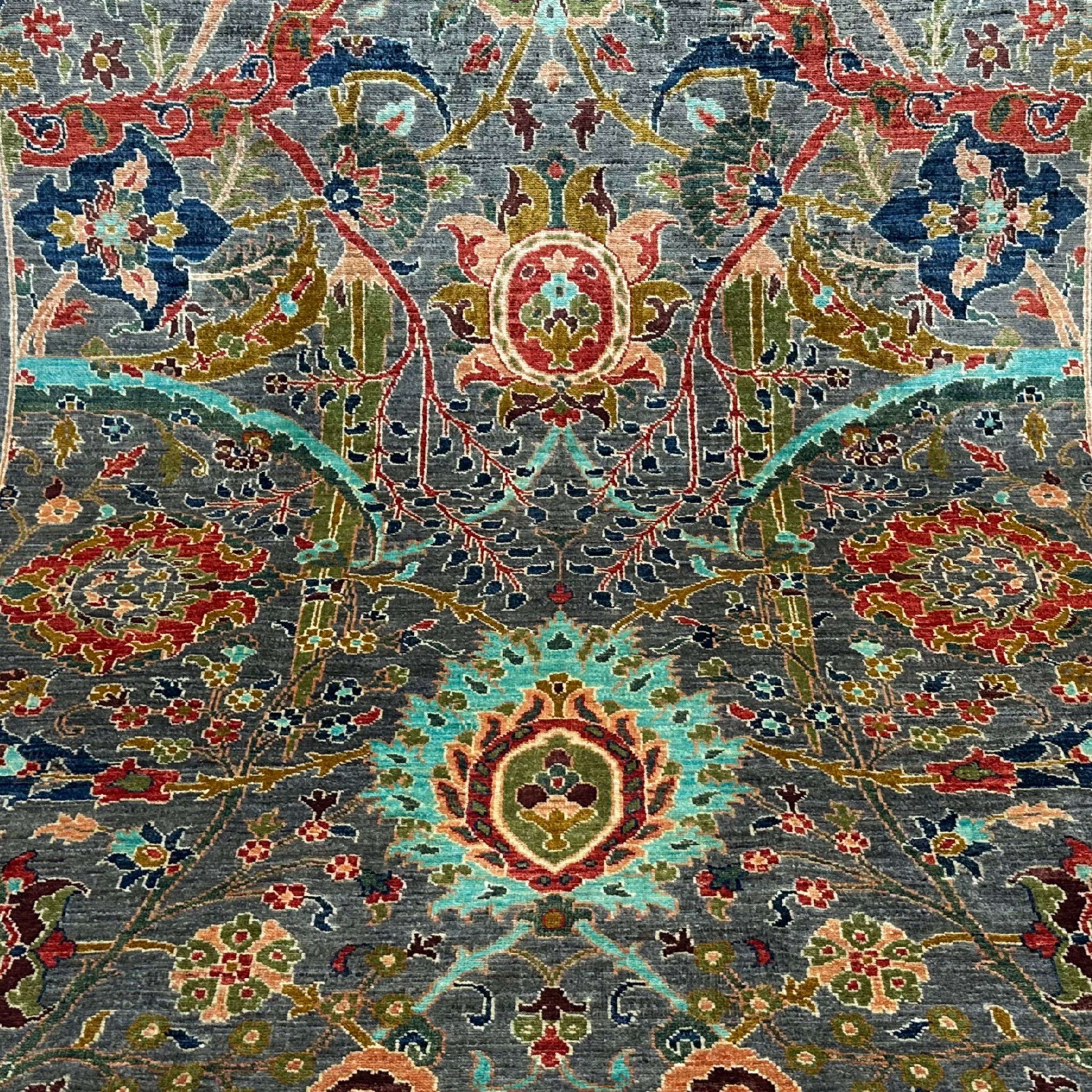 The pattern is surrounded by a fancy floral medallion emanating tracery tendrils, rosettes, and pomegranate blossoms in saffron, teal, ruby, and ivory. The field is in graphite grey, and the vines serve as a dramatic contrast; they also relate symmetrical bouquets and mandalas. The balanced composition balances the moving and the complex tone.