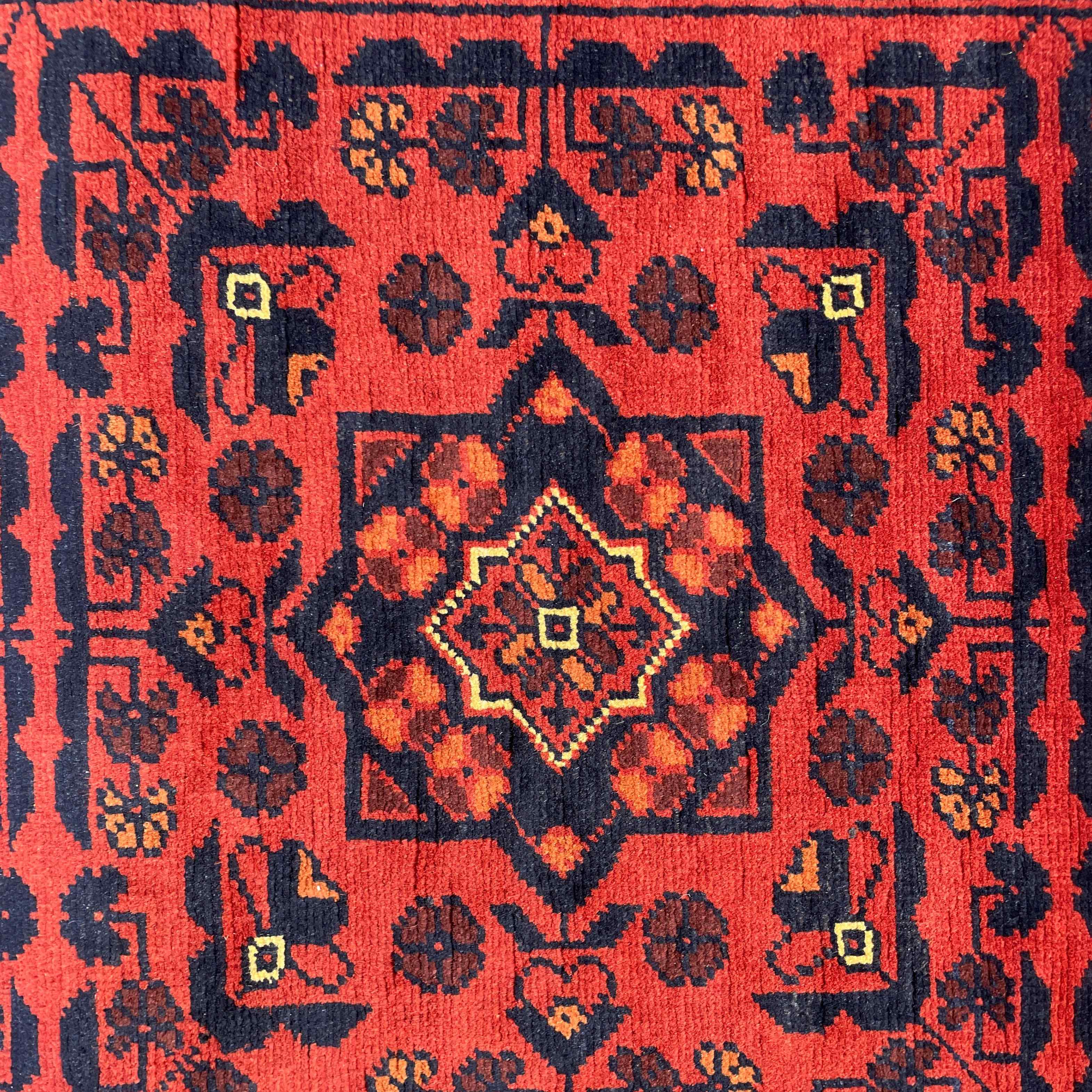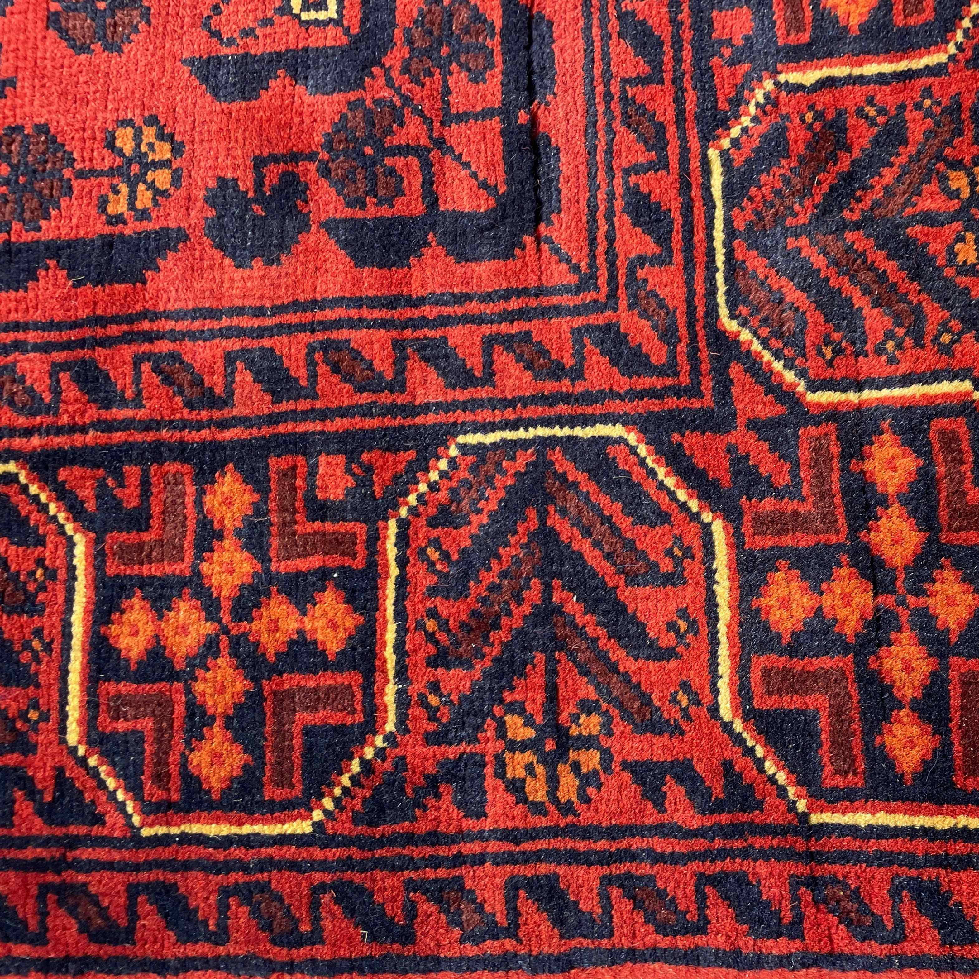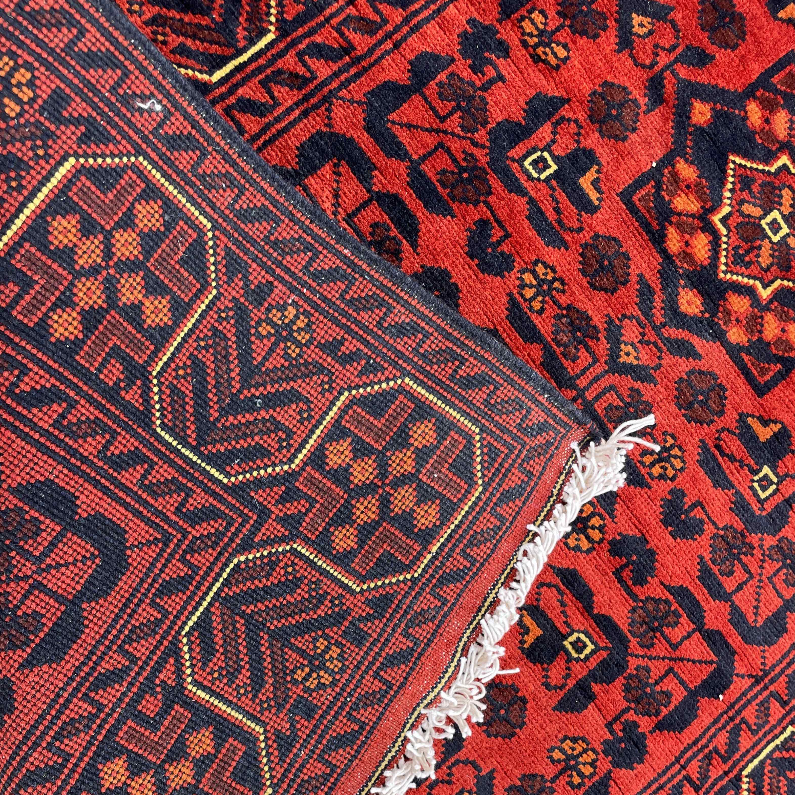 This item is hand-woven using hand-spun Afghan wool, which is a product of mountain sheep, and is naturally dyed, which provides intense colors that are durable. The lanolin content of the wool creates a warming sheen and fluffy feel to the surface and also makes the rug strong, supple, and one that can be used in high-traffic areas such as passageways and doorway entrances.
