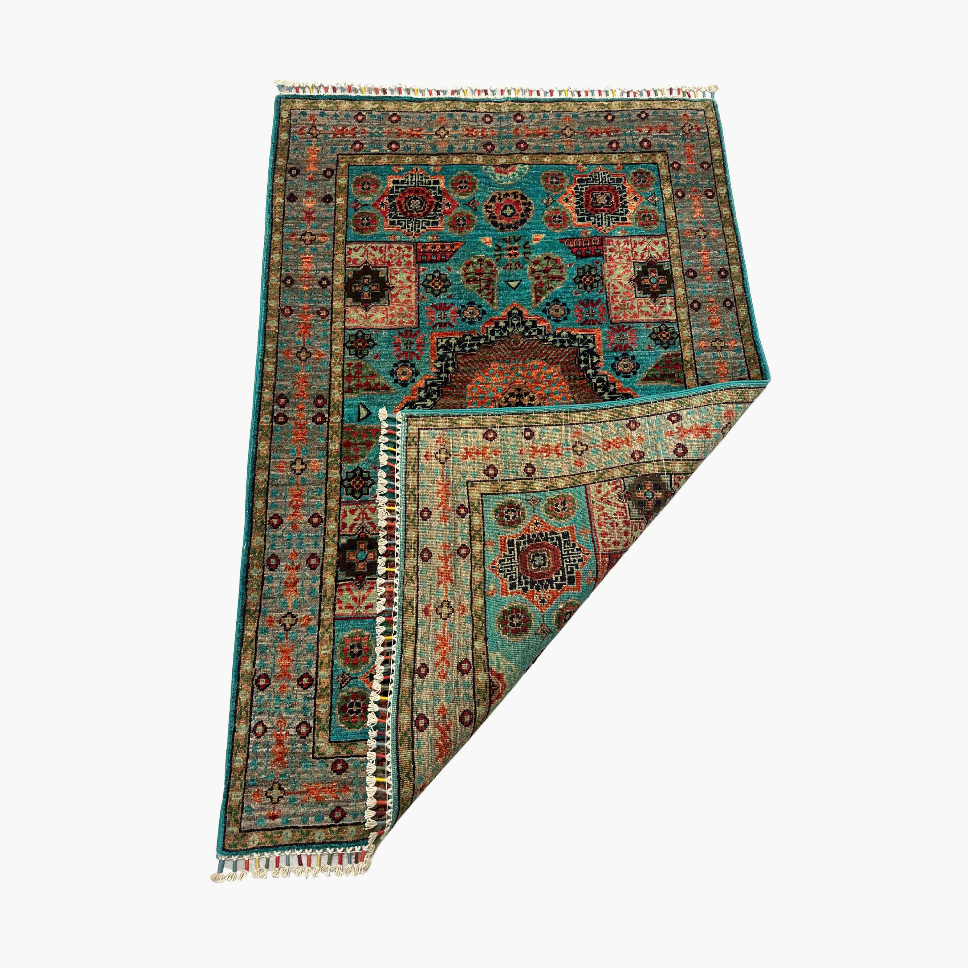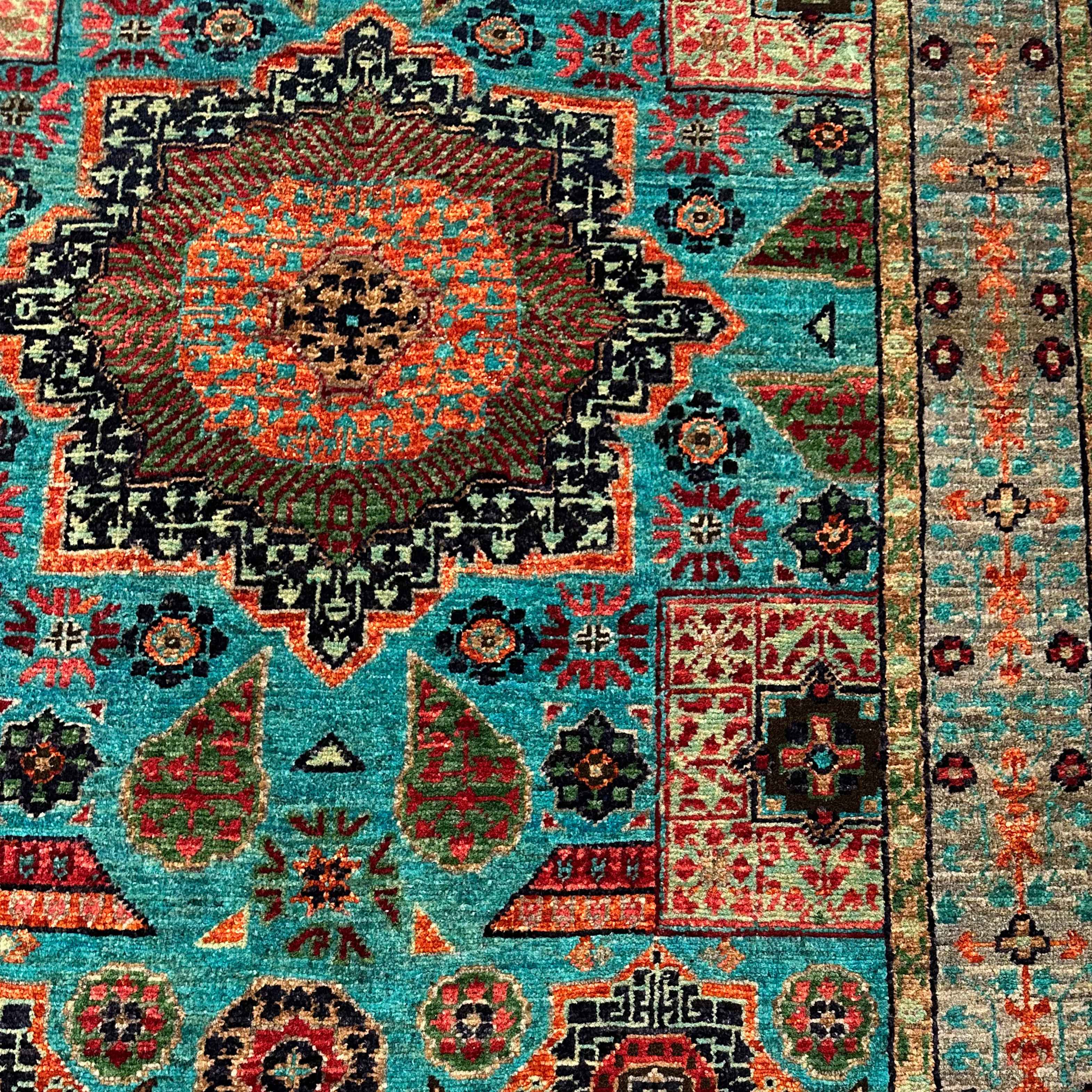 At the centre is a rust medallion that flourishes in a lush turquoise background, on which symmetrical rosettes and box patterns radiate out. The borders are soft sand and blush as opposed to deeper black and brick-red accents. All the motives refer to the harmony of nature-to pomegranate flowers to stylised vines- in mathematically symmetrical arrangements.
