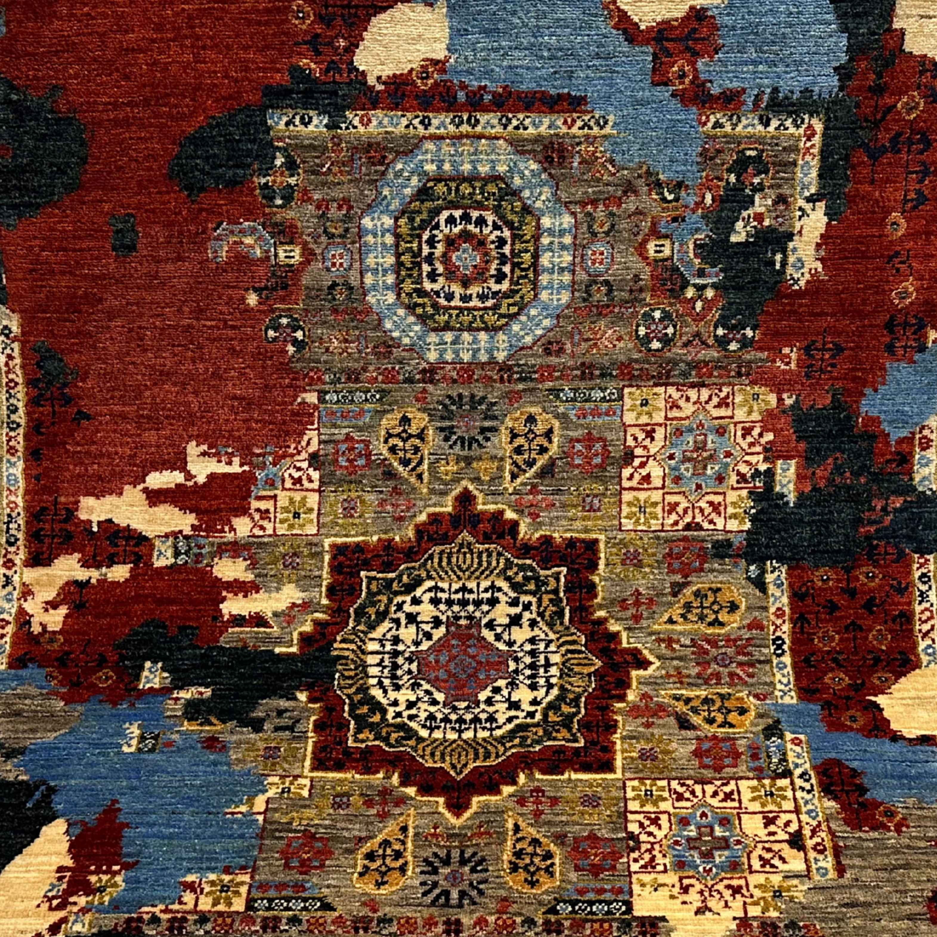 This rug is hand-spun woven Ghazni wool and dyed with natural pigments such as indigo, madder root, and walnut shell. It has lightfast colors that are rich in organics. There is also wool to guarantee soft hand and great durability and that of heirloom value, but it is made without any synthetics or anything chemical.