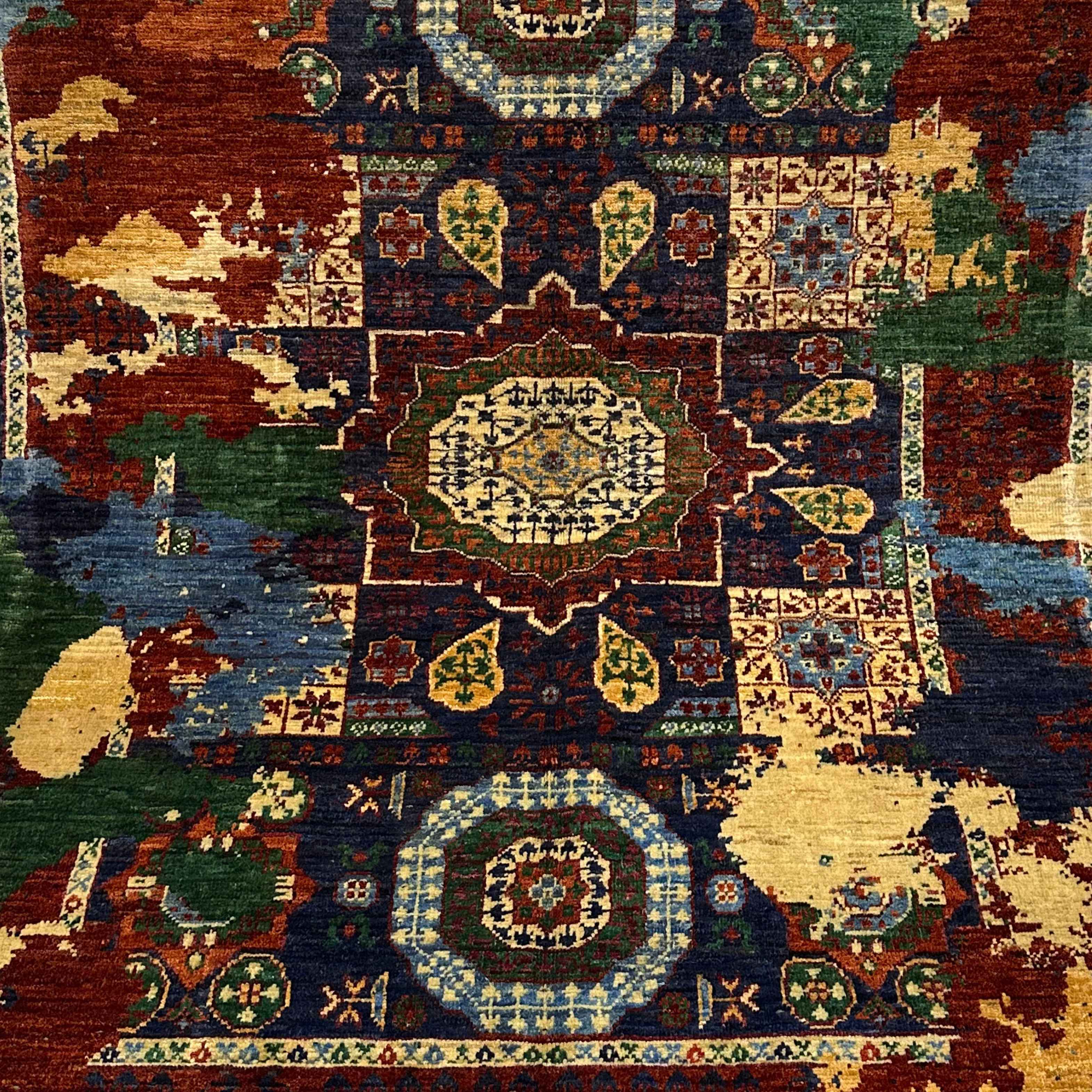 This rug is a modern handcrafted version of traditional Mumlook design and is handwoven in Afghanistan by artisans who are experts in tribal weaving. Based on centuries of local handwork, the work unites geometry with contemporary non-symmetry. Behind every knot is a history- ancient symbology is maintained, and yet unpredictable moments of the eye are opened by moving with the color fields.
