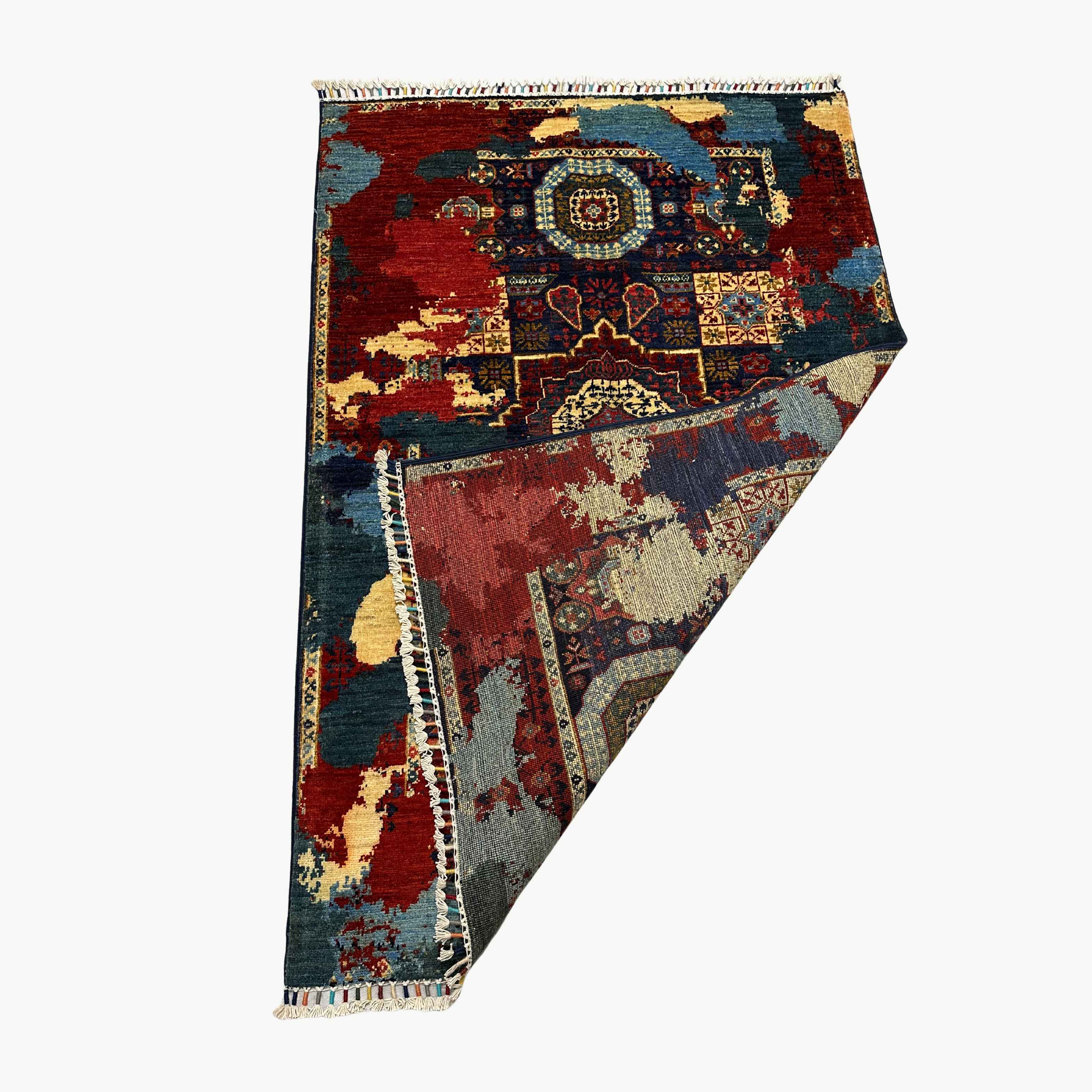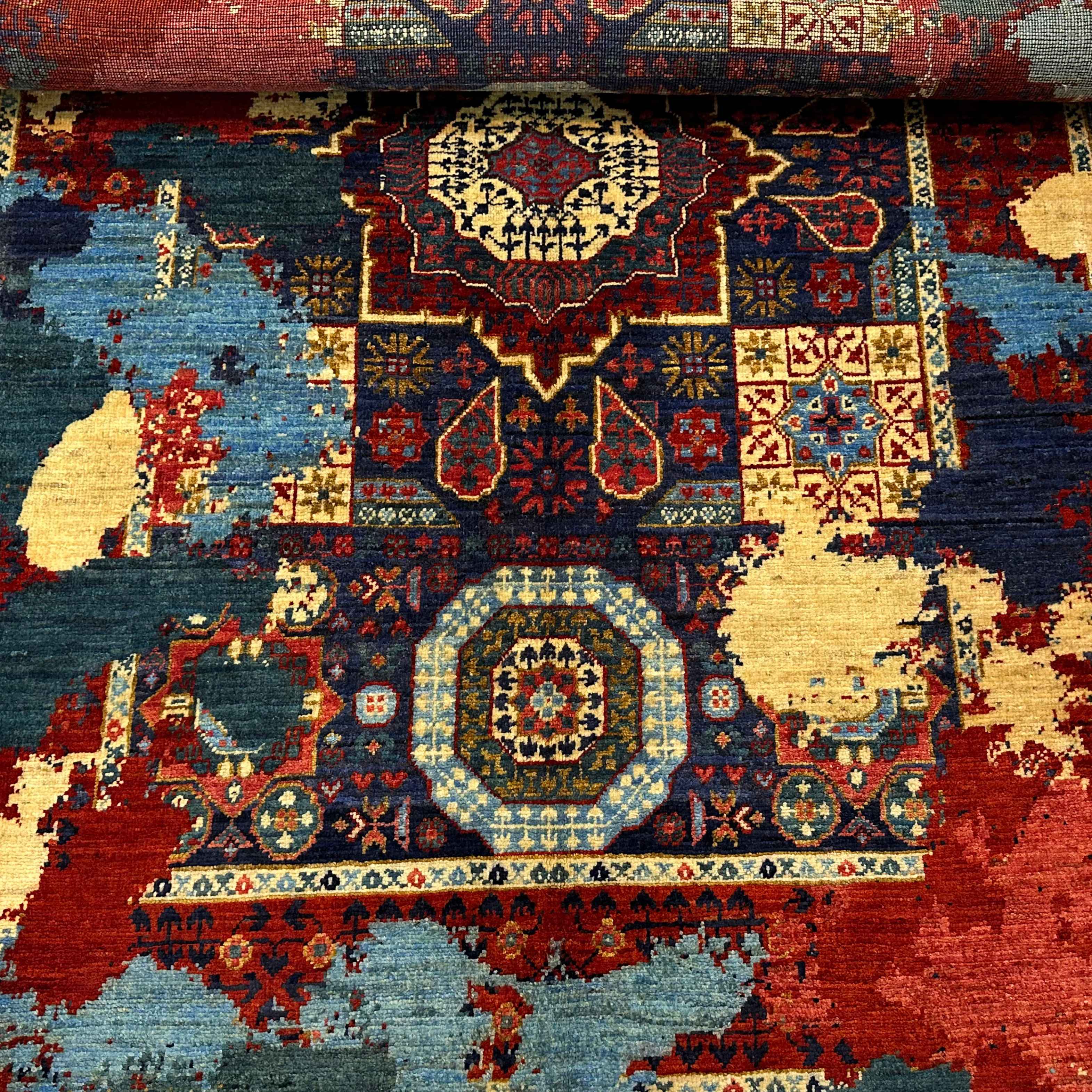 An Afghan-made Mumlook rug is an interesting example of the fusion of Afghan, Persian, and Caucasian styles. The design has a classical symmetry and patriotic storytelling that comprises art and tradition. Its delicate craftwork is an extension of centuries-old tribal crafts passed down through generations.