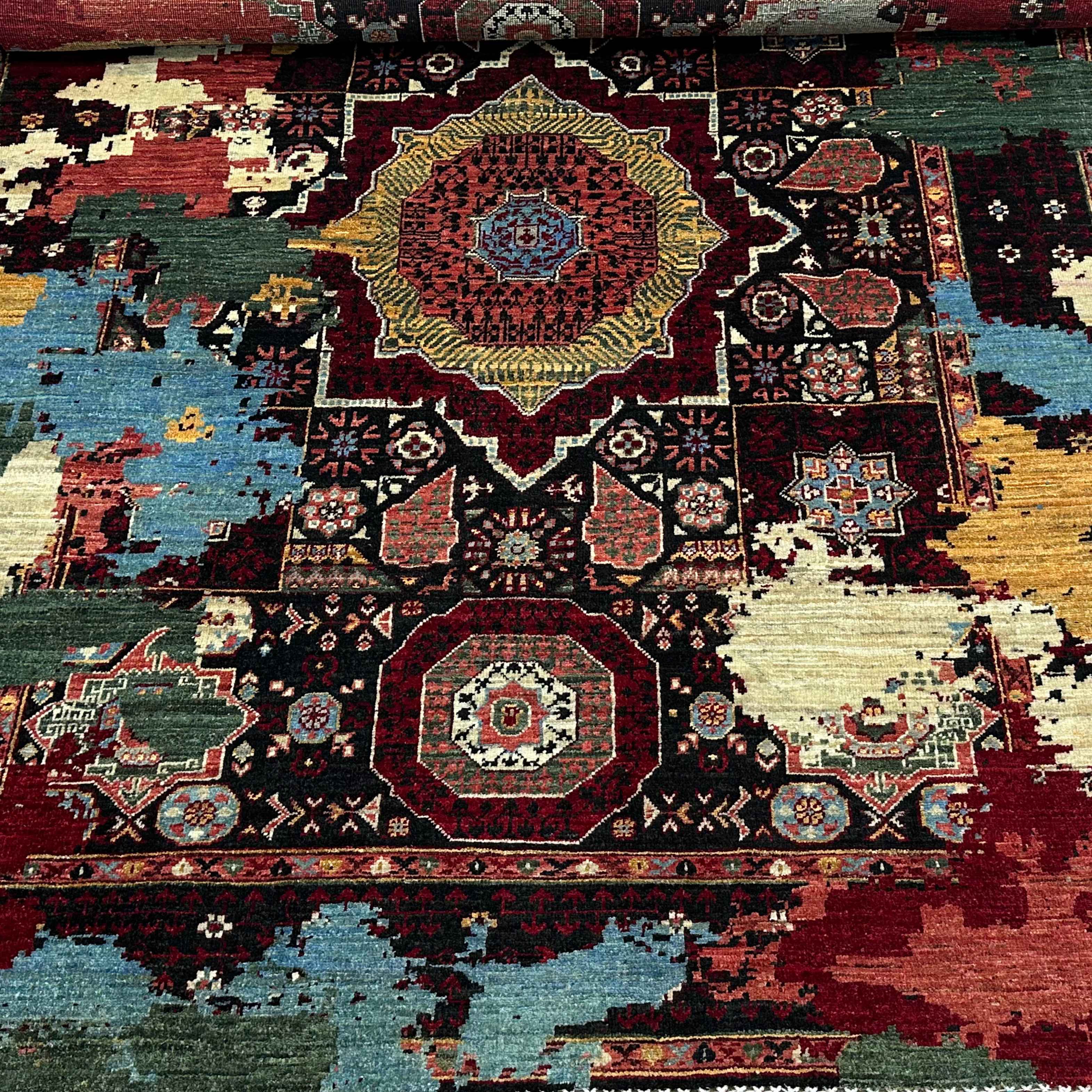 This handcrafted product was made by the Mumlook artisans in Afghanistan, and it has a history of geometric narration based on the Persian and Caucasian cultures. It combines the ancient art of weaving and modern art object, carrying its own cultural symbols into new forms, and experimenting with modern, innovative beauty.