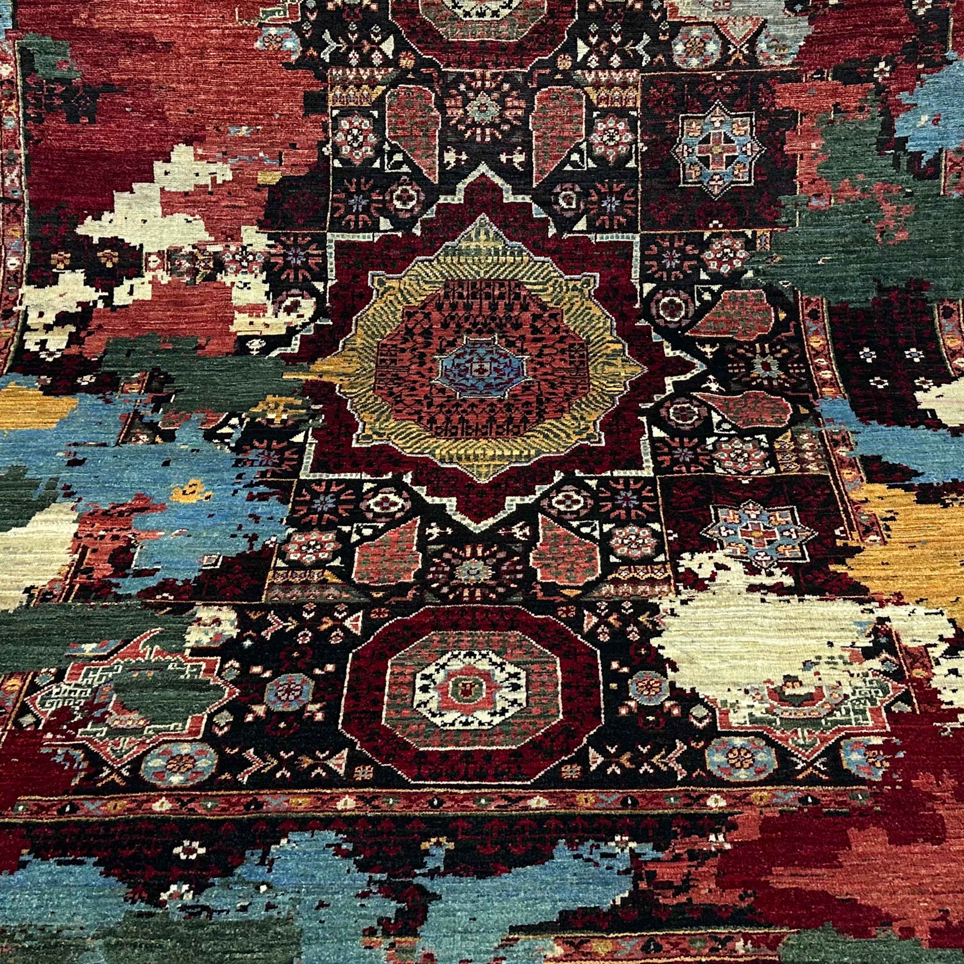 Based on the old designs, as described by Mumlook in her distinguishing Central Asian geometry combined with Persian symmetrical design, this carpet has a contemporary color scheme. Such carpets, originally given as tokens of good fortune, still have a cultural association-their spiritual and decorative depth can add to the modern home.