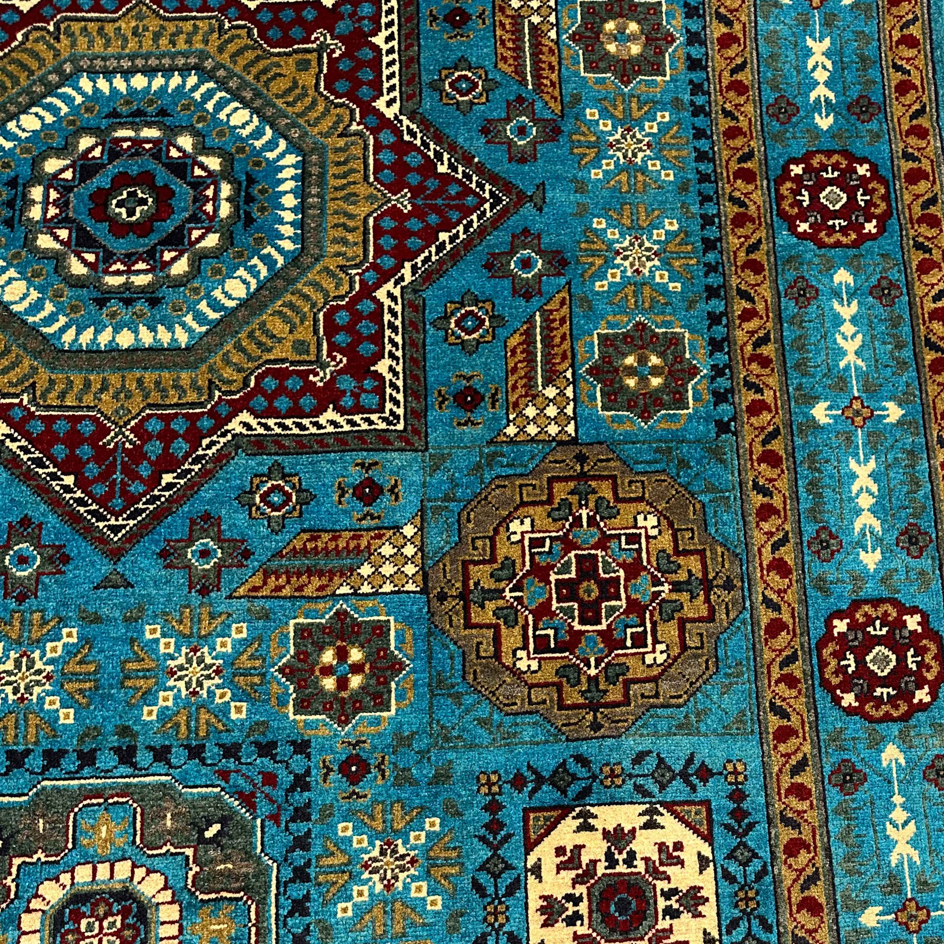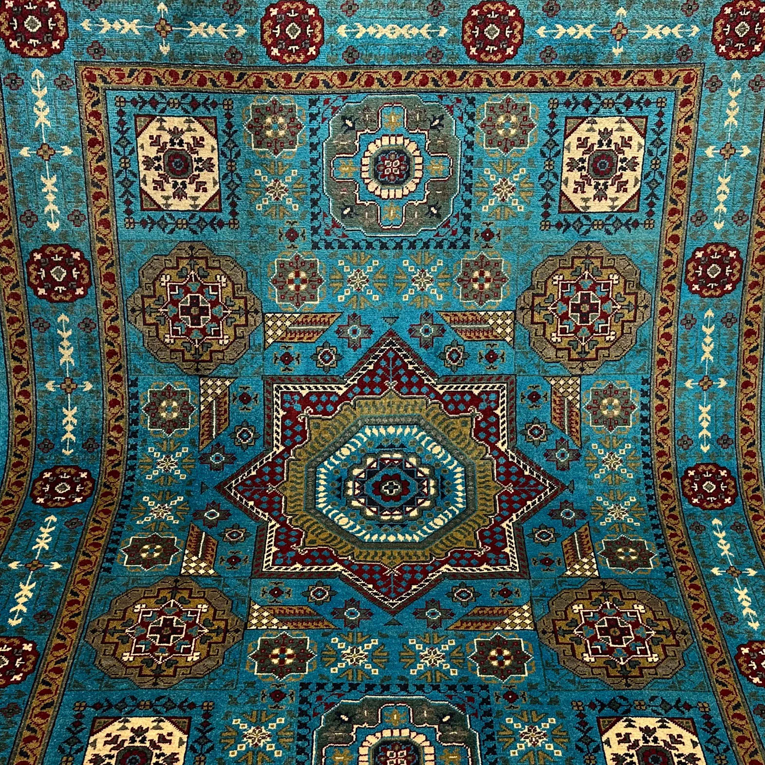 The design is centered with a stellar-like medallion surrounded by a collage of floral rosettes and geometric shapes in ivory, saffron, and burgundy. The jewel tones are accented in the turquoise ground, and there is repetition of the tribal symbolism and balanced harmony in the decorative borders. Each pattern makes up a highly narrated visual rhythm.