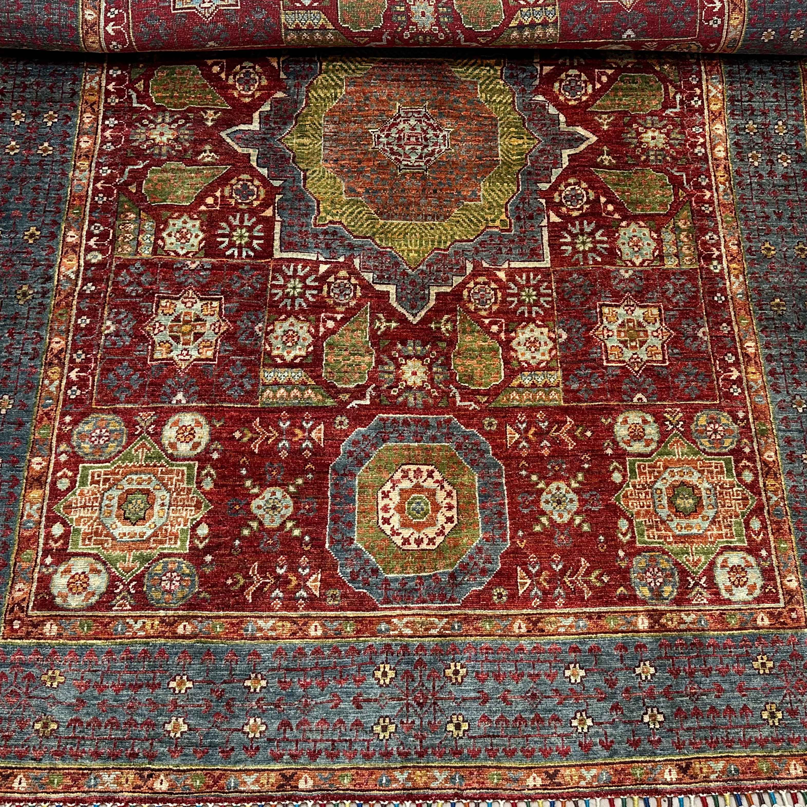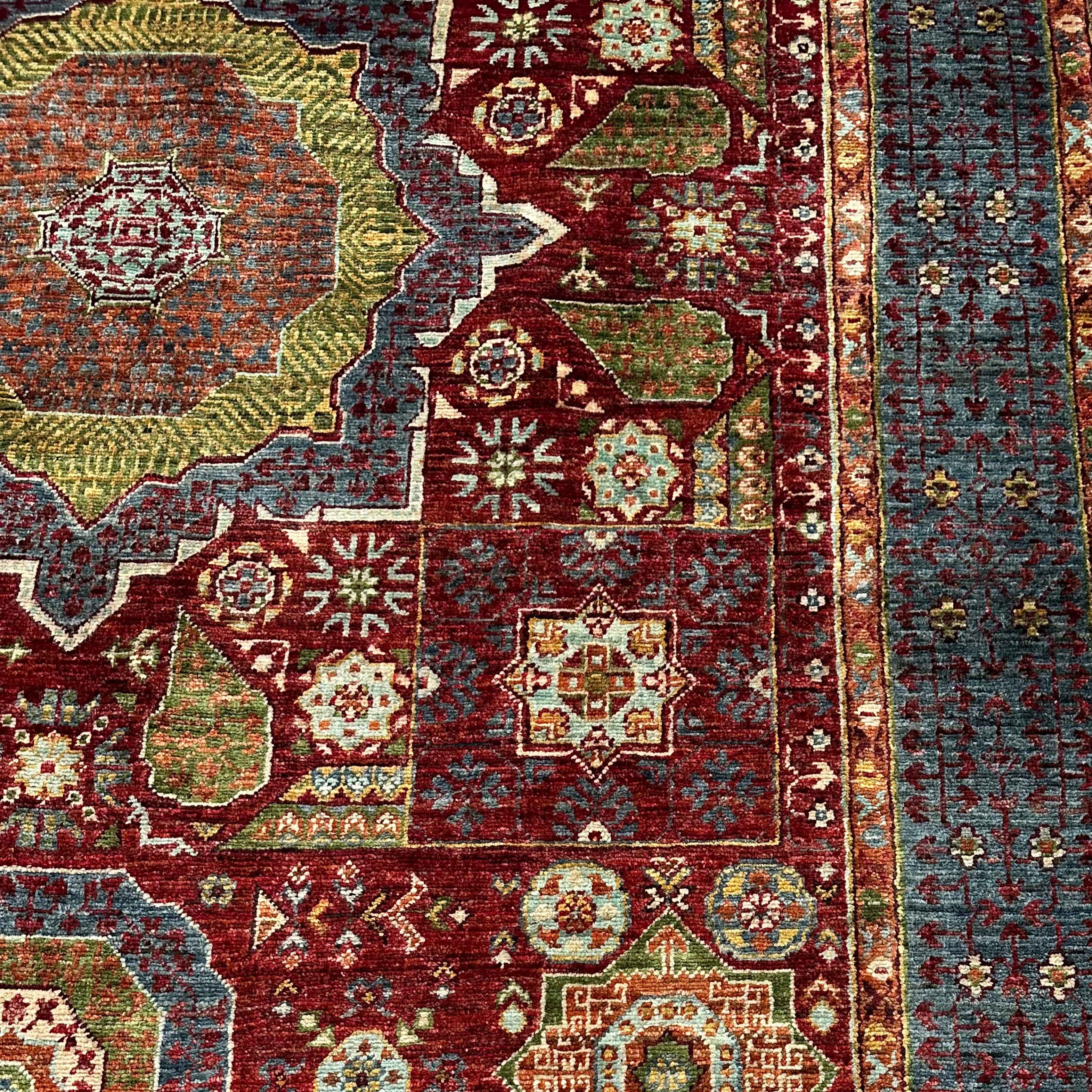 Mumlook carpets derive internationally, based on imperial place carpets – the ones of the Mughal and Persian empires re-designed by the Afghan artisans with remarkable ability. The symbolic patterns, such as the floral stars, medallions, and the layout of the gardens, are of prosperity and security. As such, this rug pays respect to that decorative heritage, but it also brings classic sophistication to the contemporary collector.