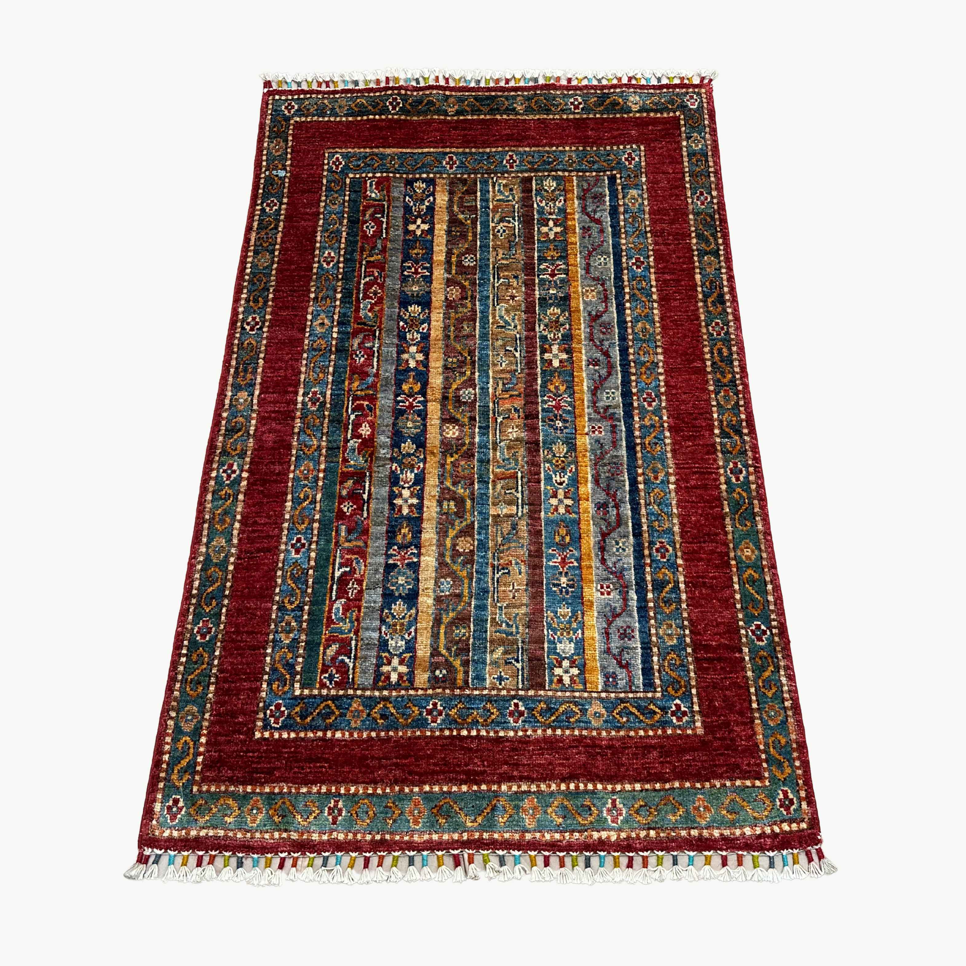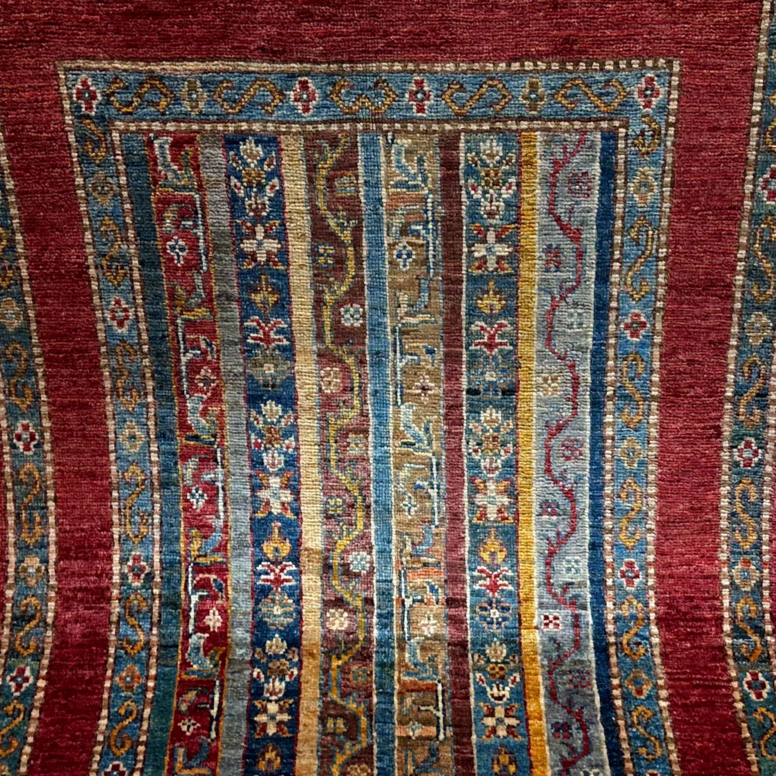 Crafted by hand in the weaving centers of Northern Afghanistan, this Shaal rug is the result of a tradition of weaving that extends across generations. The vertical stripe, along with the geometric-floral geometric repetition, inspired by nomadic tribal expressions, applauds not only the identity and long-standing inspired culture, but also leads to the creation of an object both truly timeless and incredibly versatile.