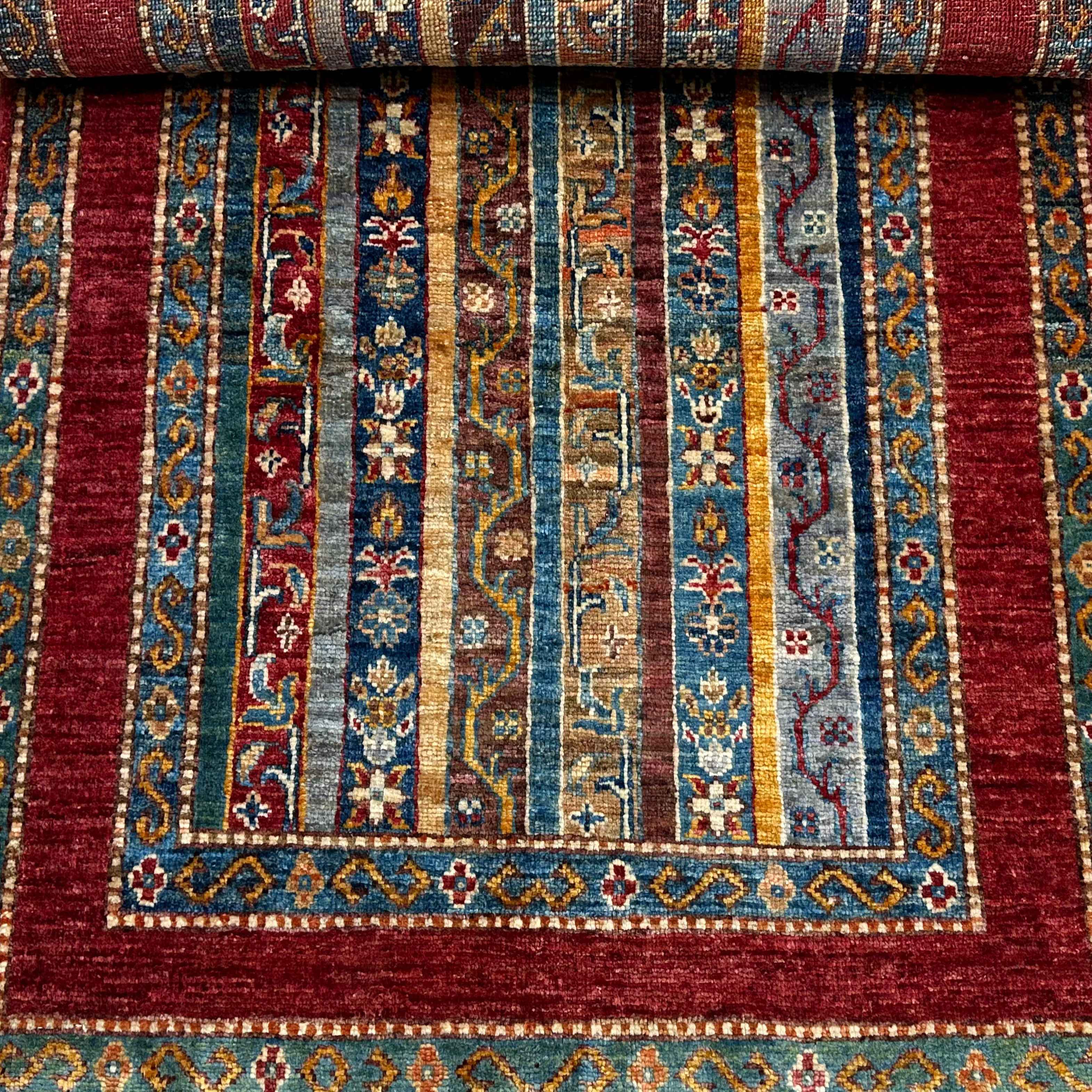 The design is deeply rooted in the history of tribal storytelling in which the stripe manner represents the journey in life, and the flowers filled in the border represent the security and rebirth. These patterns served both practical identity purposes (in the shape of practical identity markers) and spiritual significance in the historical shaping of nomadic weaving. The rug reflects this legacy in the present day by beautifying spaces today with its combination of cultural imagery and craftsmanship.