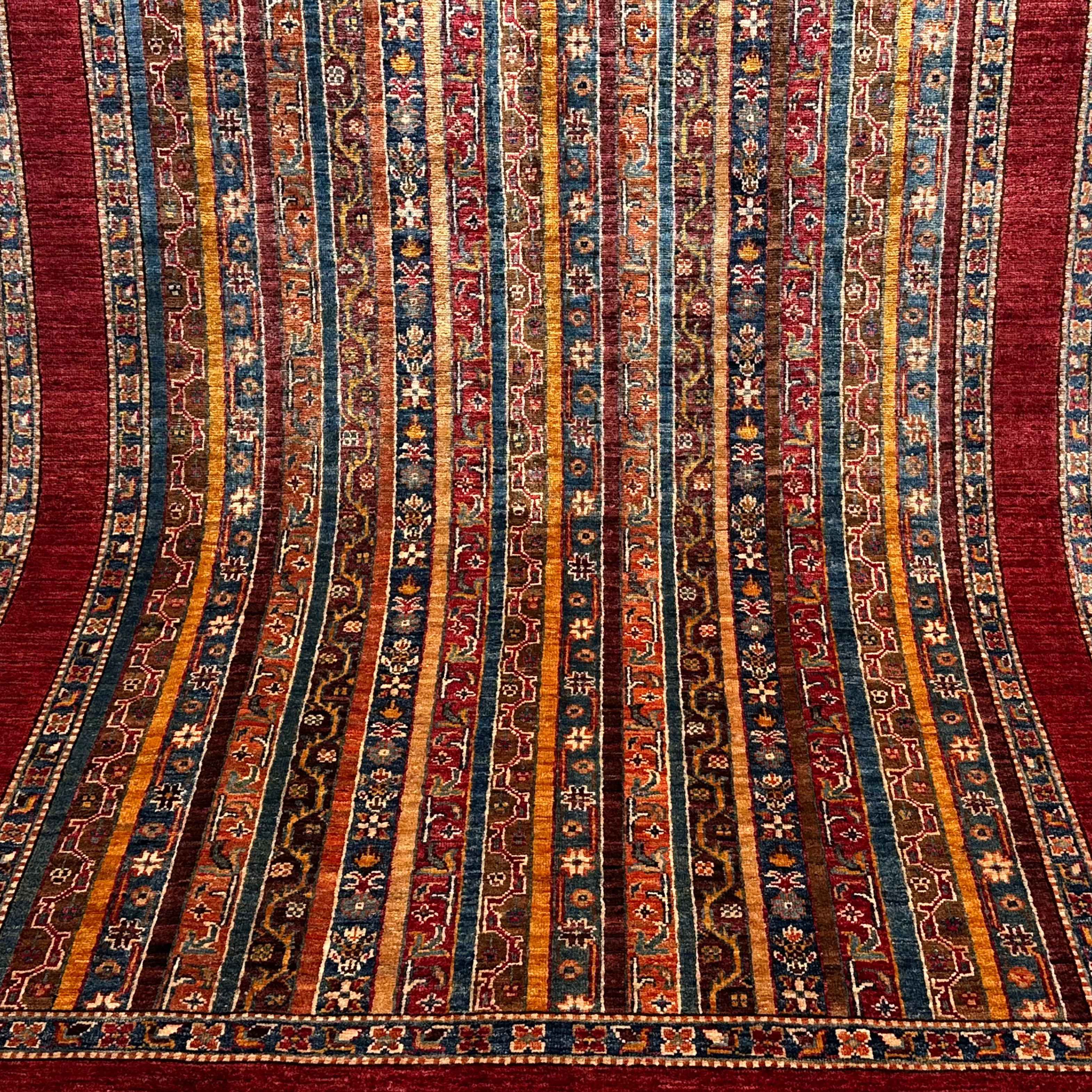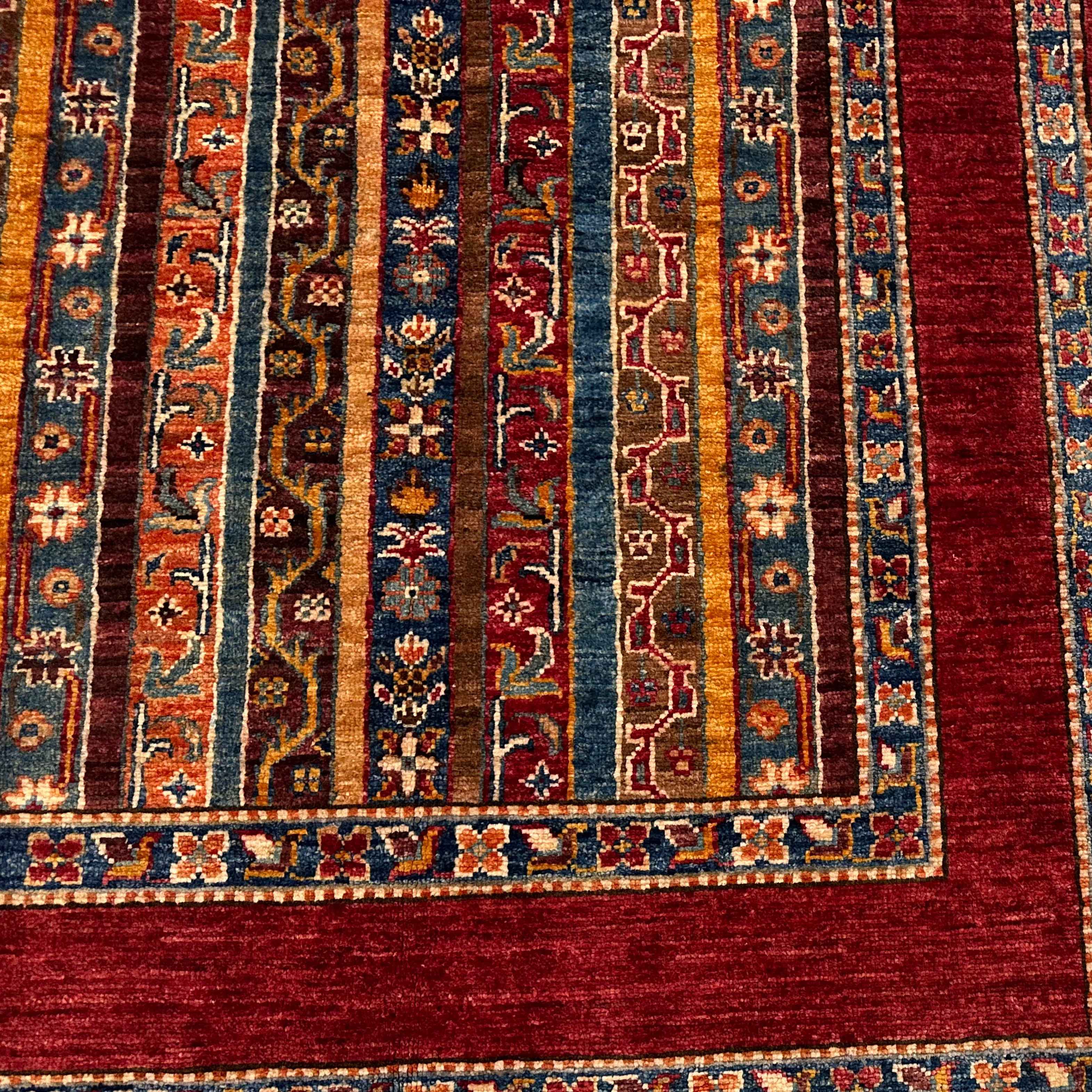 Produced on weaving centers of Northern Afghanistan by traditional Shaal artisans, the rug is an extended look at ancient Caucasian stripes. Each band works out a metaphorical narrative; Persian floral grace and Turkoman geometric discipline combine. It is a multifunctional cultural asset to both classic and contemporary homes.