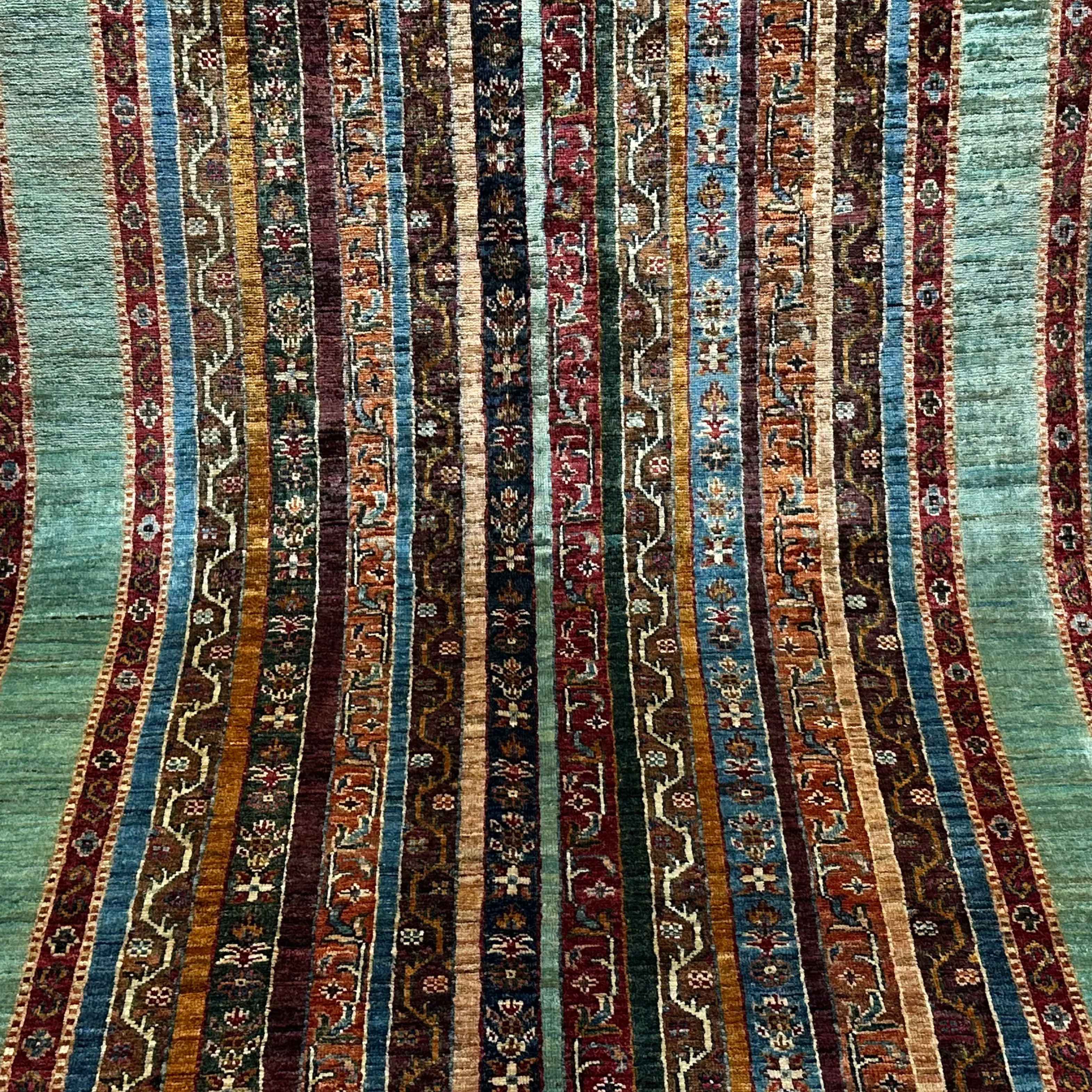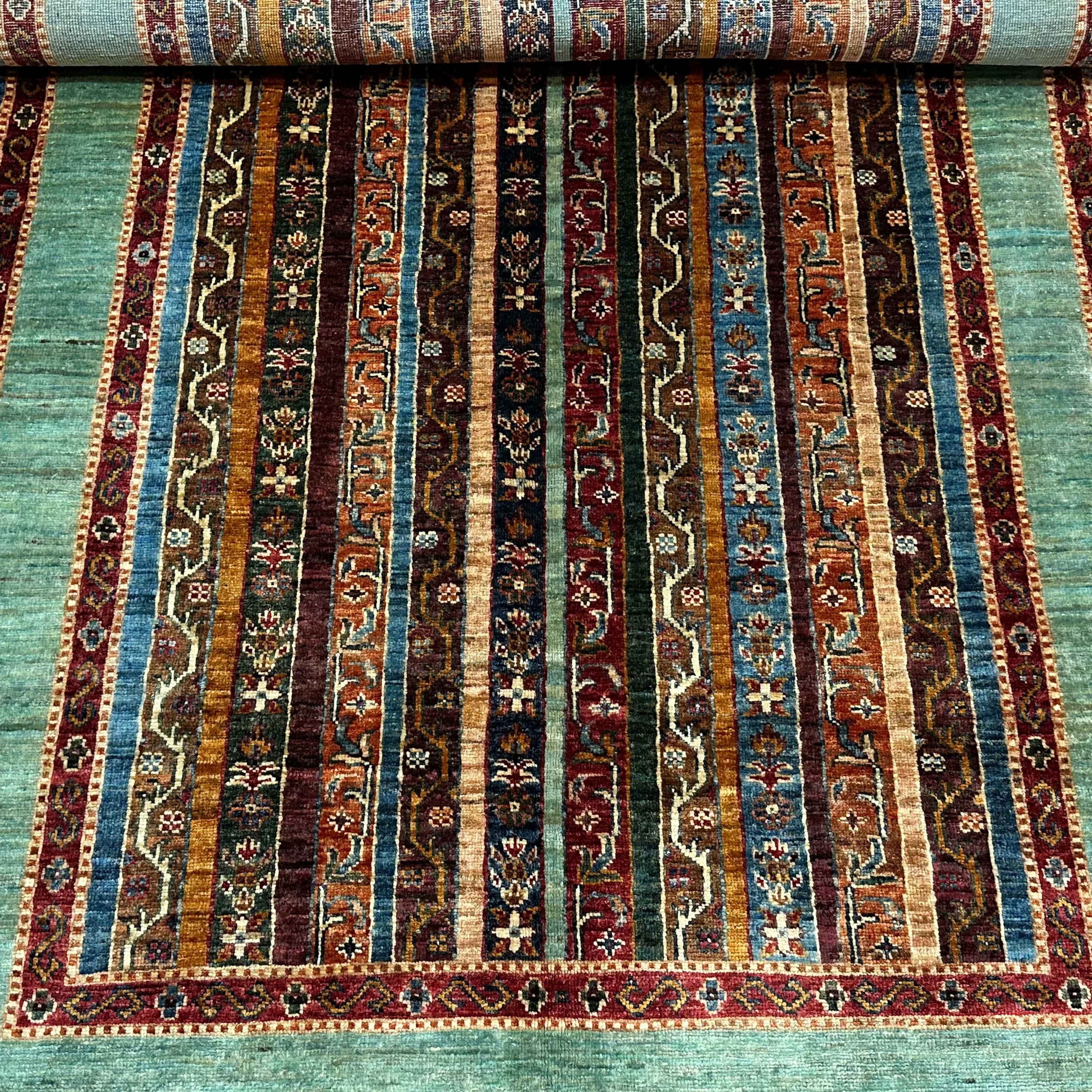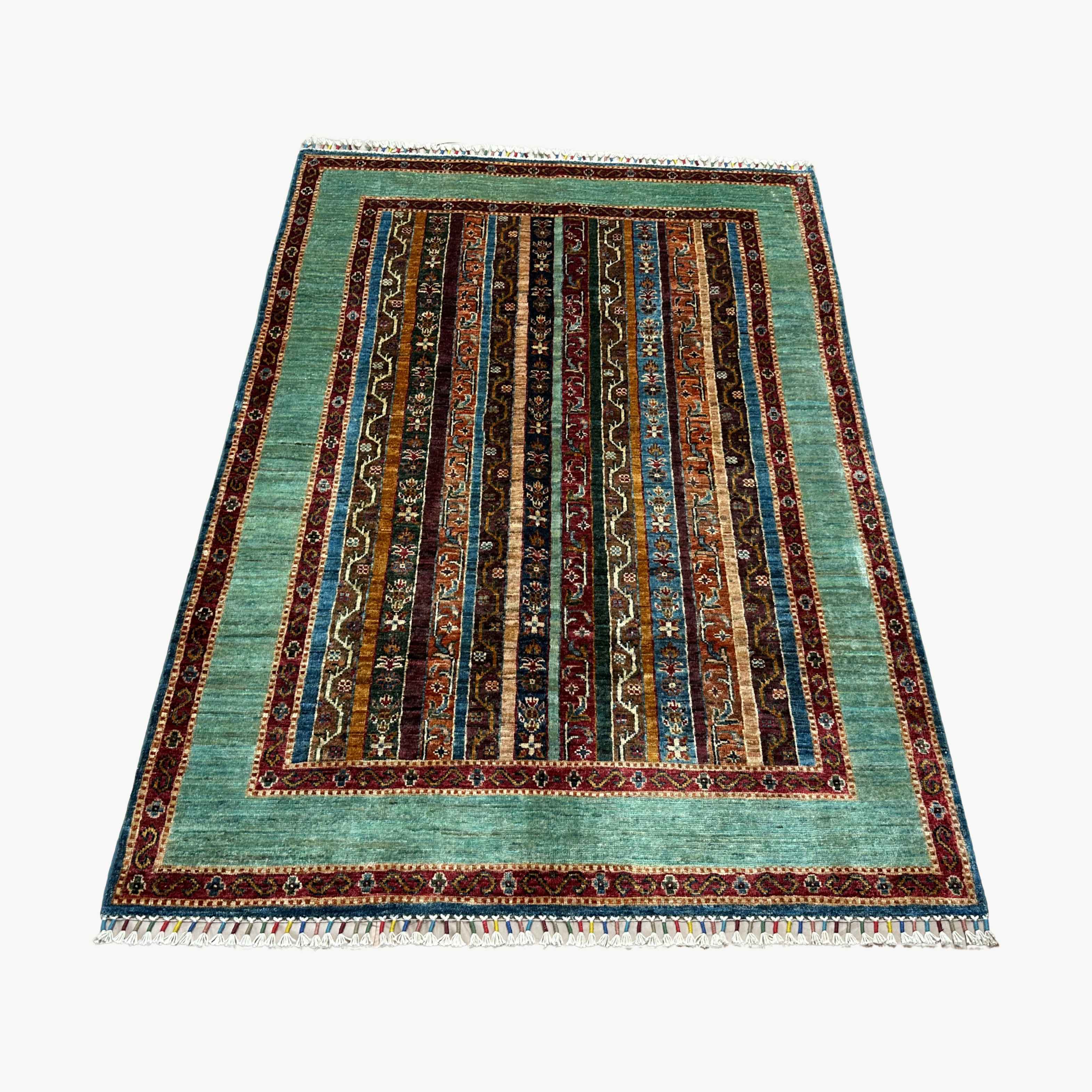 Turquoise elegance meets tribal tradition in this hand-knotted Shaal masterpiece.