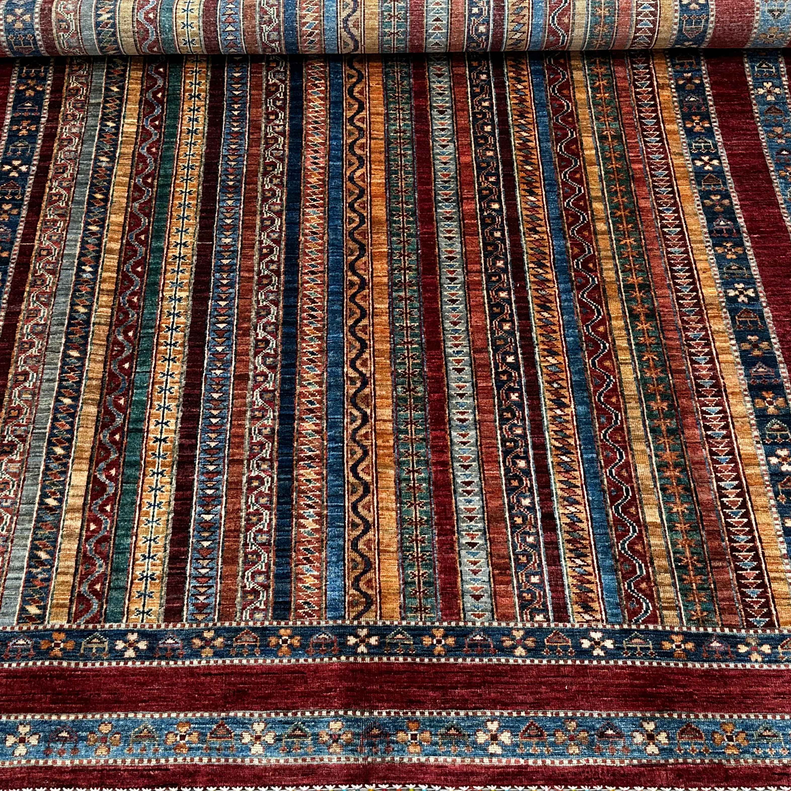 A tapestry of tribal heritage—this Shaal rug’s rhythmic stripes weave color, culture, and craftsmanship into a timeless floor art.