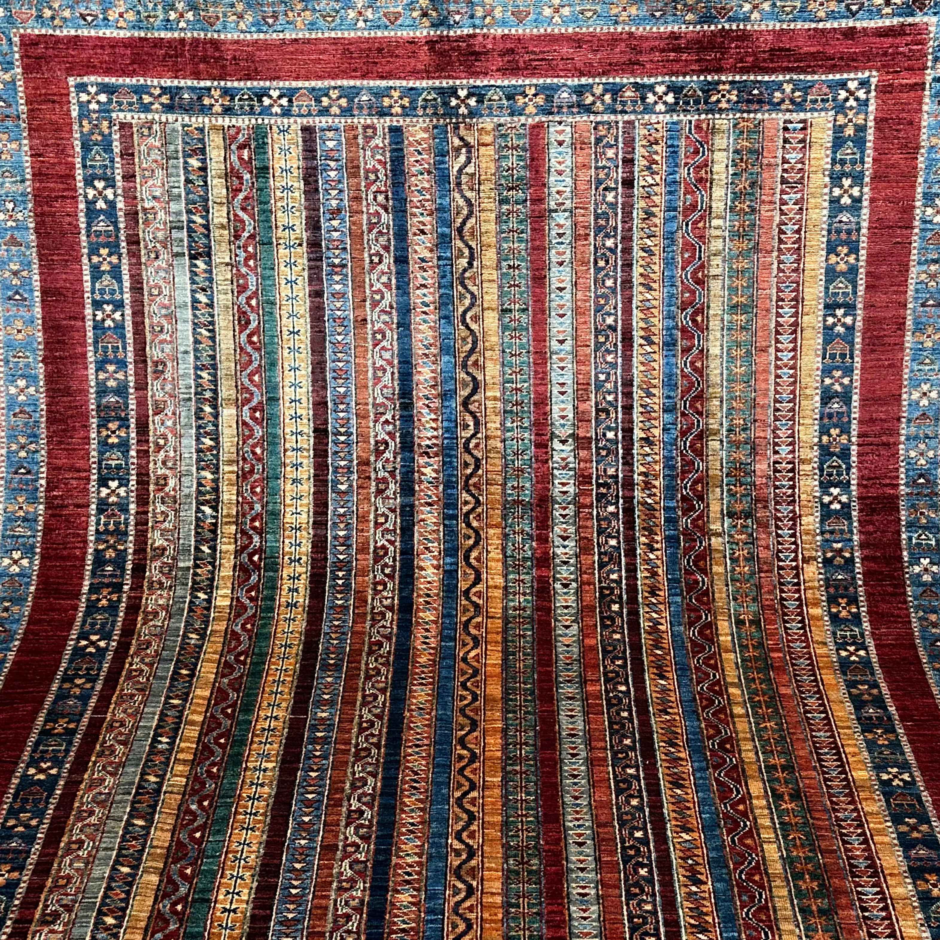 The pattern is an ornamentation of a series of vertical stripes of tribal design, each different in motif and colour, bordered by an indigo line of rosette and star pattern. The color of deep crimson grounds the composition, and gold, moss, and ivory come together to produce a playful contrast, symmetry, and rhythm throughout the surface of the rug.