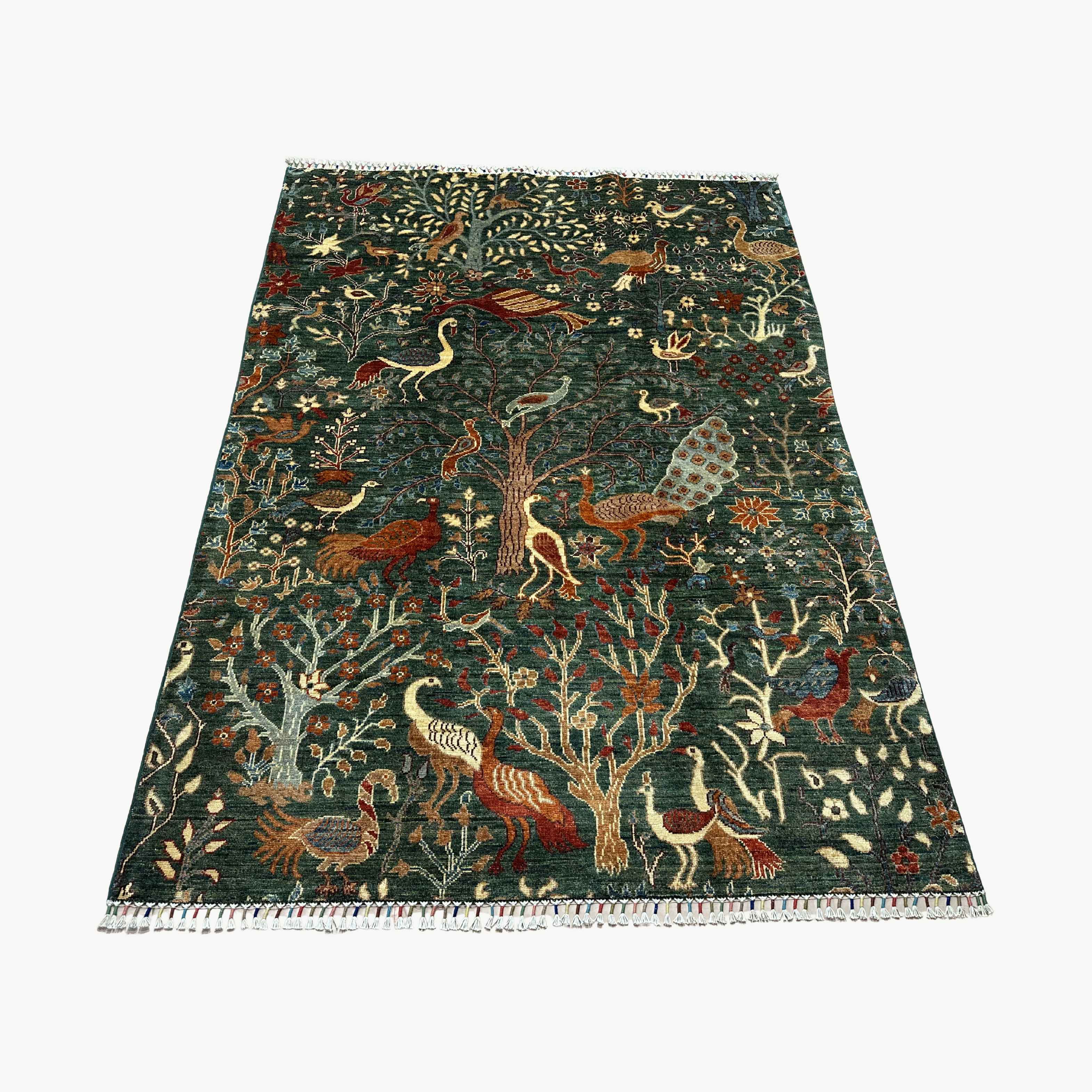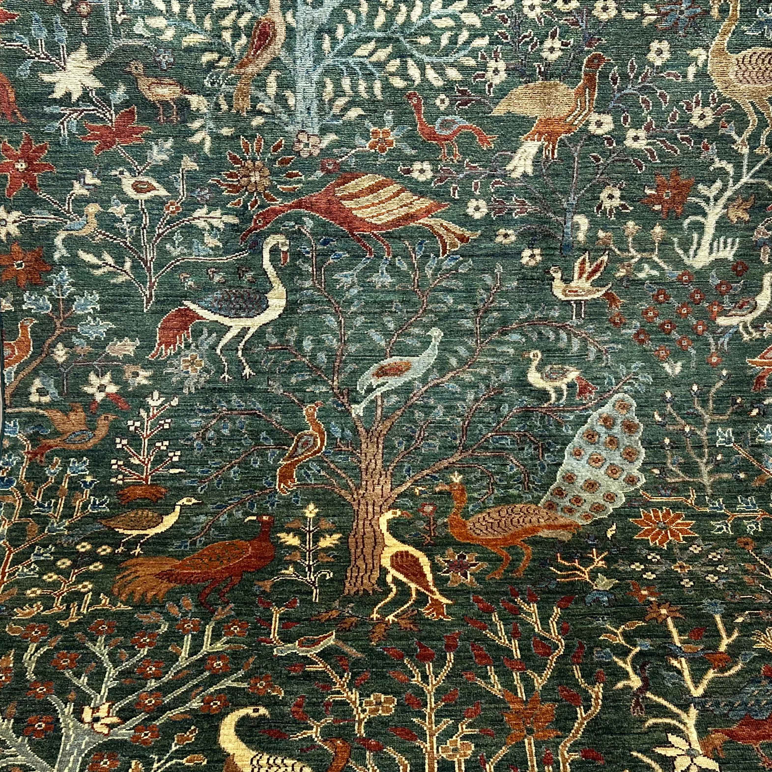 It has a high knot density portrayed in every feather, petal, and branch. There are hand-knotted fringes and strengthened edges. Its plush dimensions would lend itself to formal living rooms or dining areas at least, and entry halls, making any interior a new place almost instantly with the beauty of the Afghan and Persian craft of weaving.