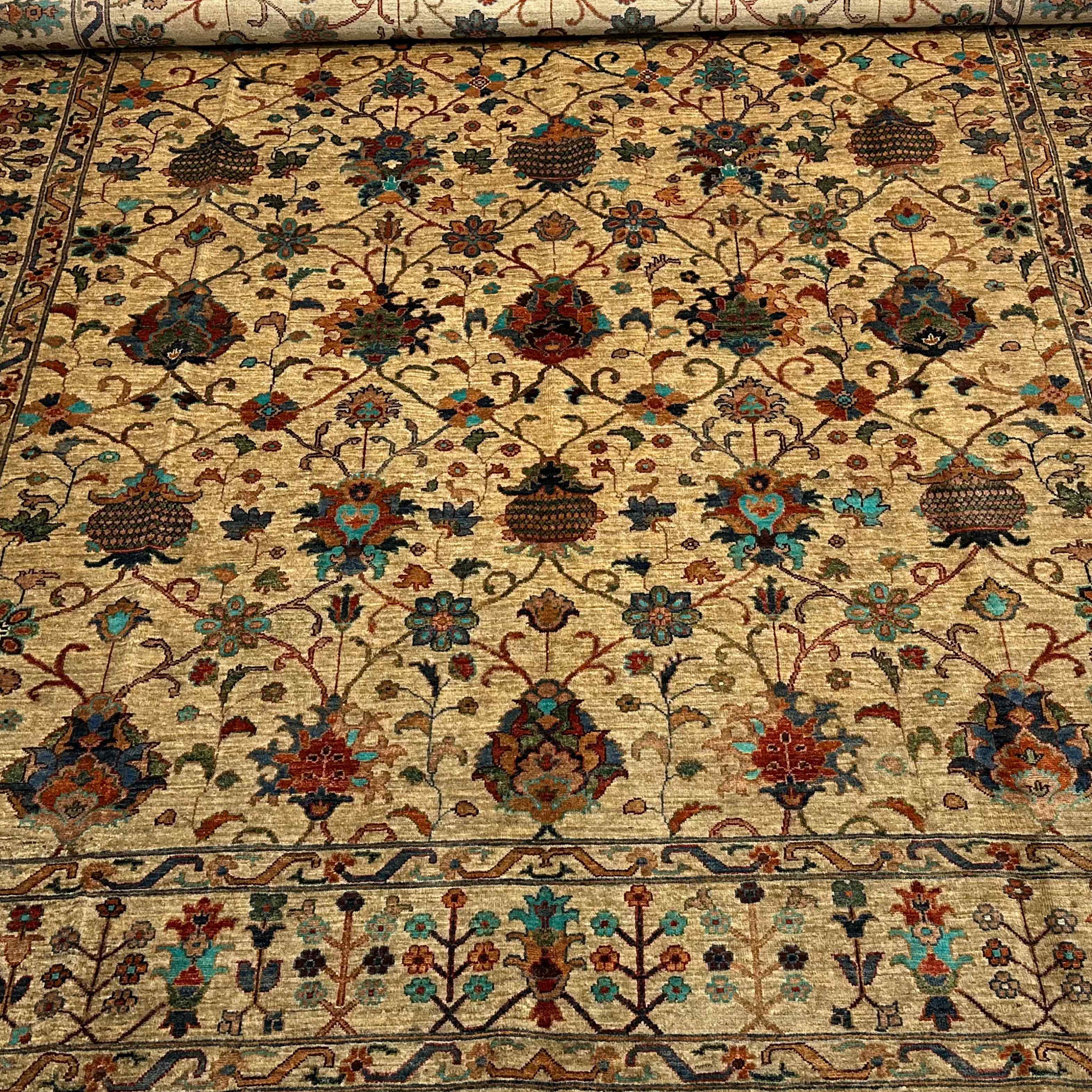 The surrounding main field includes symmetrical vase patterns growing and blooming with florals, enclosed by wave and geometric decorations. Combinations of turquoise, saffron, rust, ivory and teal colours on a warm beige ground yield exciting harmony. Its extensive dimensions and symmetrical build give it a royal feel, which makes it ideal in a sophisticated living room or a dining room.