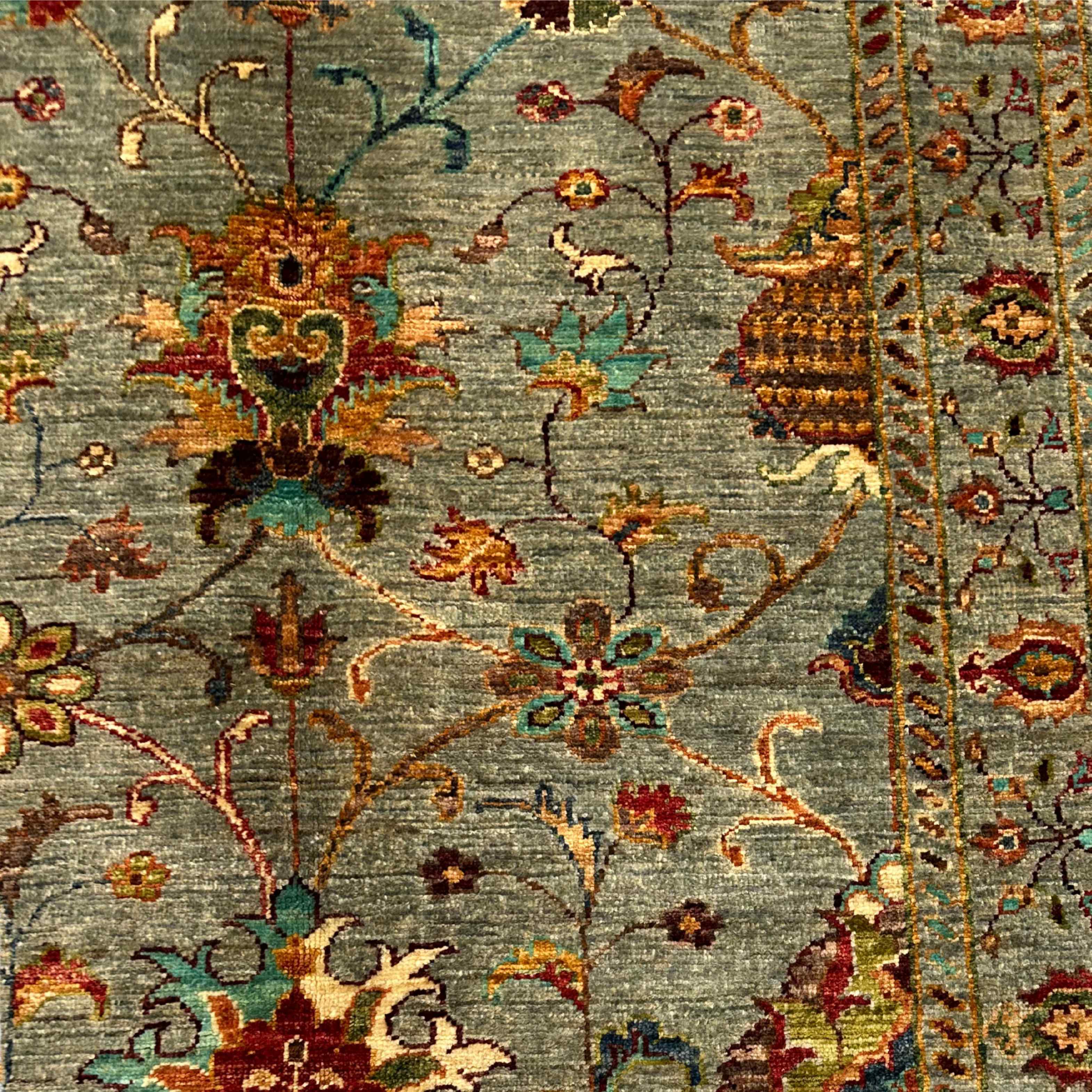 The detail of this rug is an all-over design of flowering vines and stylised blossoms with accentuated elements of the centralised medallion. Warm reds, golds, teal, and ivory together balance on a dull grey ground using layered vine-scroll framing. The dynamic symmetry and fine details allow it to be fitted in both contemporary and classic homes.