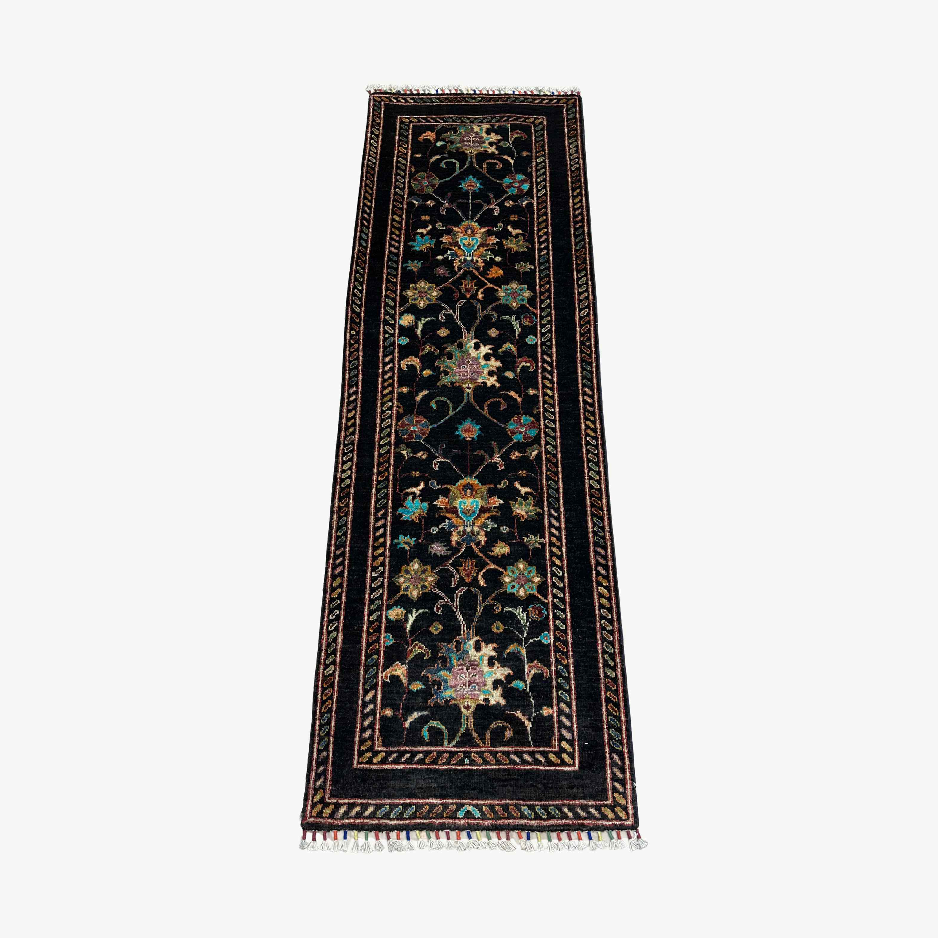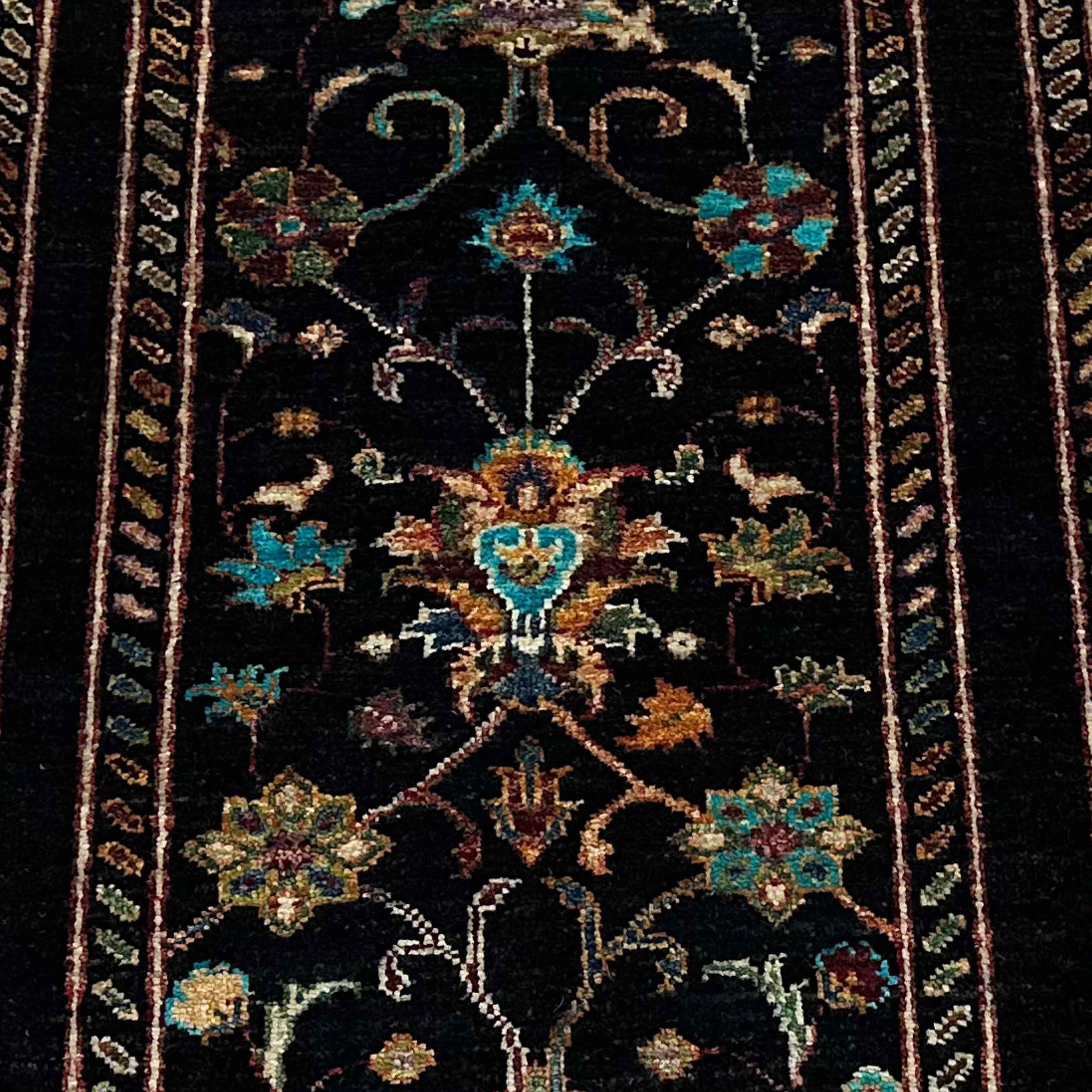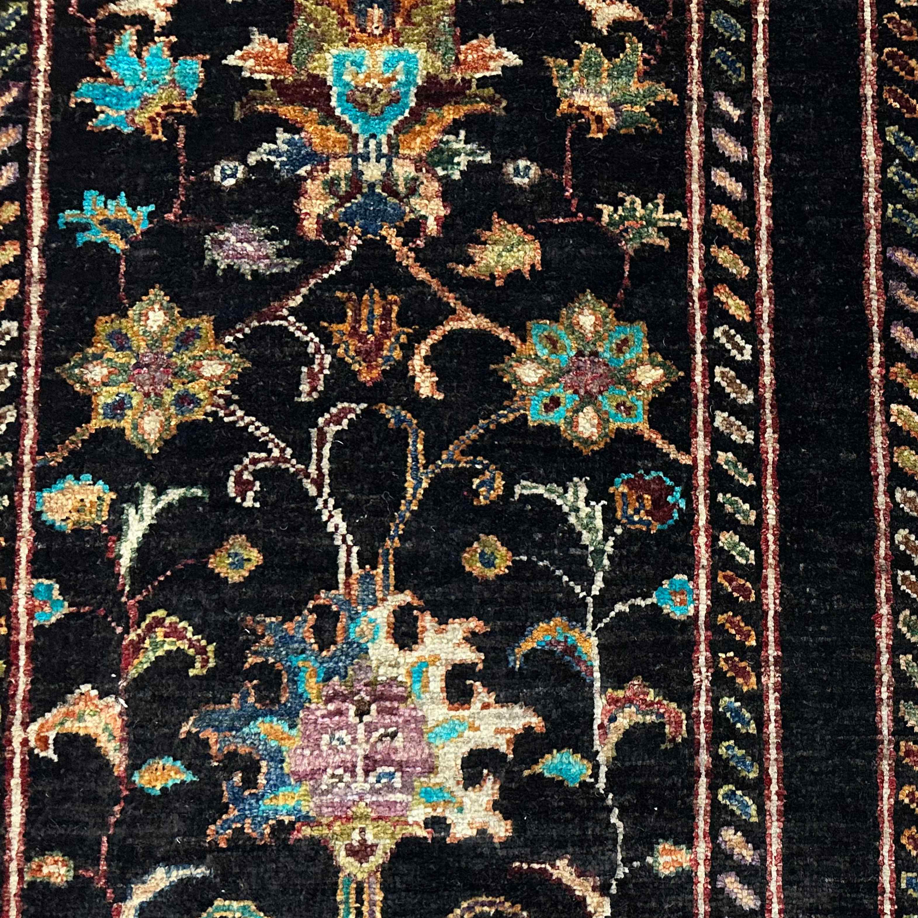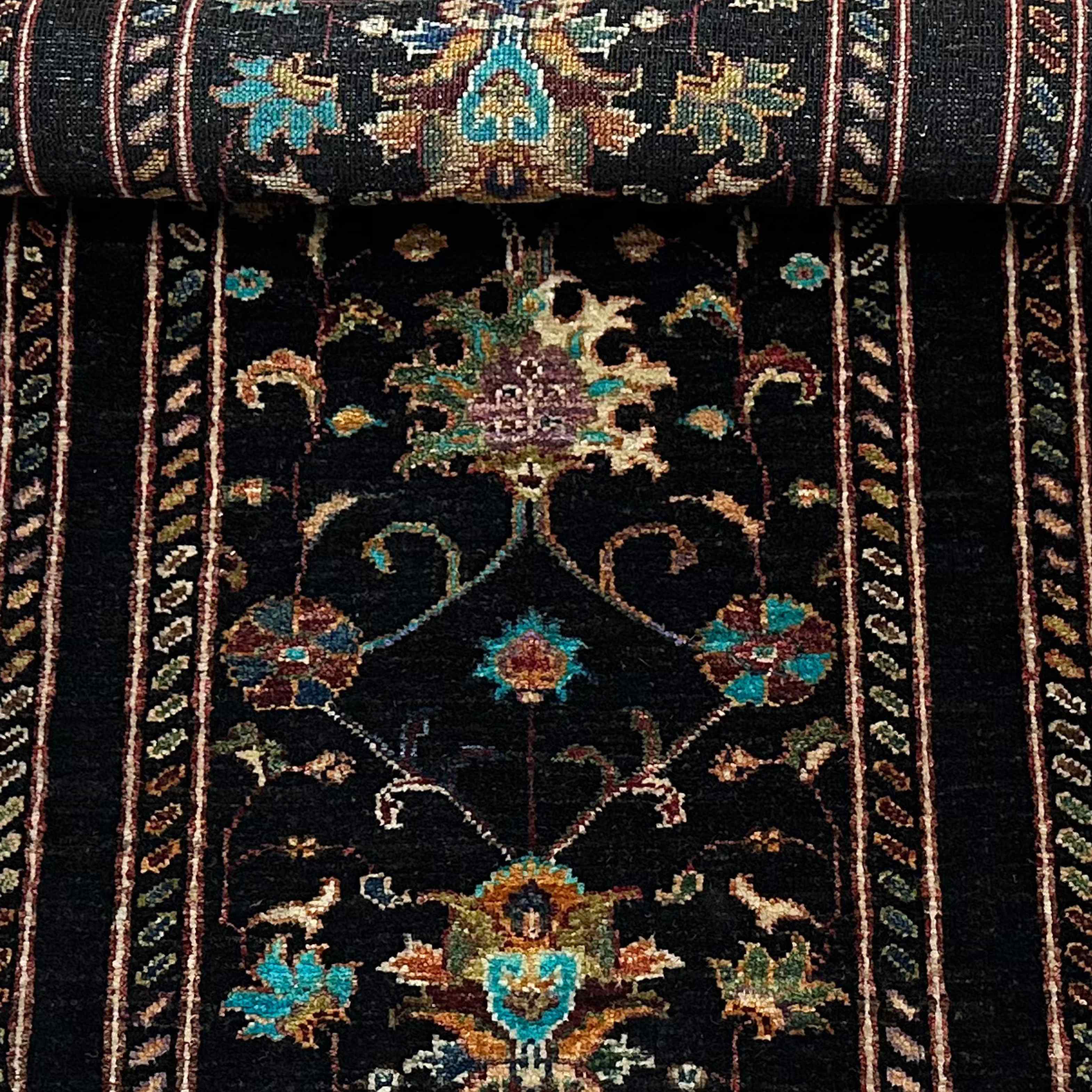 Made of hand-spun Ghazni wool, which was known as resilient yet soft enough to run its own length, it is both aesthetically and practically satisfying. It gains its deep black ground and flower-bright highlights through natural dyes; these natural dyes include indigo, walnut husk and pomegranate skin. The rug is fully chemical-free, sustainable, eco-friendly, and one that will mature gracefully over the course of decades.