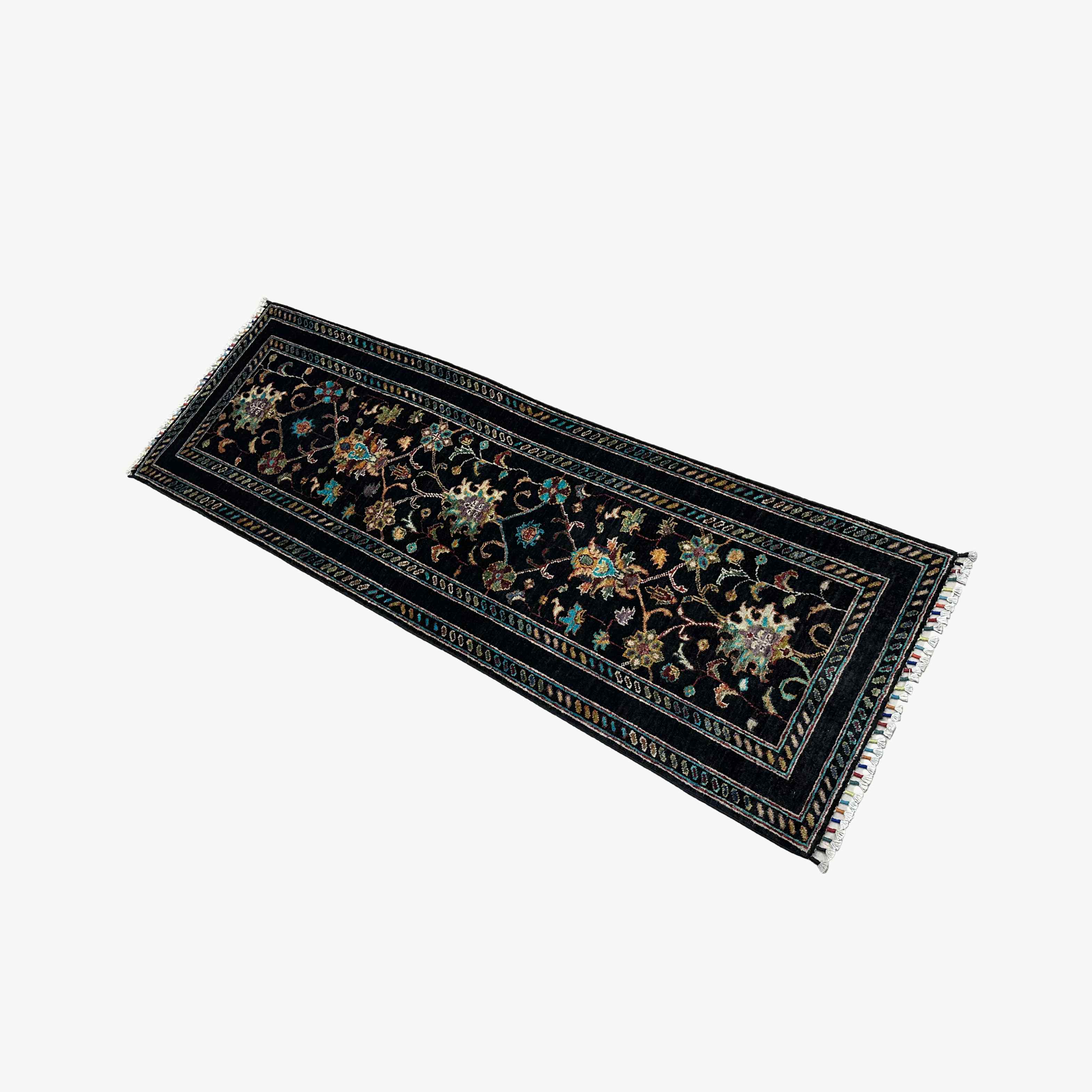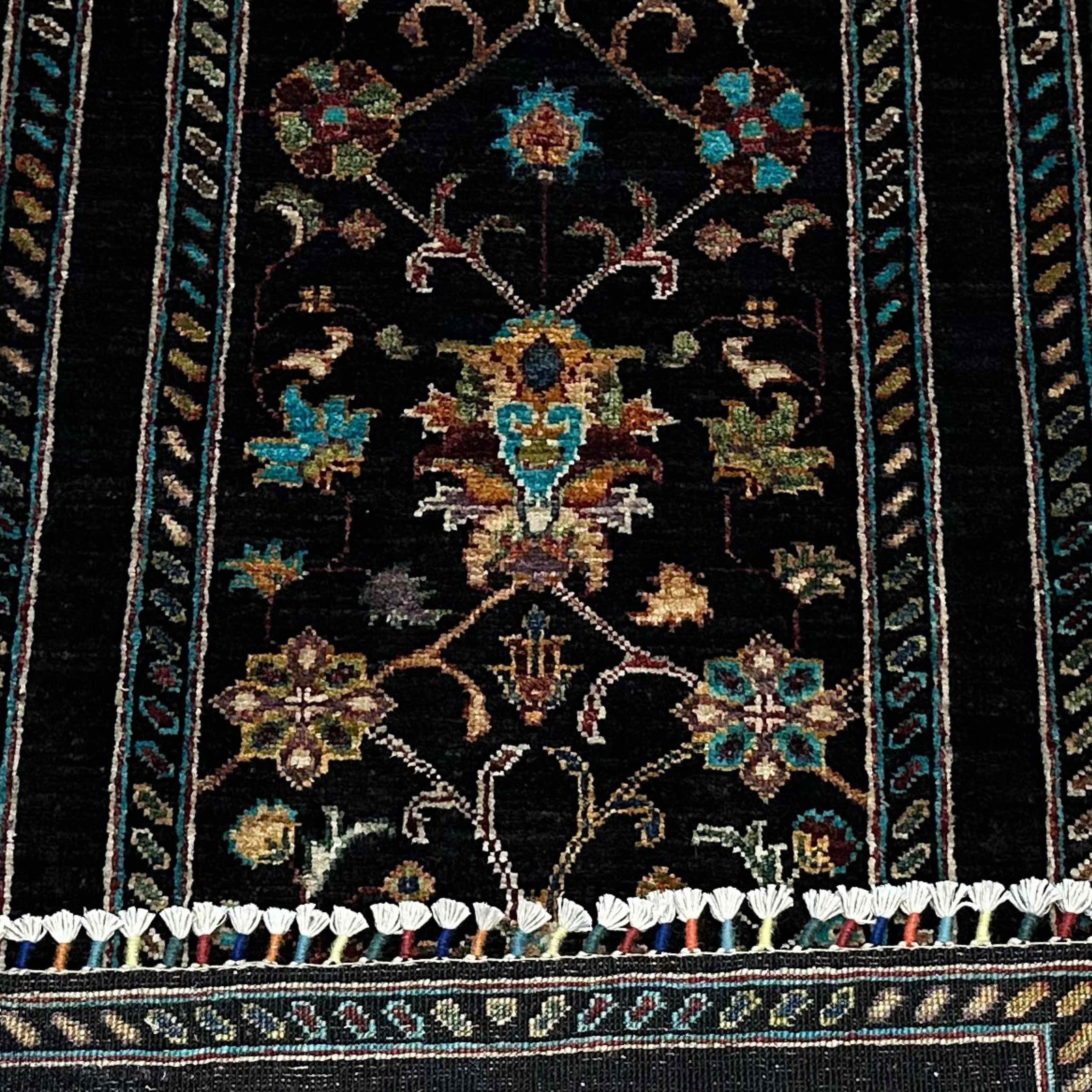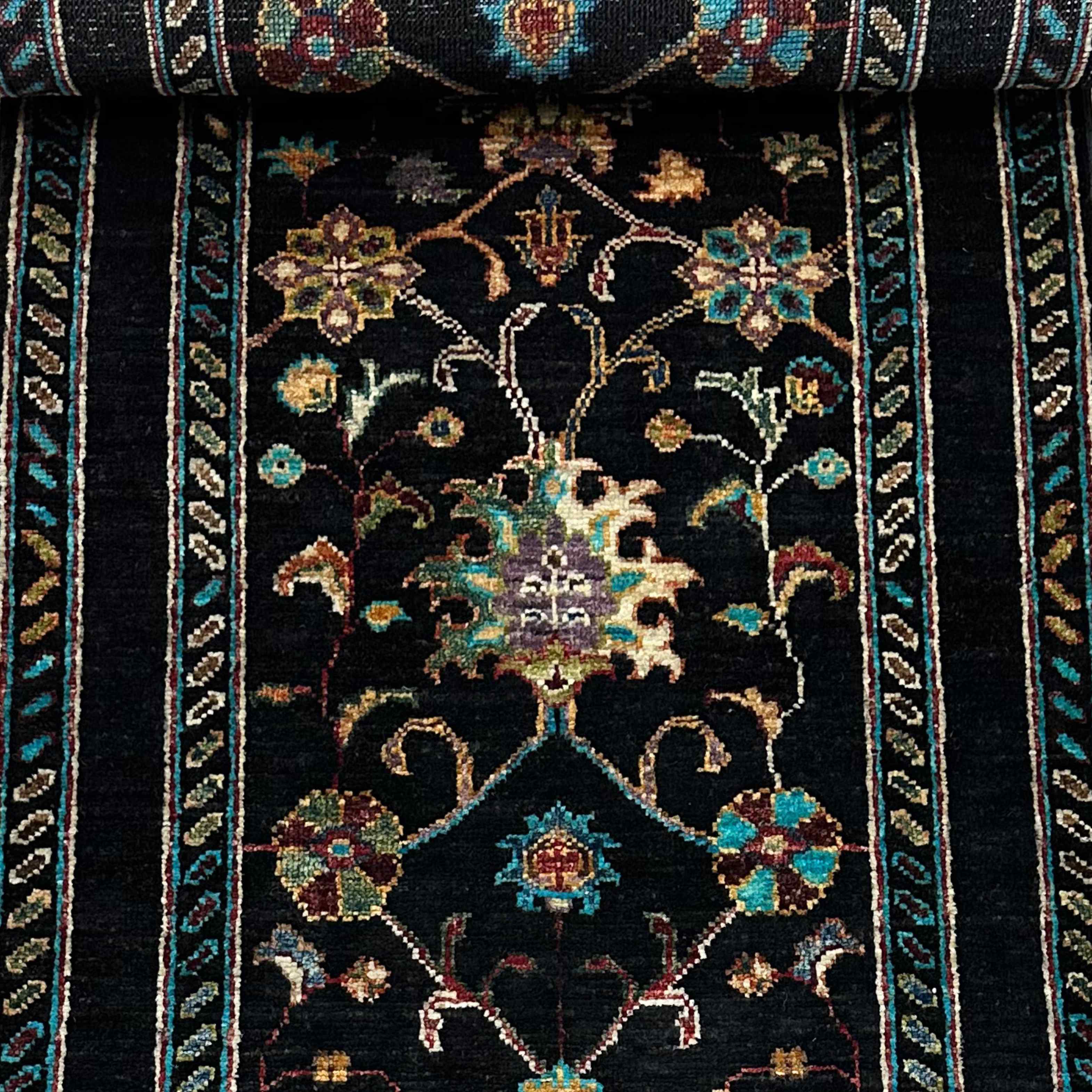 Lush floral bouquets, vine leaf motifs, and stylised tree motifs are on a midnight-black ground. The ornamental patterns of rhythmic rays of intricate borders on either side outline the field and give it harmony and balance. Turquoise, saffron, ivory and rose highlights make it energetic, and it will suit a narrow interior (running into a runner) well.