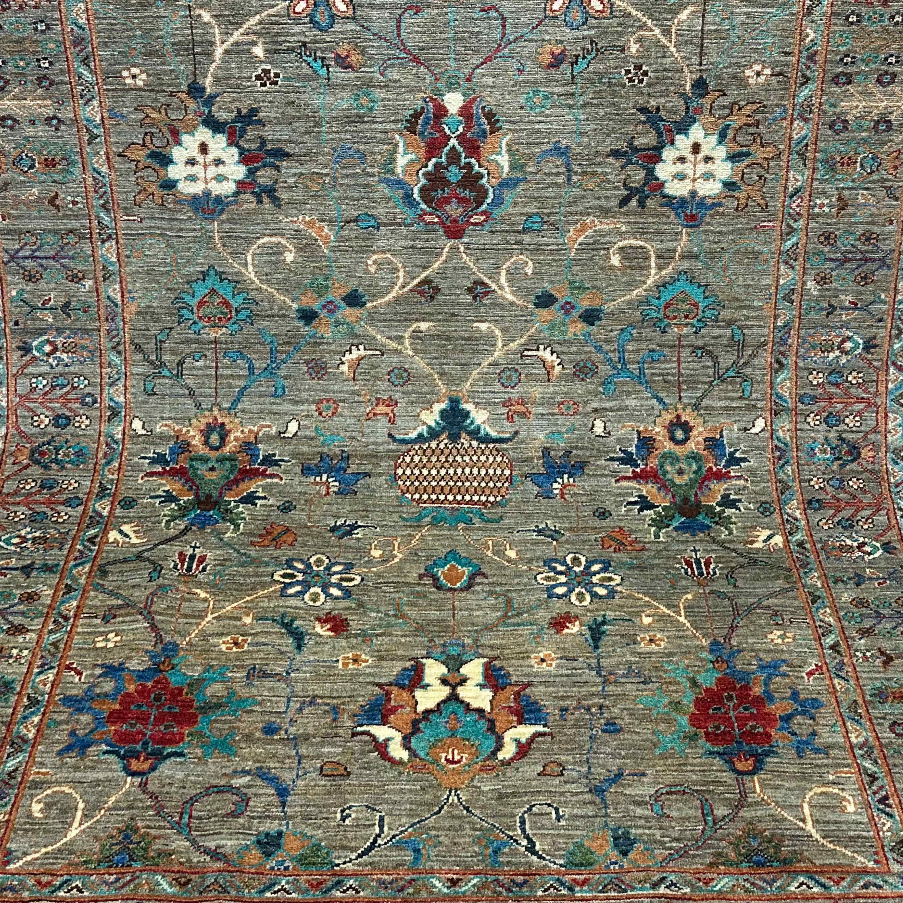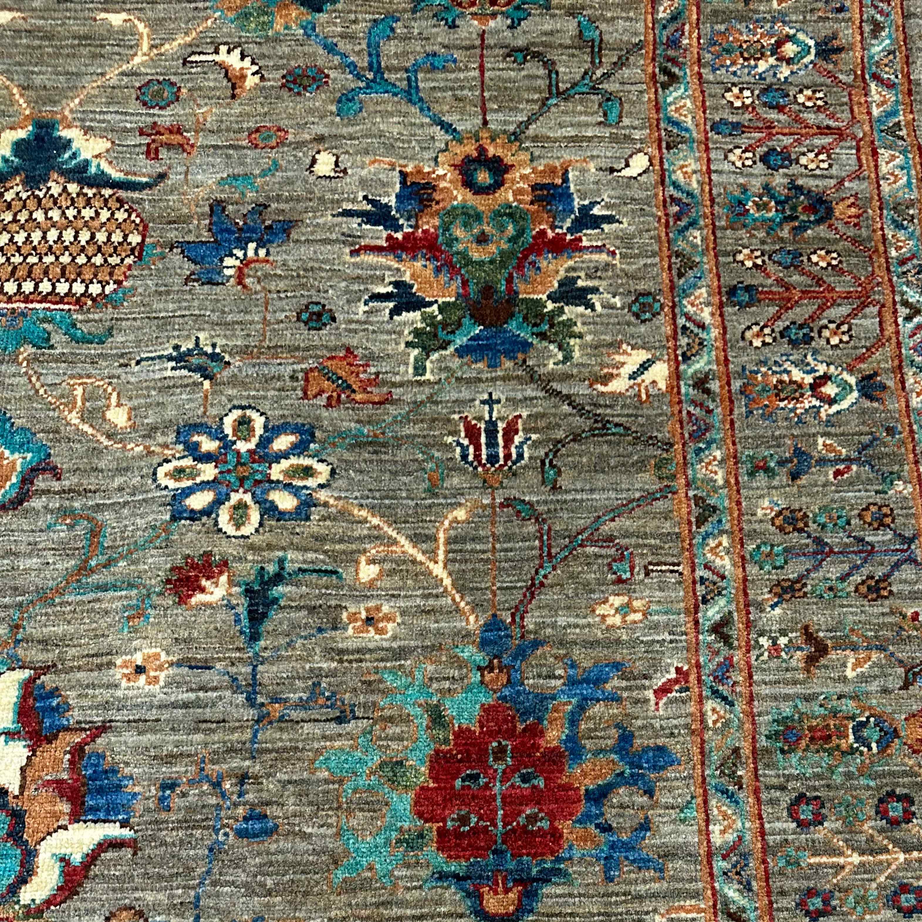 Sultani tradition of weaving is based on classic Persian gardens- a symbol of eternal spring and heavenly beauty. Palmettes and vines represent prosperity, and the lattice of flowers reminisces about the eternal serenity of cultivated gardens. This carpet preserves that tradition and brings the tradition of centuries of design and decoration into 21st-century homes, infusing cultural elegance and symbolic design into homes.