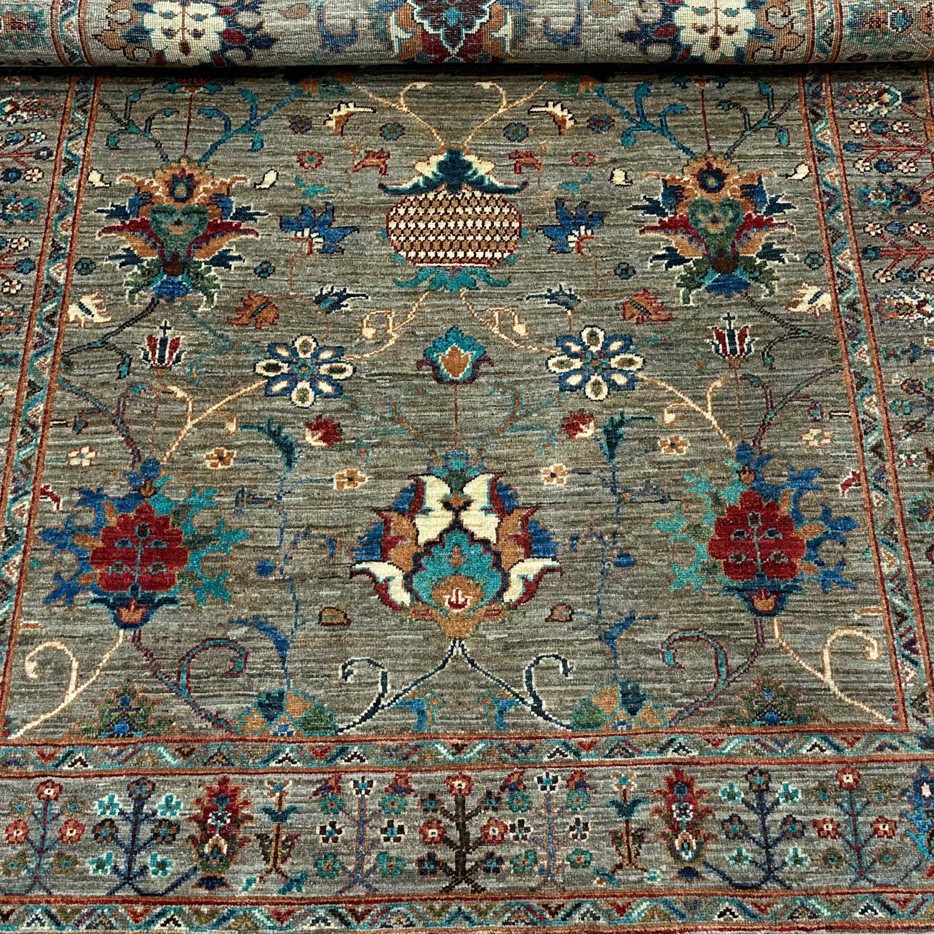 The main field consists of the elegant framework of climbing plants, interspersed with flowering palmetto and abstract flowers. Turquoise and crimson touches are left like jewels on the pale grey ground, and the composition has a framing layer of scroll-like flowers. Symmetrical and rhythmic balance create this rug's royal but calm gracefulness.