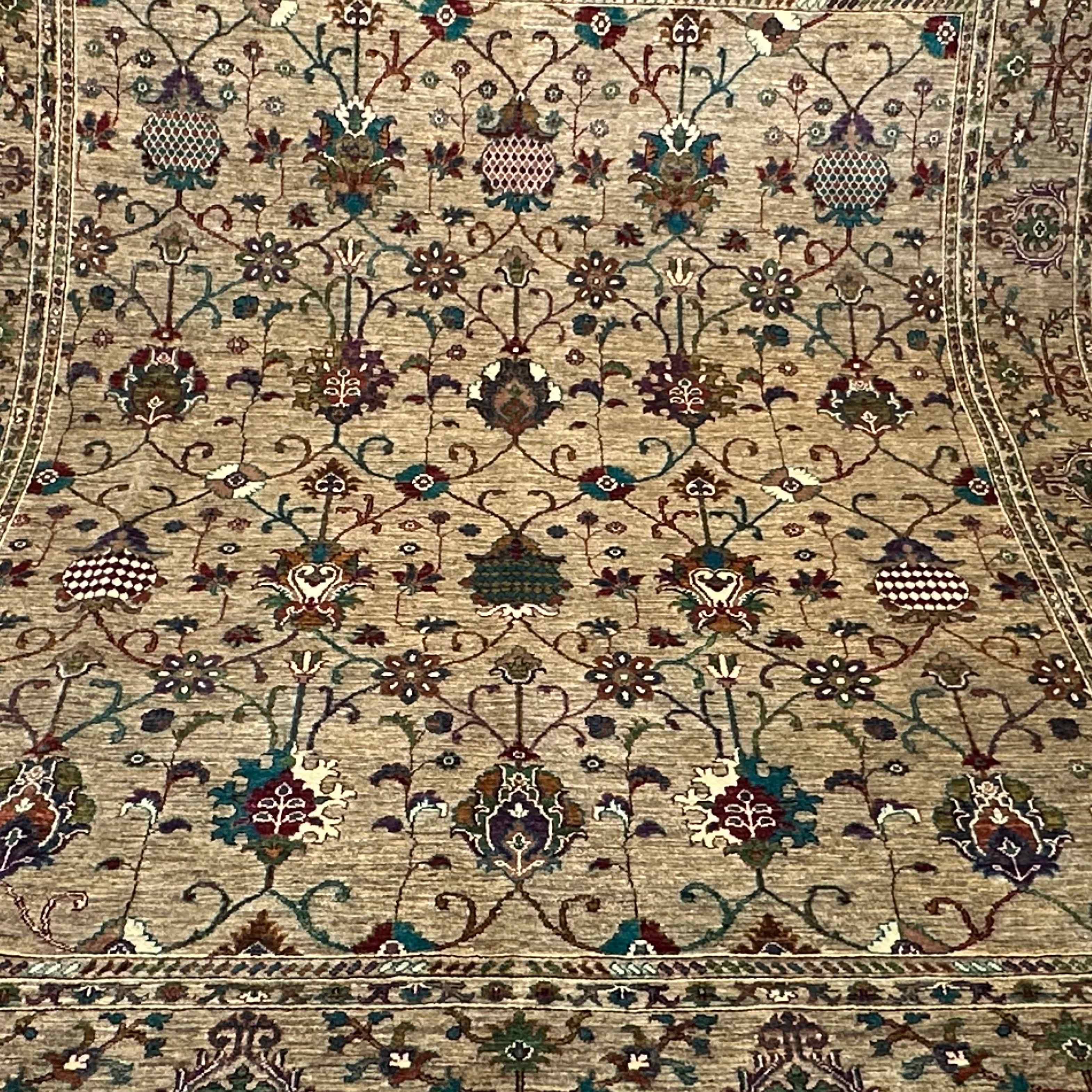 Beige sand ground is highly patterned with jewel-toned florals in emerald, ruby, ivory, and navy interwoven with scrolling vines and medallion blossoms. The design has a variety of borders describing the composition, as much as structure and flow are balanced. Its fine balance and organic allure make it a high couture unit on traditional setups.