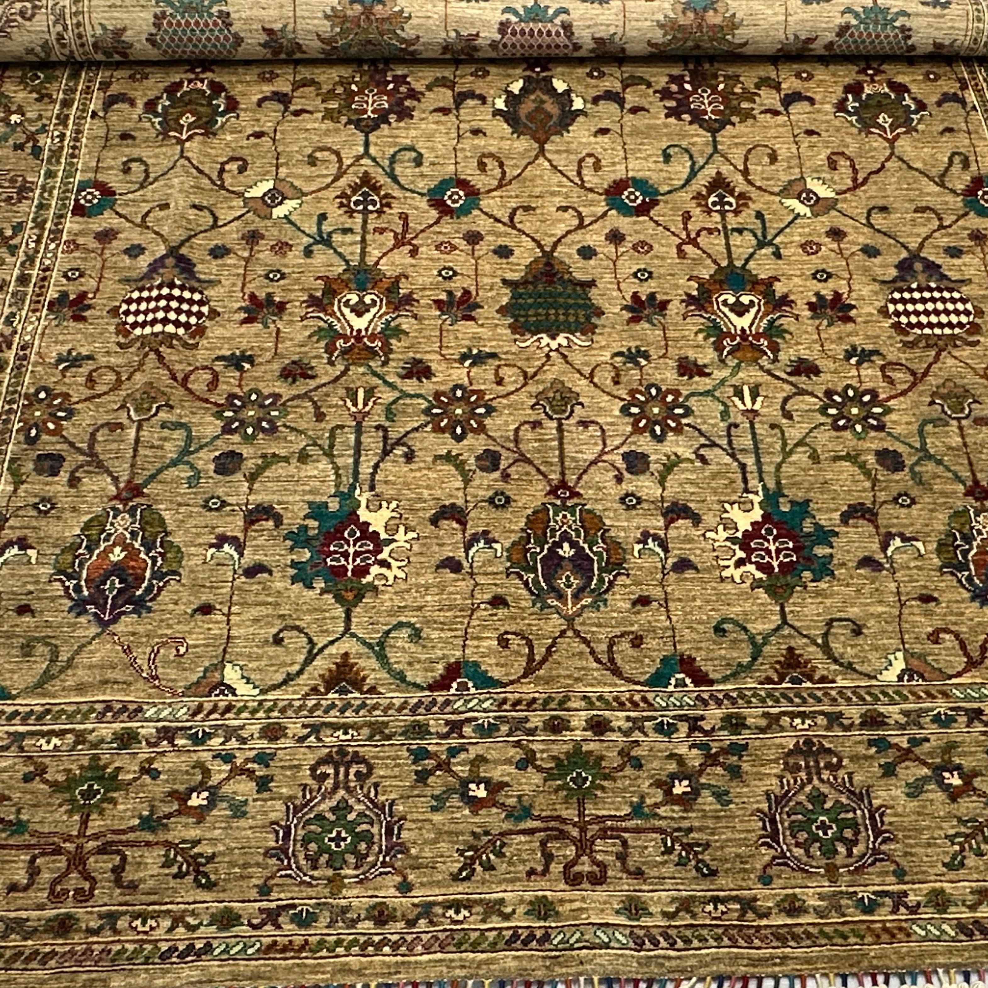 Expert Afghan weavers knot each with precision so that rug density is high and the detail exceptional. Strong edges and hand-edged fringe boost the strength and originality. The even wool pile provides resiliency and underfoot comfort. The backside exposes superb weaving- and this is a true sign of collectable/heirloom quality craftsmanship of at least internationally collectable quality.