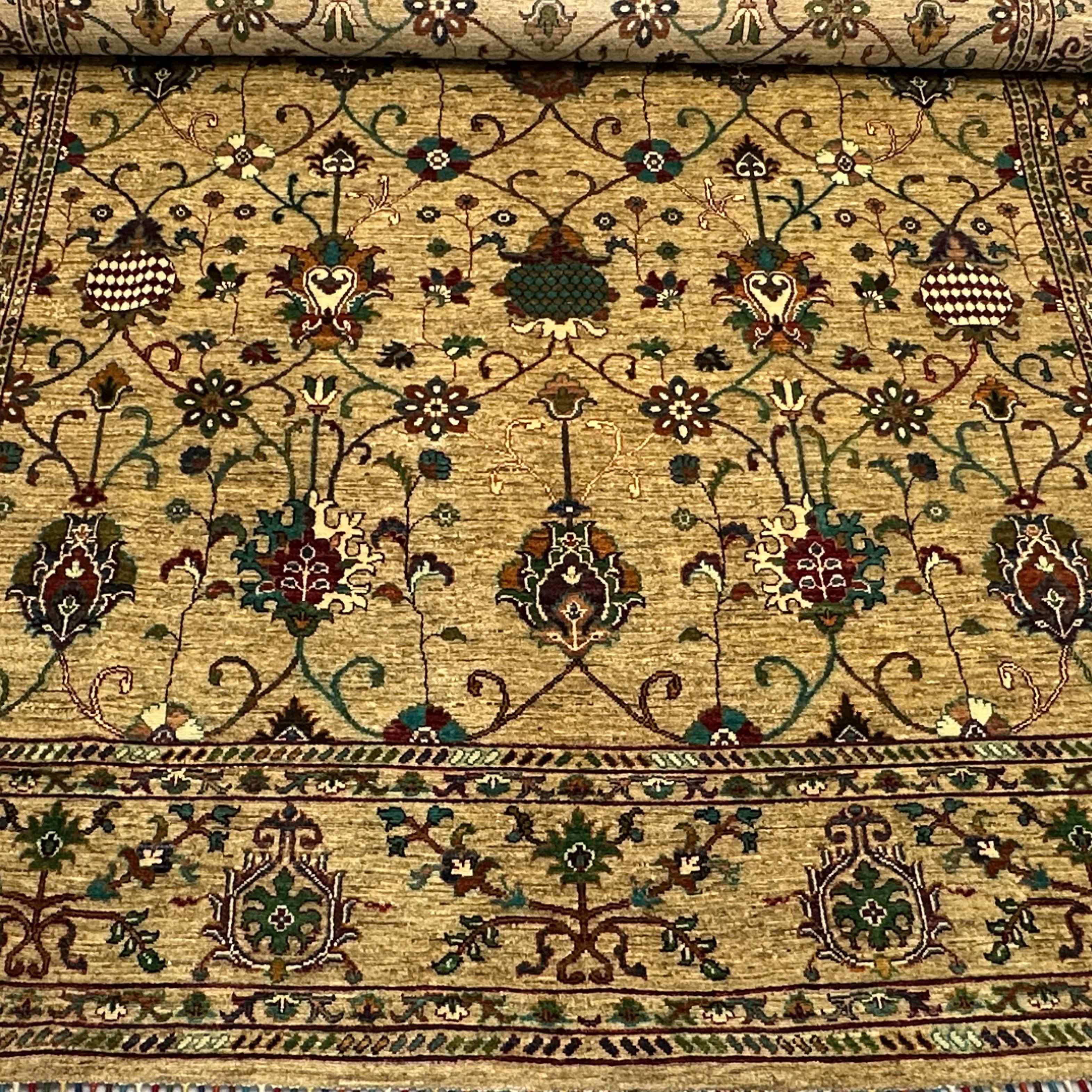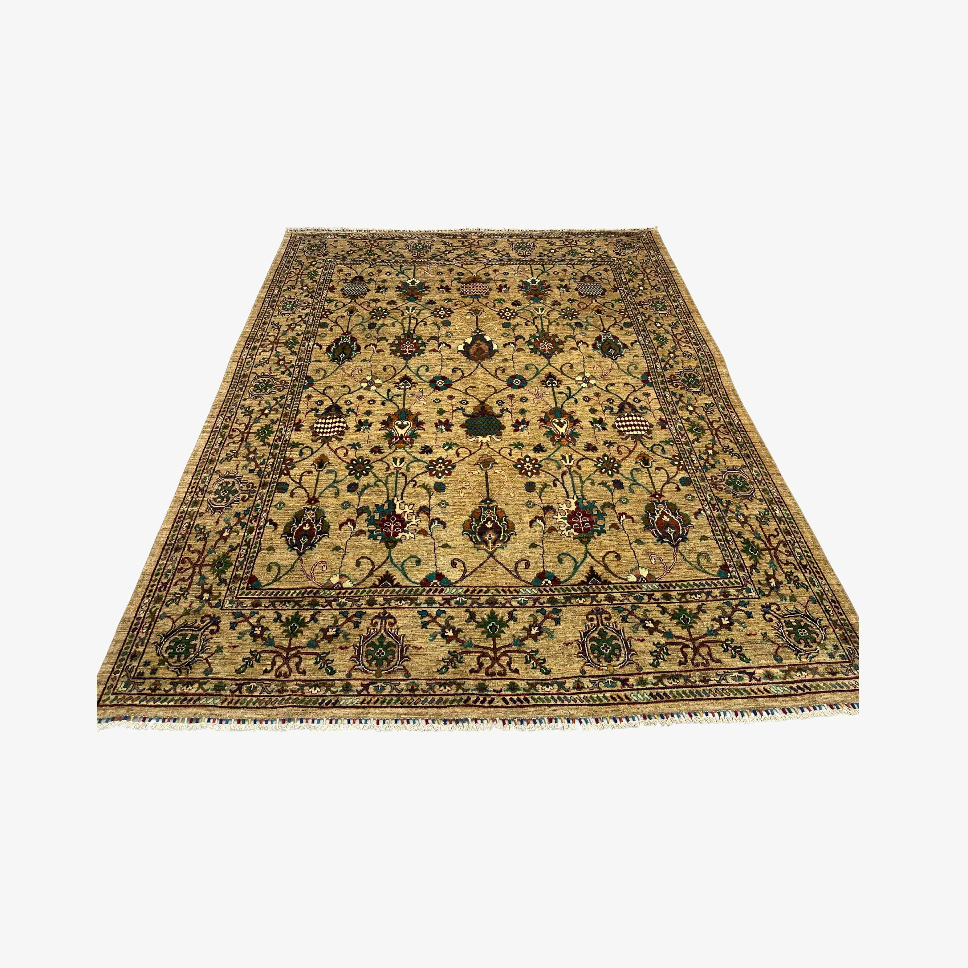 All its details are hand-knotted by Afghan craftsmen in the most thorough manner. There is dense knot density, which provides clarity of floral motifs with reinforced selvedges and strong fringes. The reverse has regular workmanship, which is the seal of competency and genuineness-it is therefore, not only an ornamental but also an imperishable heirloom rug.