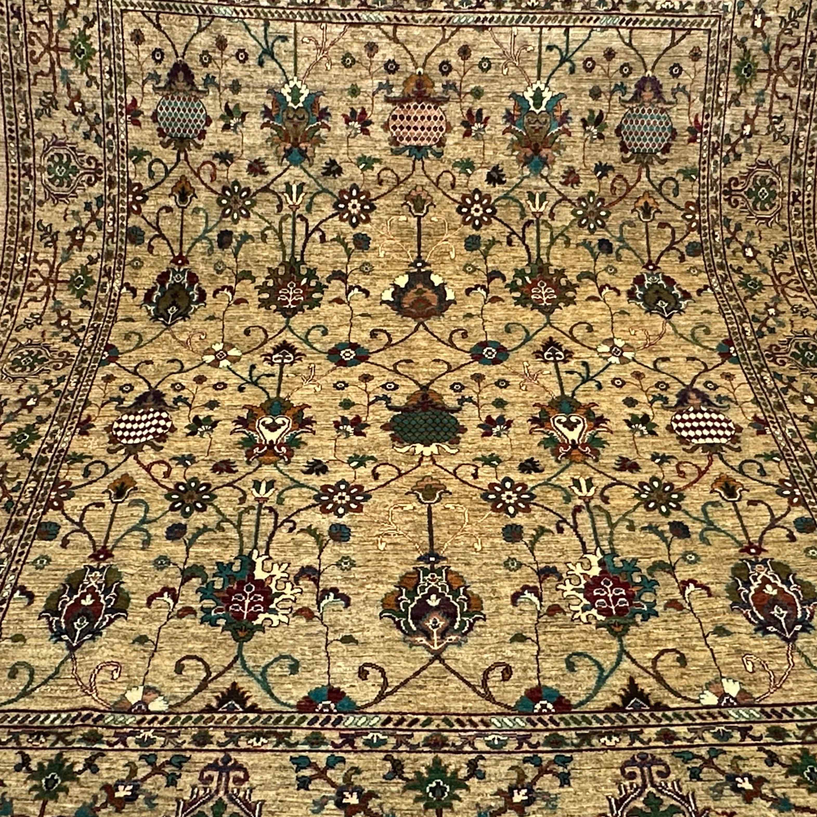 This rug is woven of 100% handspun Ghazni wool, which is known to have rich lustre and durability and is made to be strong yet soft. The natural dyes with walnut husk, madder root and pomegranate make sure that the appearance is permanent. It also grows patina in its wool pile and is eco-friendly, biodegradable and also has longevity in its composition and character.