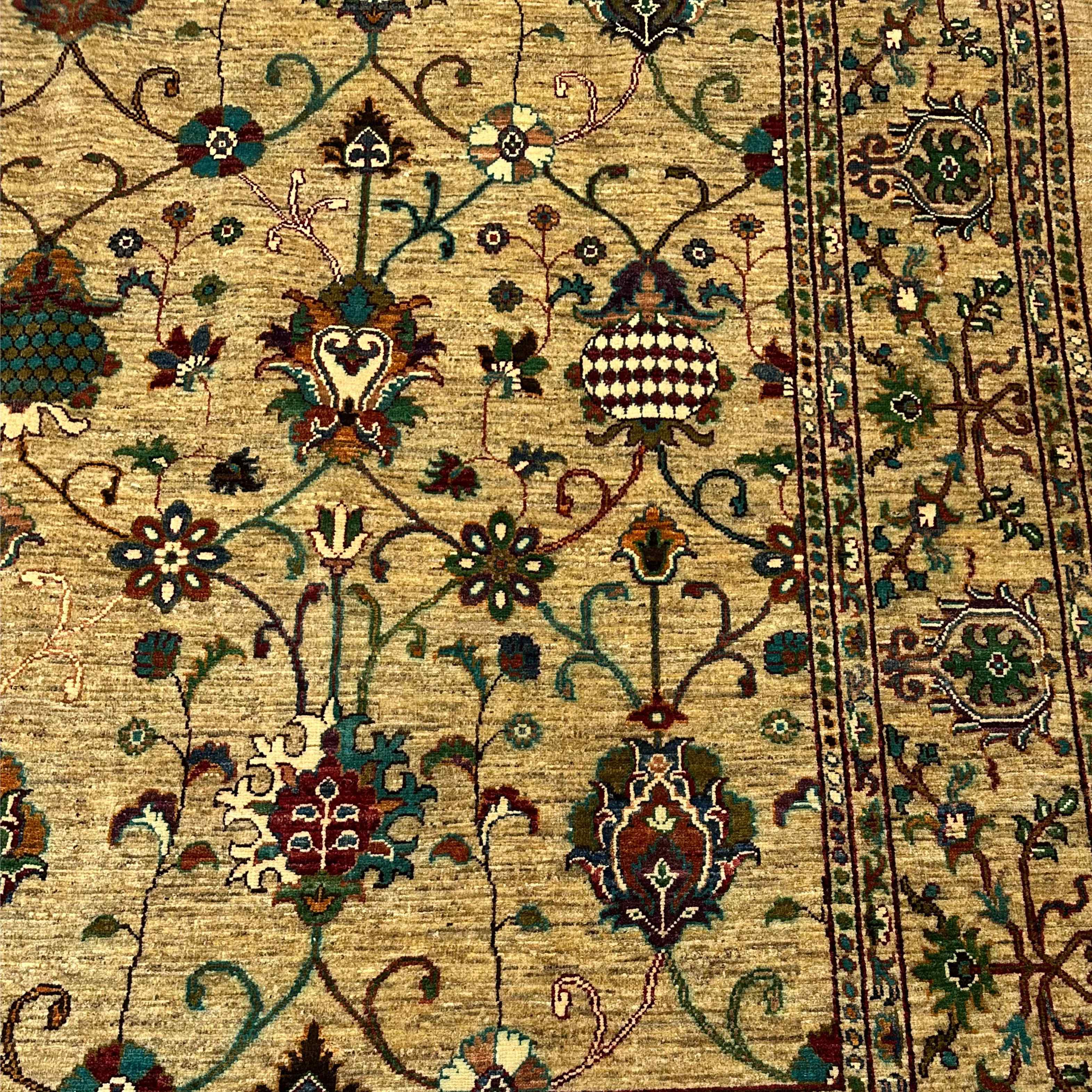 On a golden beige ground, this carpet exhibits the finely-wrought sprays of flowers, lattice vines and the repeated medallions in ruby, emerald, ivory, and deep brown. The field is framed by a sequence of layered vine-scroll borders, giving greater symmetry. Blending a sophisticated balance and soft colour palette, it becomes a focal point of classic sophistication.