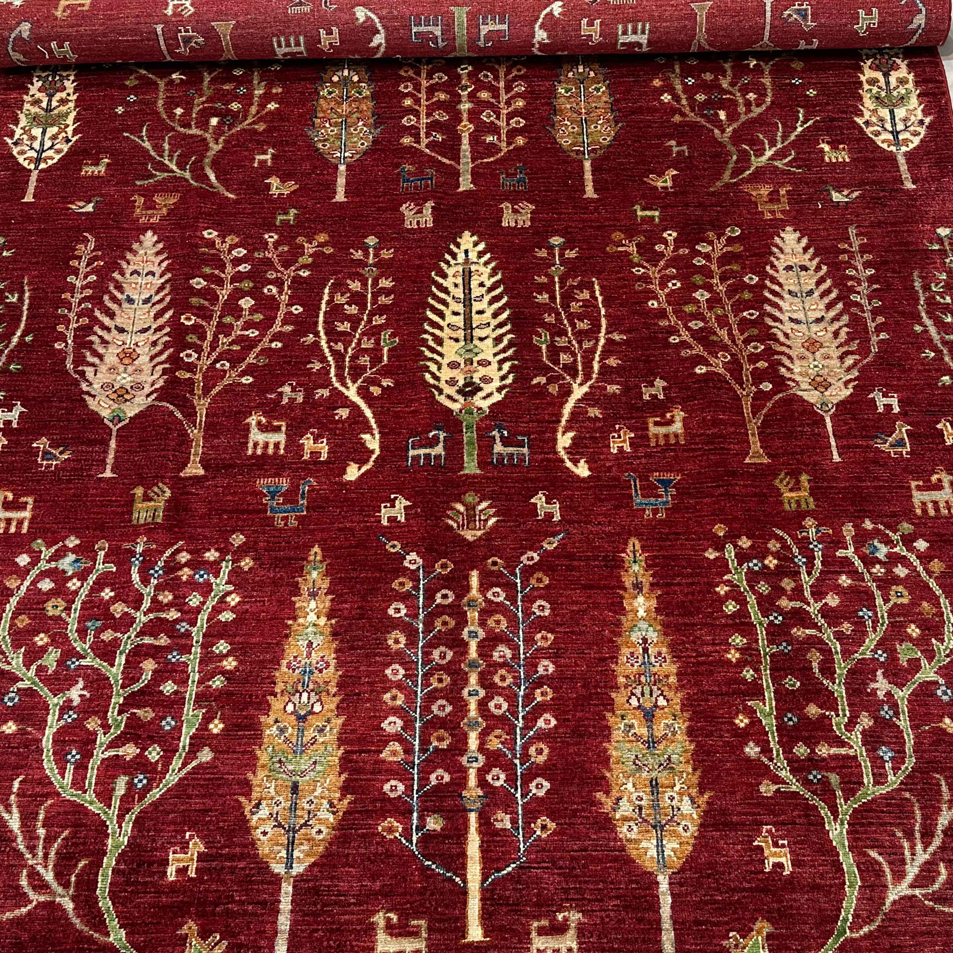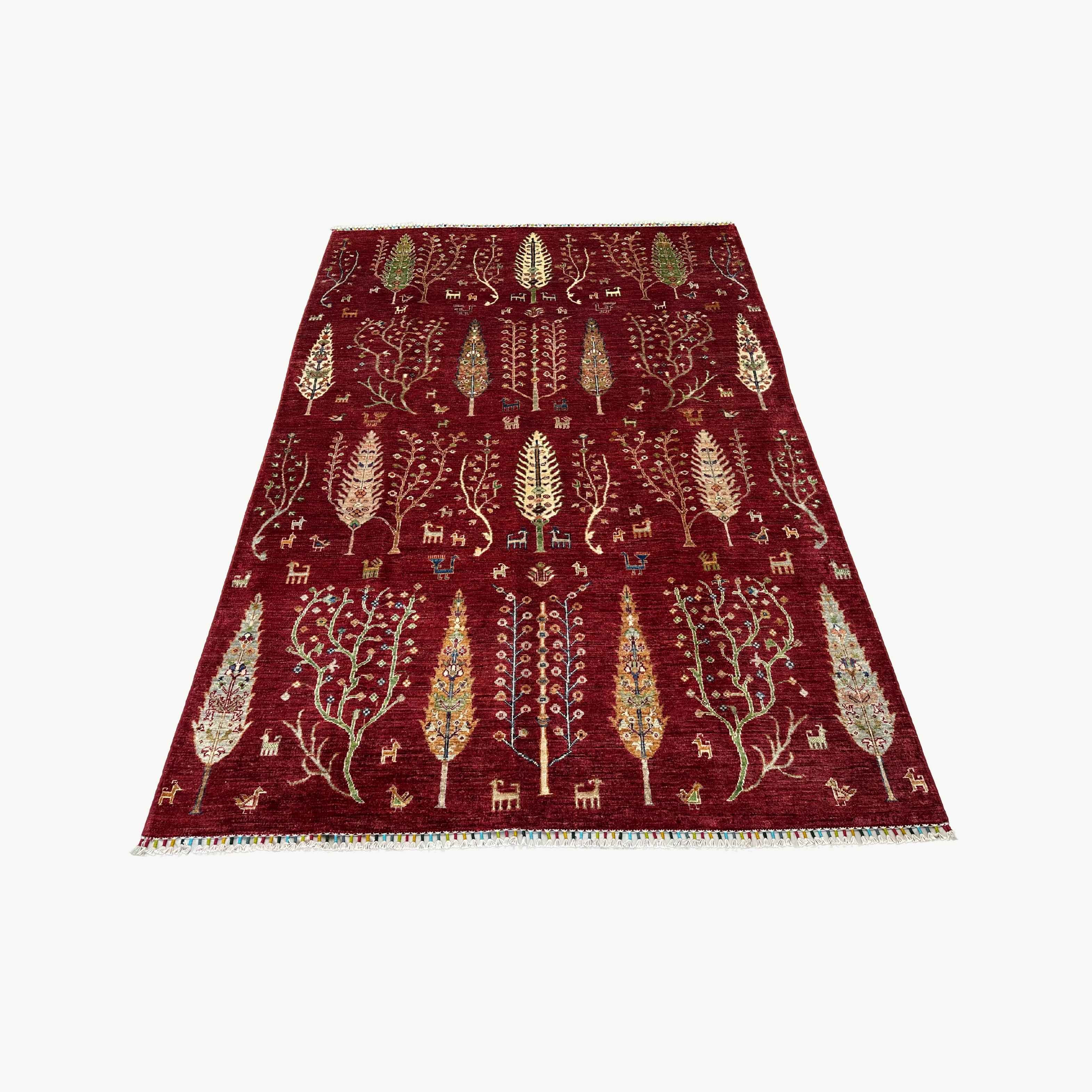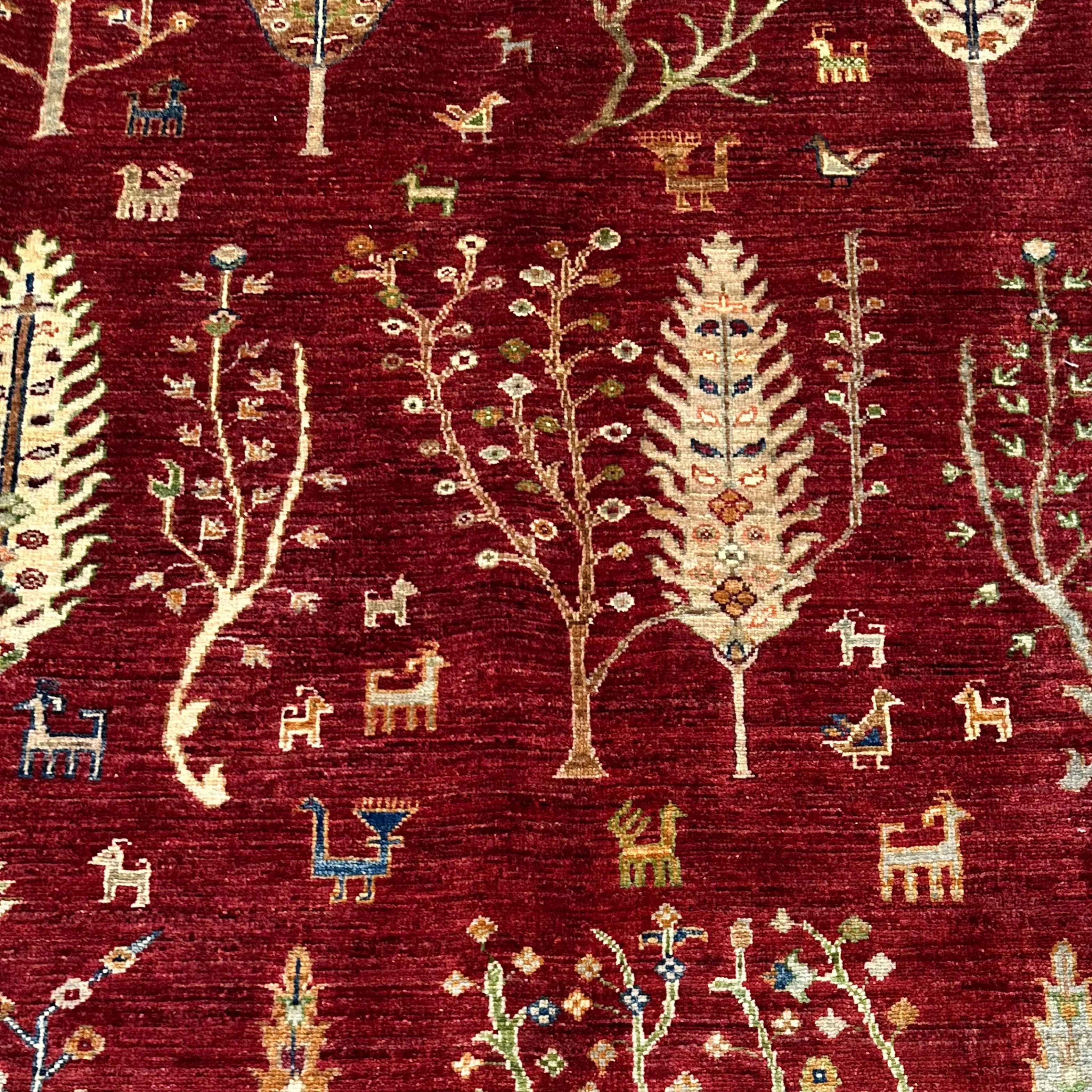 The rug has a strong crimson background that is filled with graphic animals: symbolising growth and transformation, the Tree of Life. The stylised trees emerge elegantly with some small animals and birds surrounding them, which portrays harmony between man and nature. The design has highlights with golden, ivory and emerald to bring out the colour in that design, and the combination of balanced symmetrical design brings a serene and majestic aspect to that design.