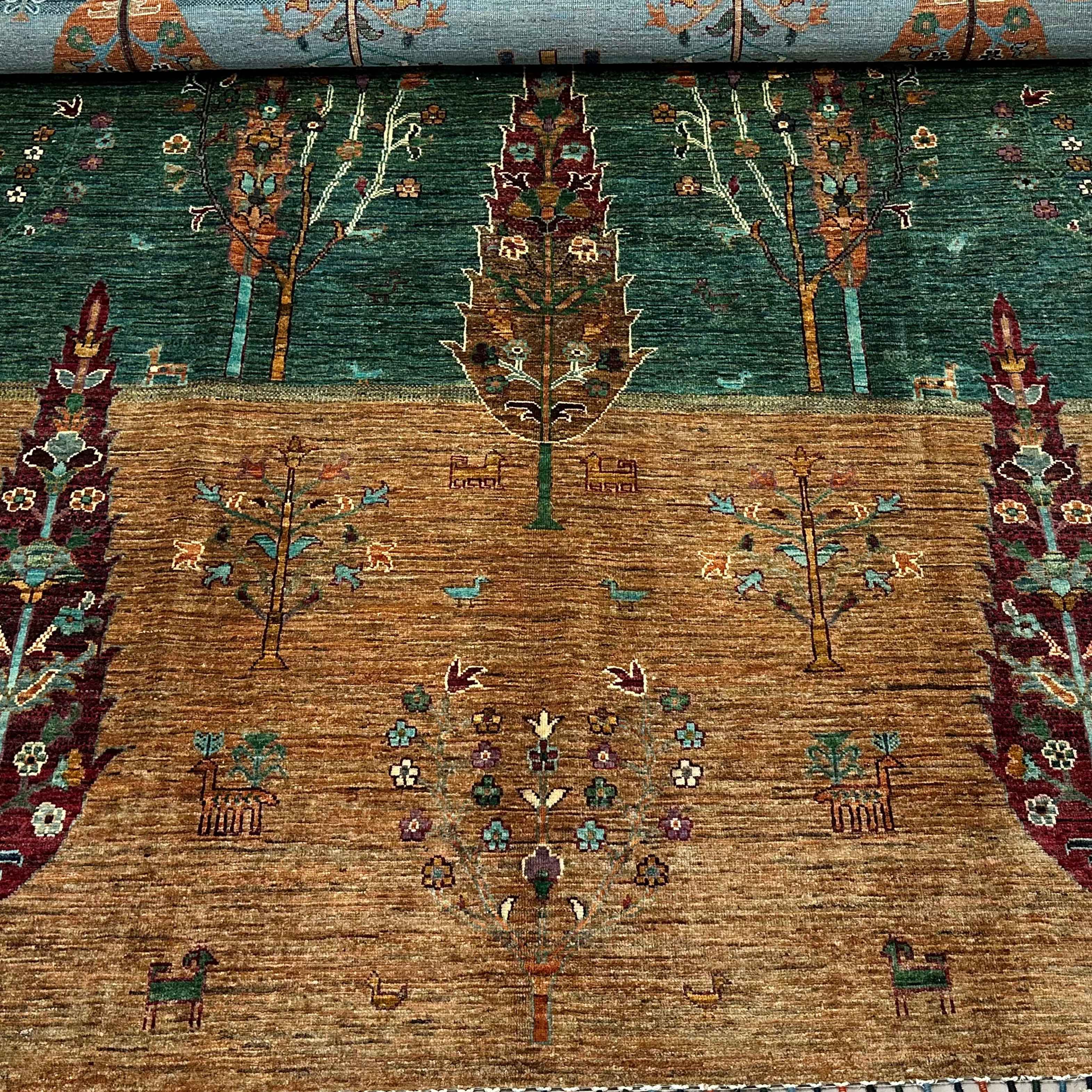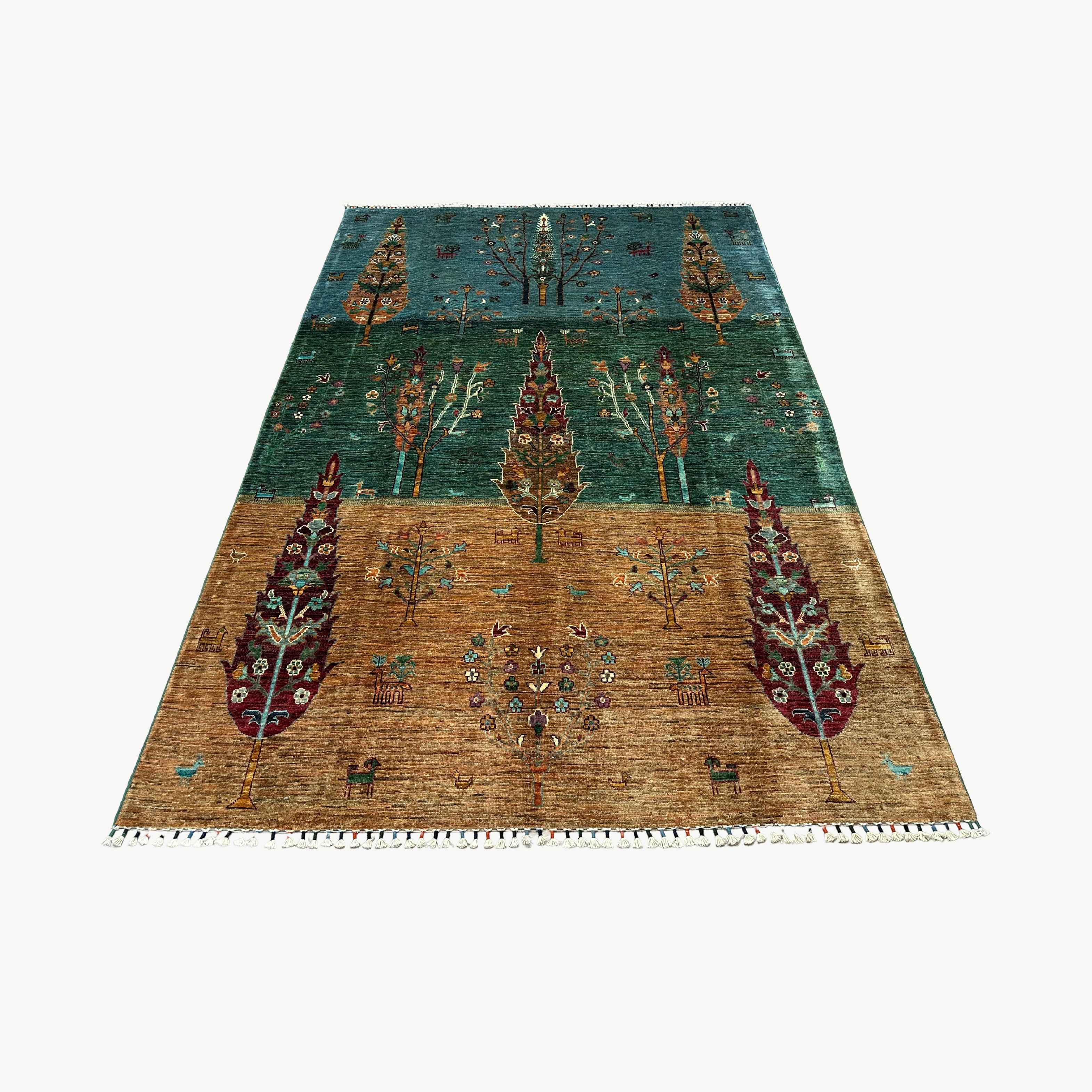 This Tree of Life rug is handwoven in the art. You can therefore easily tell that it is handwoven in the artisanal looms of Northern Afghanistan. This is the tradition of Gabbeh, according to which the motives are the stories. Its art mixes the symbolism of culture and the pastoral setting where there are deer, goats, and birds living alongside luscious trees. A millennium of tradition in knots connects the knots to a timeless work of textile art.