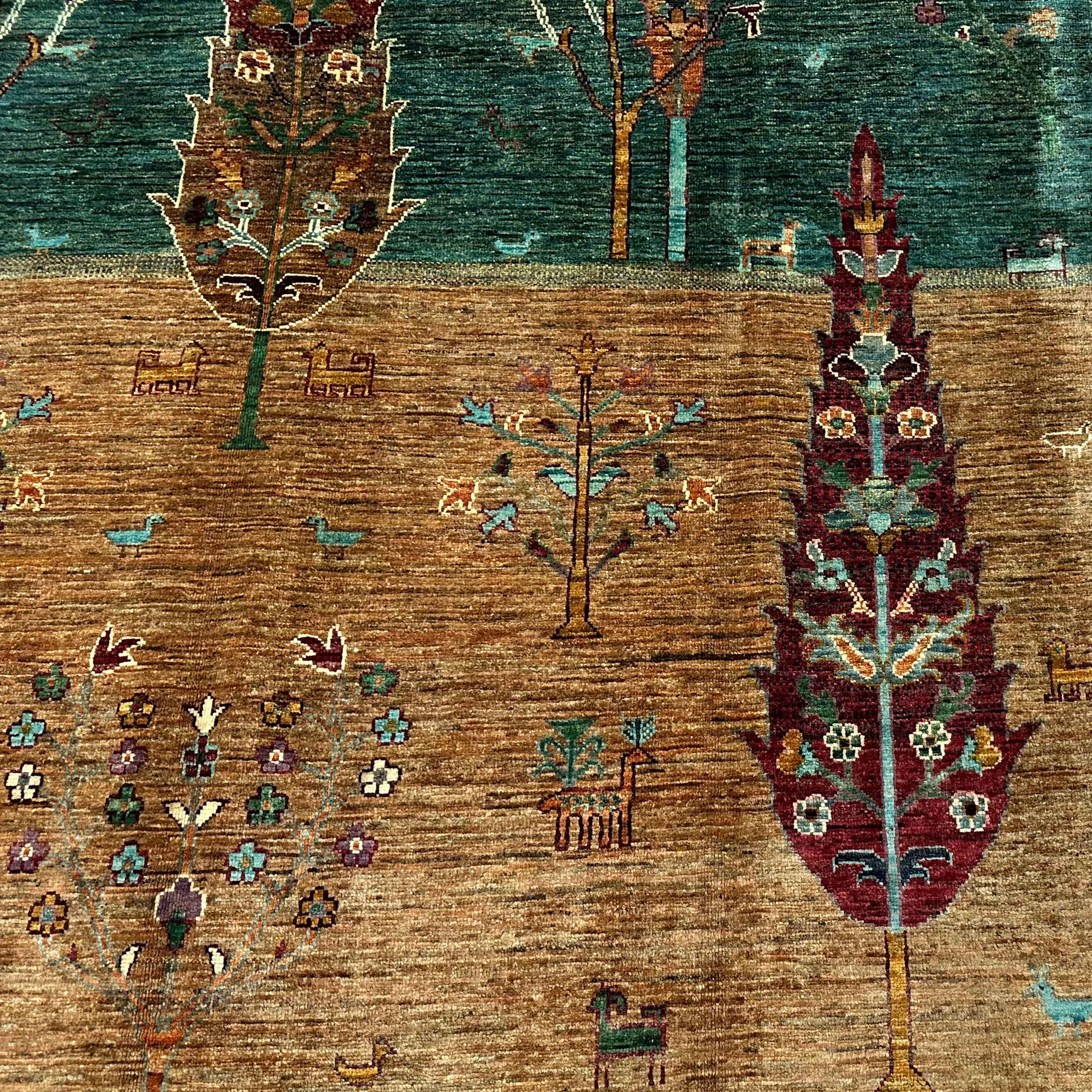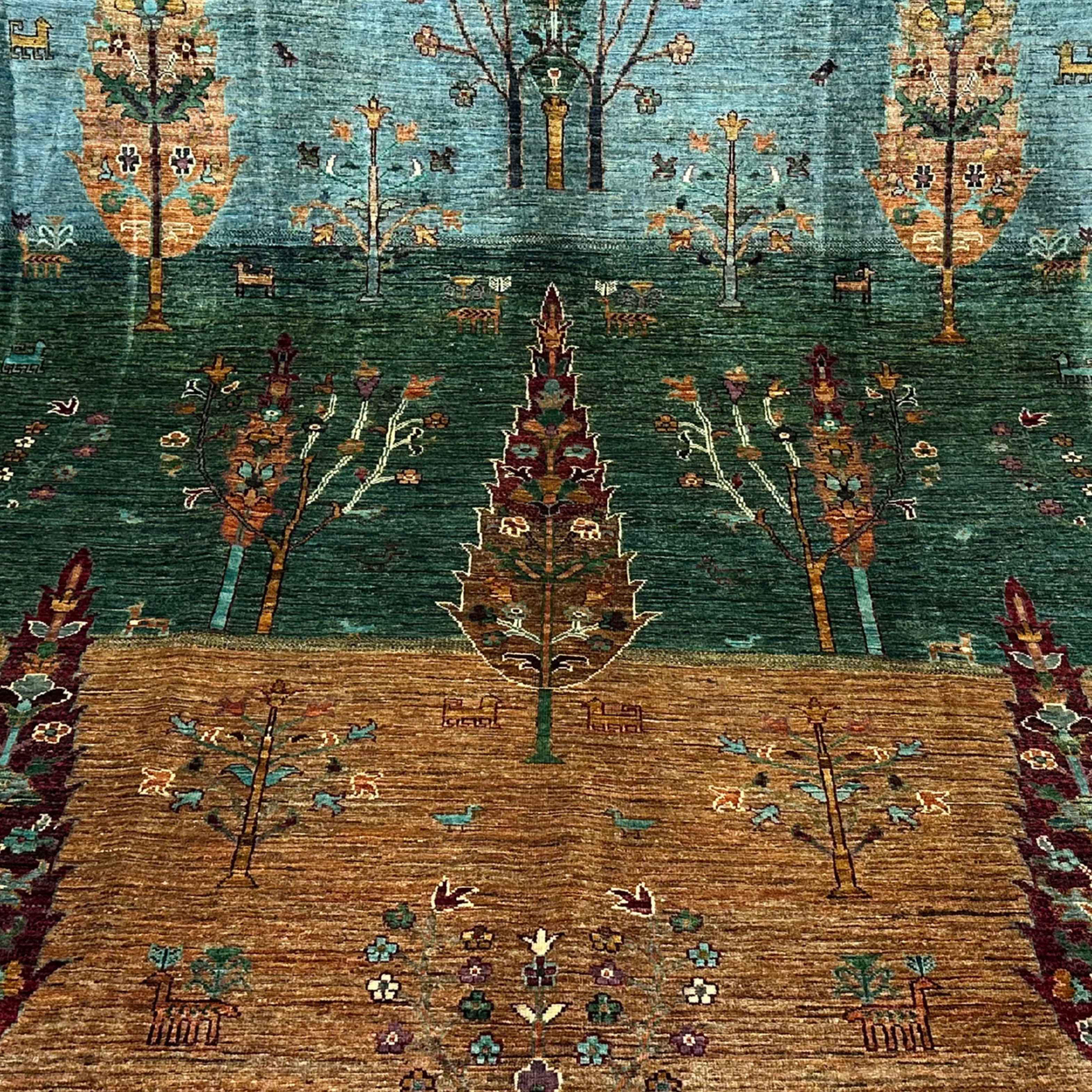 The field of rug is divided, with earth brown hue on the downside, the symbol of land and green colour on top, both of growth and renewal. The proud cypress and flowering trees are stylised, and the miniature animals and birds fill the frame. The stratified symbolism reflects this compatibility with earth and sky and makes a successful blend of geometrical patterns with nature, producing a highly balanced, almost soulful aesthetic.