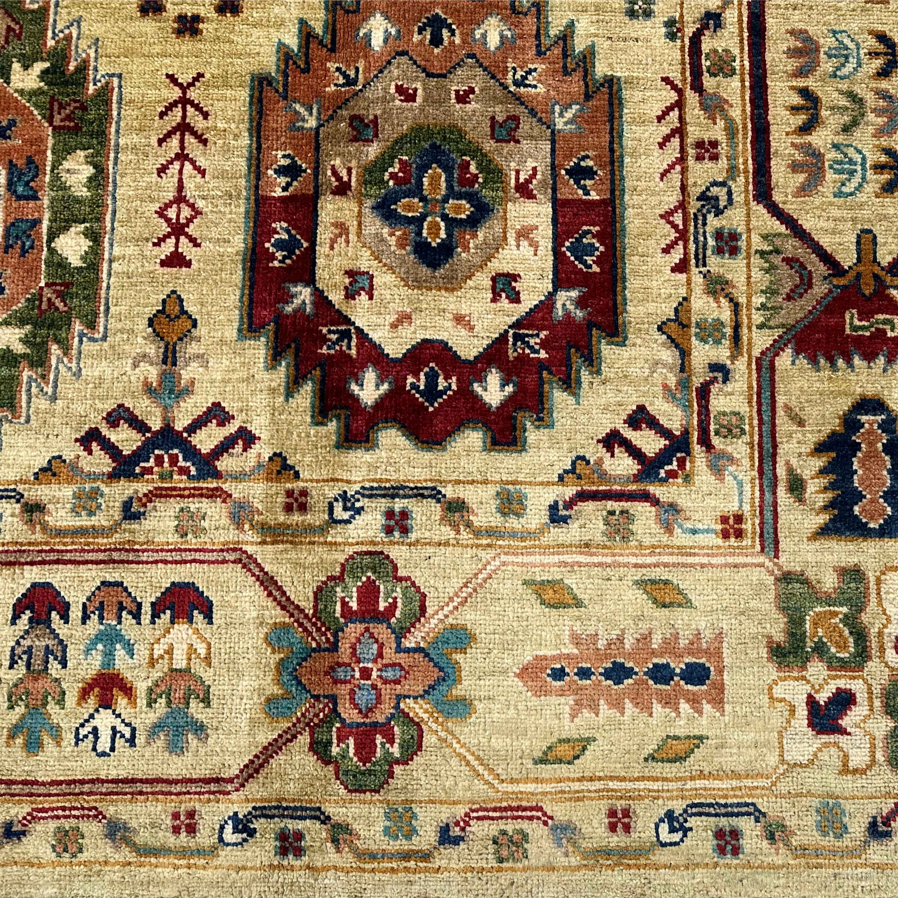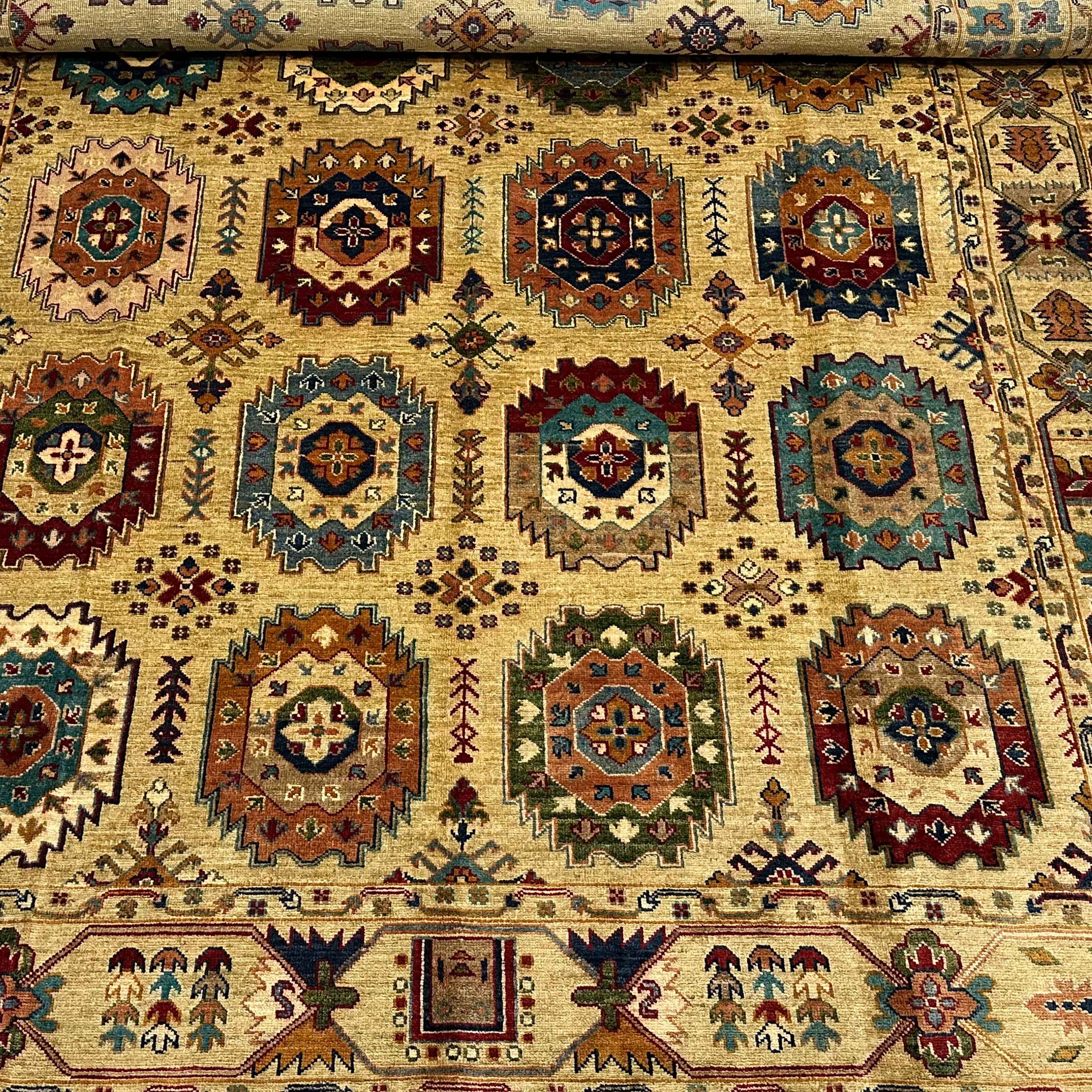Within the golden sand ground, it has a grid of octagonal emerald, navy, rust, and ivory medallions with angular tribal borders. Details of small arrow and flower anti-images are put in negative spaces, because they represent movement and vitality. The organised and dynamic form represents the Waziri aesthetics, putting the emphasis on order and rhythmic assertiveness.
